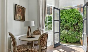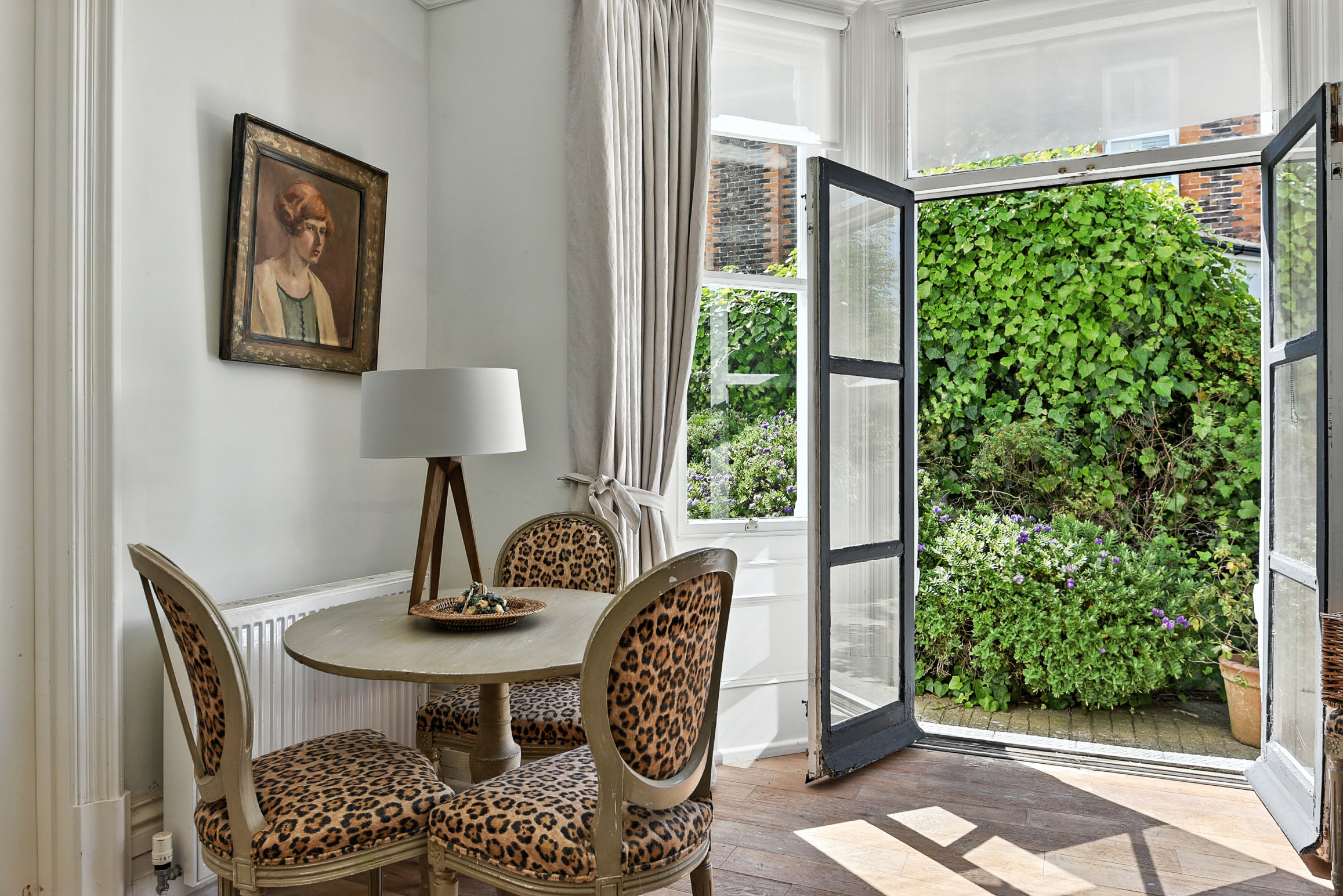 Second reception room/informal dining room with marble fireplace with coal fire. Direct access to the patio and garden.