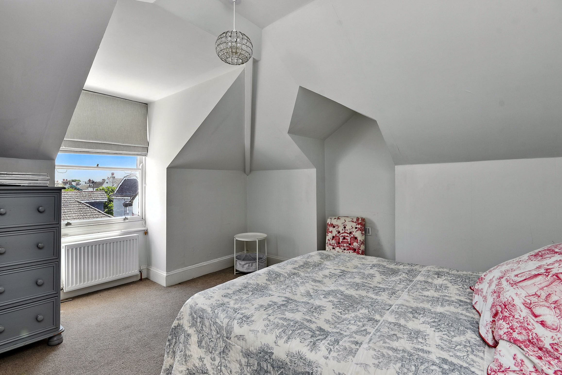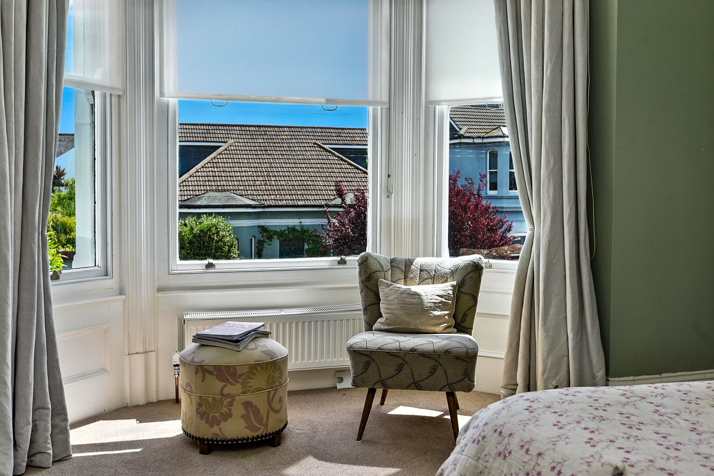 A large bedroom with a generous window seat overlooking the back garden.