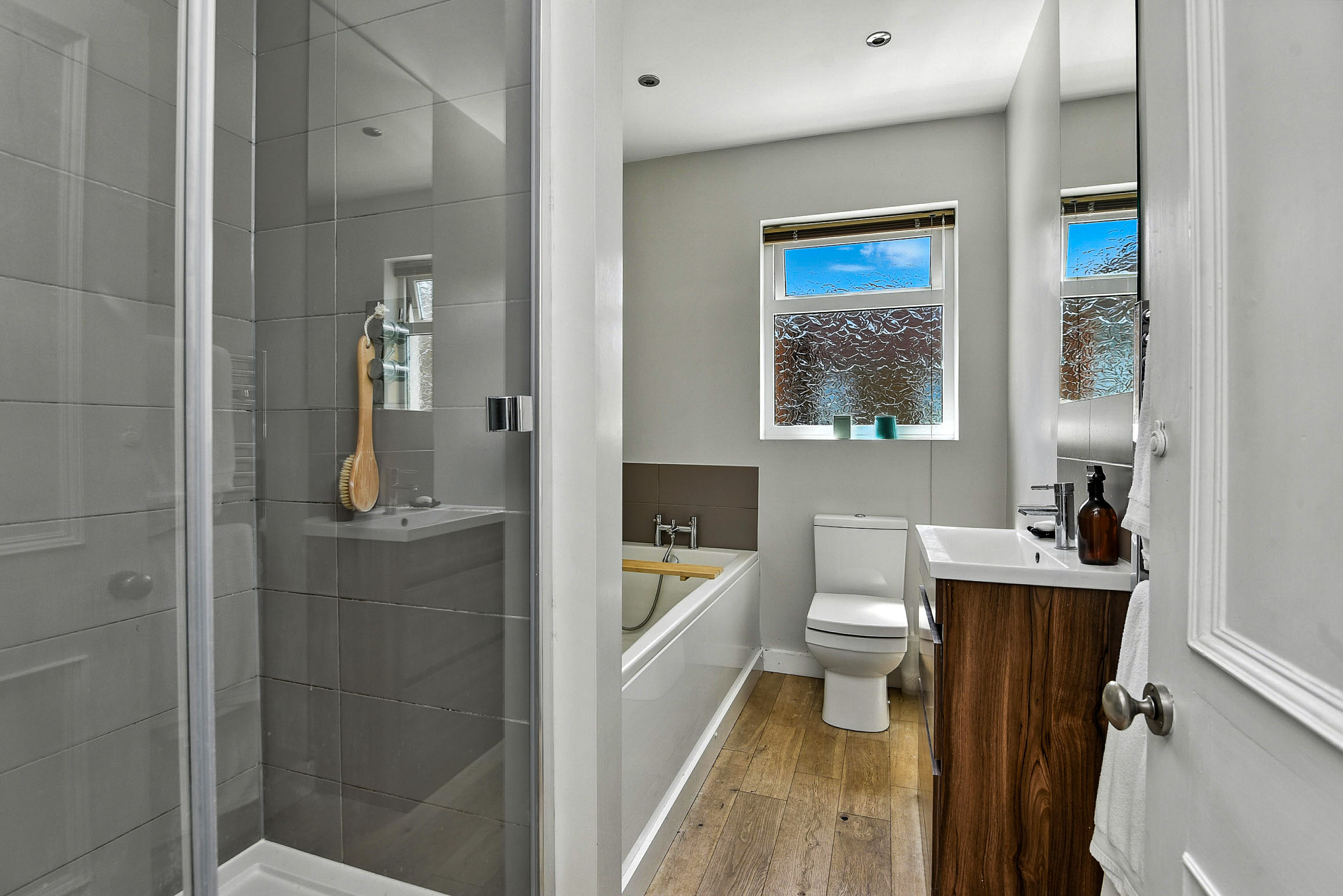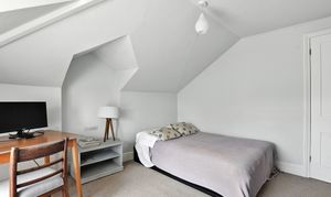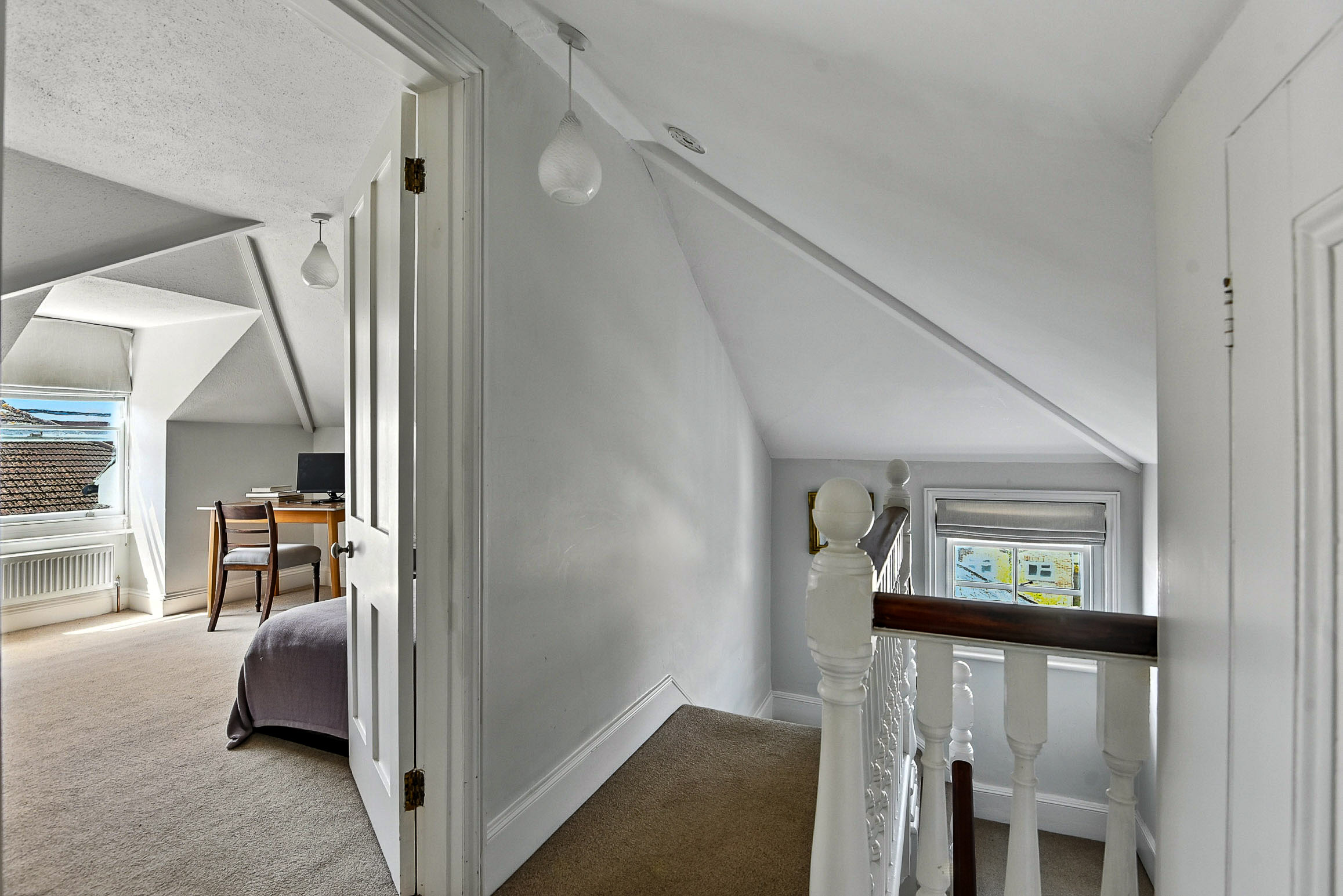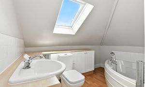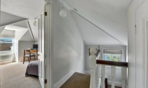 On the top floor of this home is a landing with deep built-in cupboards, and two further bedrooms with unique features, one of which includes an en-suite with a large corner bath and Velux window.