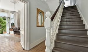 Wide, original staircase and hallway leading towards the kitchen diner.
