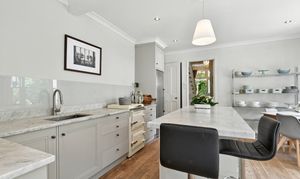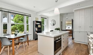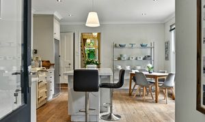Continuing along the wide hallway towards the back of the property you enter the kitchen dining room. This space offers a bright hub of the home with pale marble countertops, light grey units and a southerly aspect. A carefully thought-through space, the kitchen, hand-built by Woodstock, features a large island with plenty of work and storage space, including a convenient appliance garage to keep worktops free of toasters, kettles etc. A highlight of this kitchen is the original Everhot range cooker, bringing a slice of country living to this gorgeous home.
