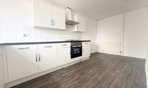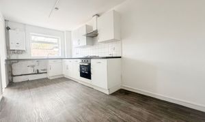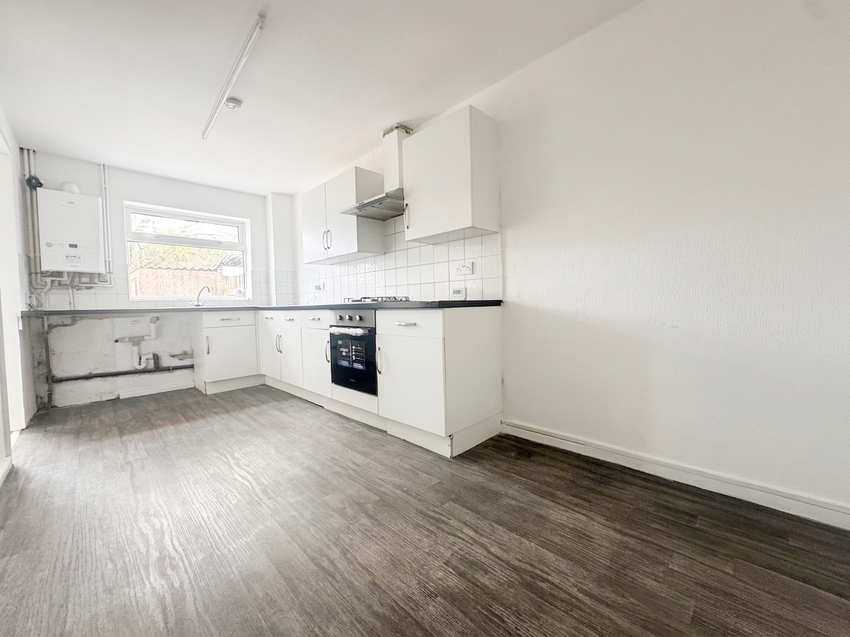 Vinyl flooring, cupboards, radiator, double glazed window, integrated gas hob and electric oven, stainless steel extractor fan, wall mounted combination boiler.
