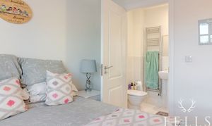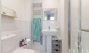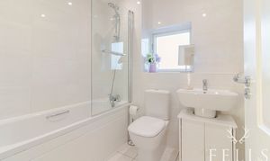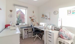 Upstairs, the landing feels bright and open with its side aspect window and practical built in storage. The main bedroom at the front of the house has its own ensuite, creating a private corner for quiet routines at the start and end of each day. Two further bedrooms overlook the garden at the rear, both well suited to guests, children or a dedicated workspace. The family bathroom is smart and fully tiled, with a front aspect window that softens the space with natural light.