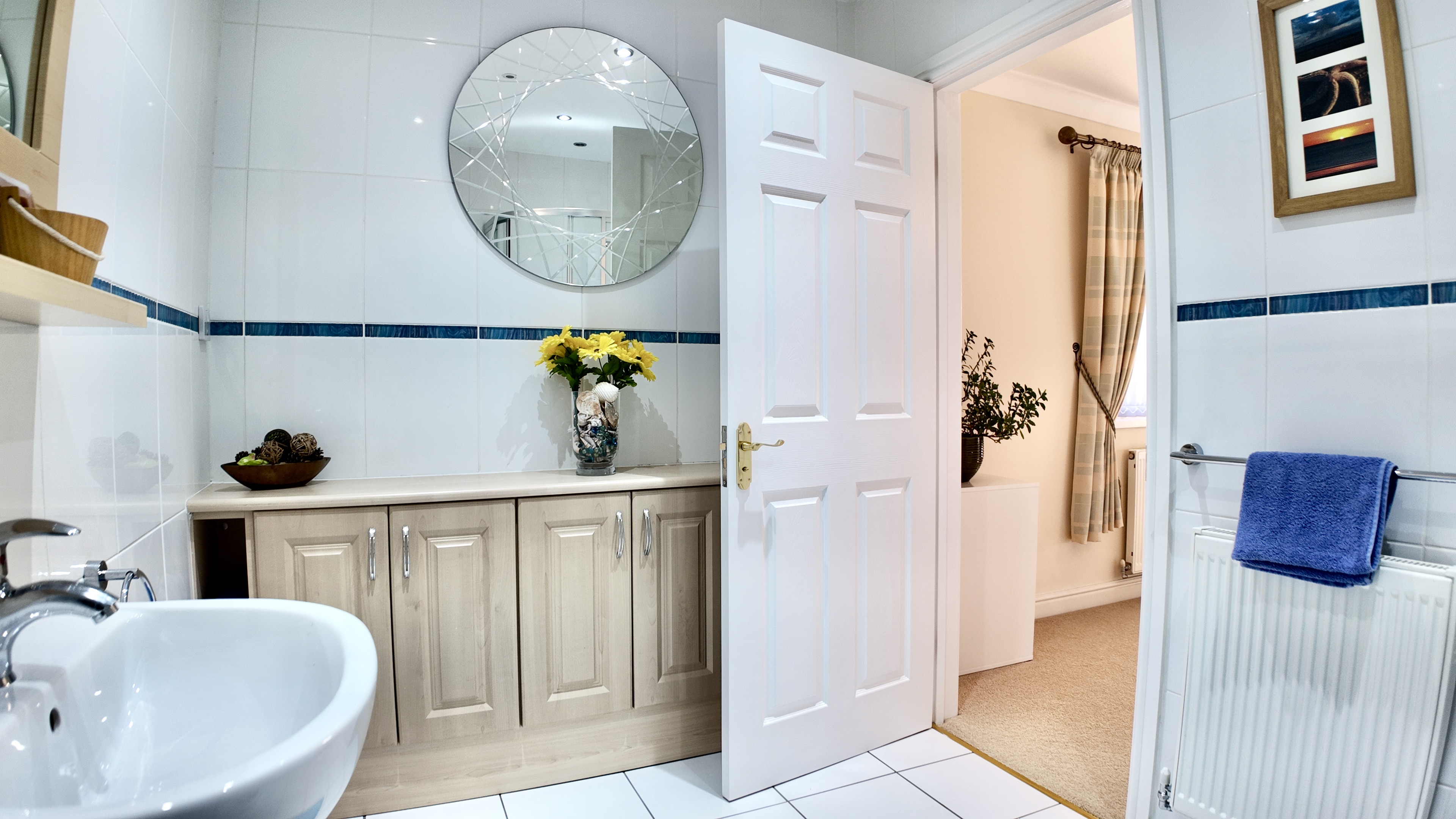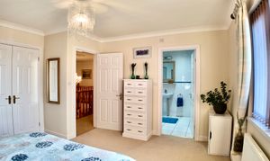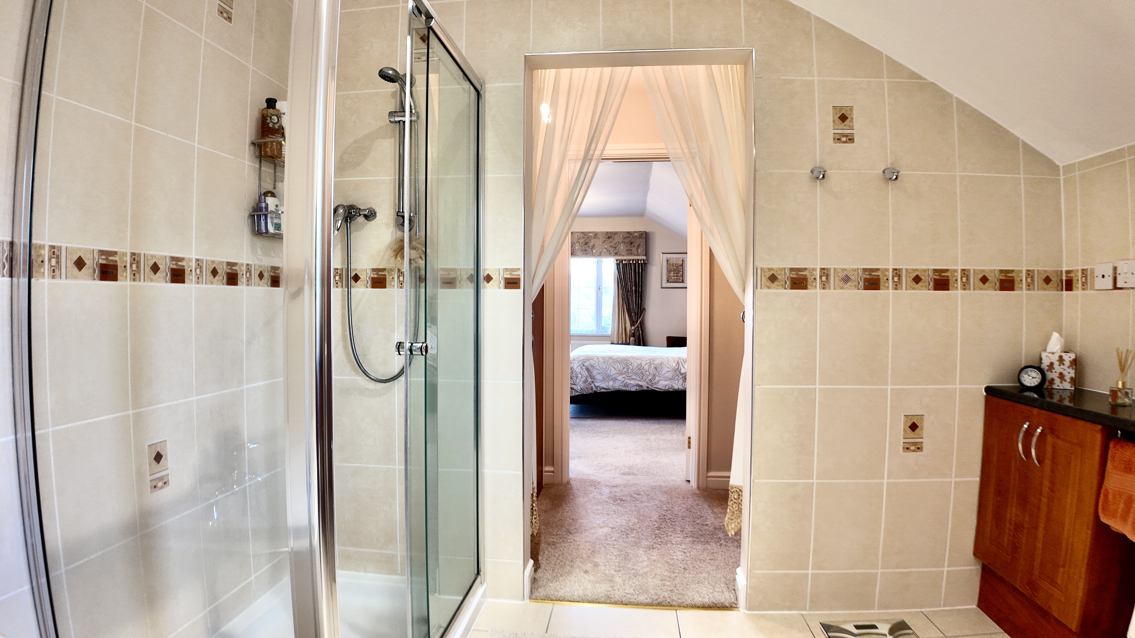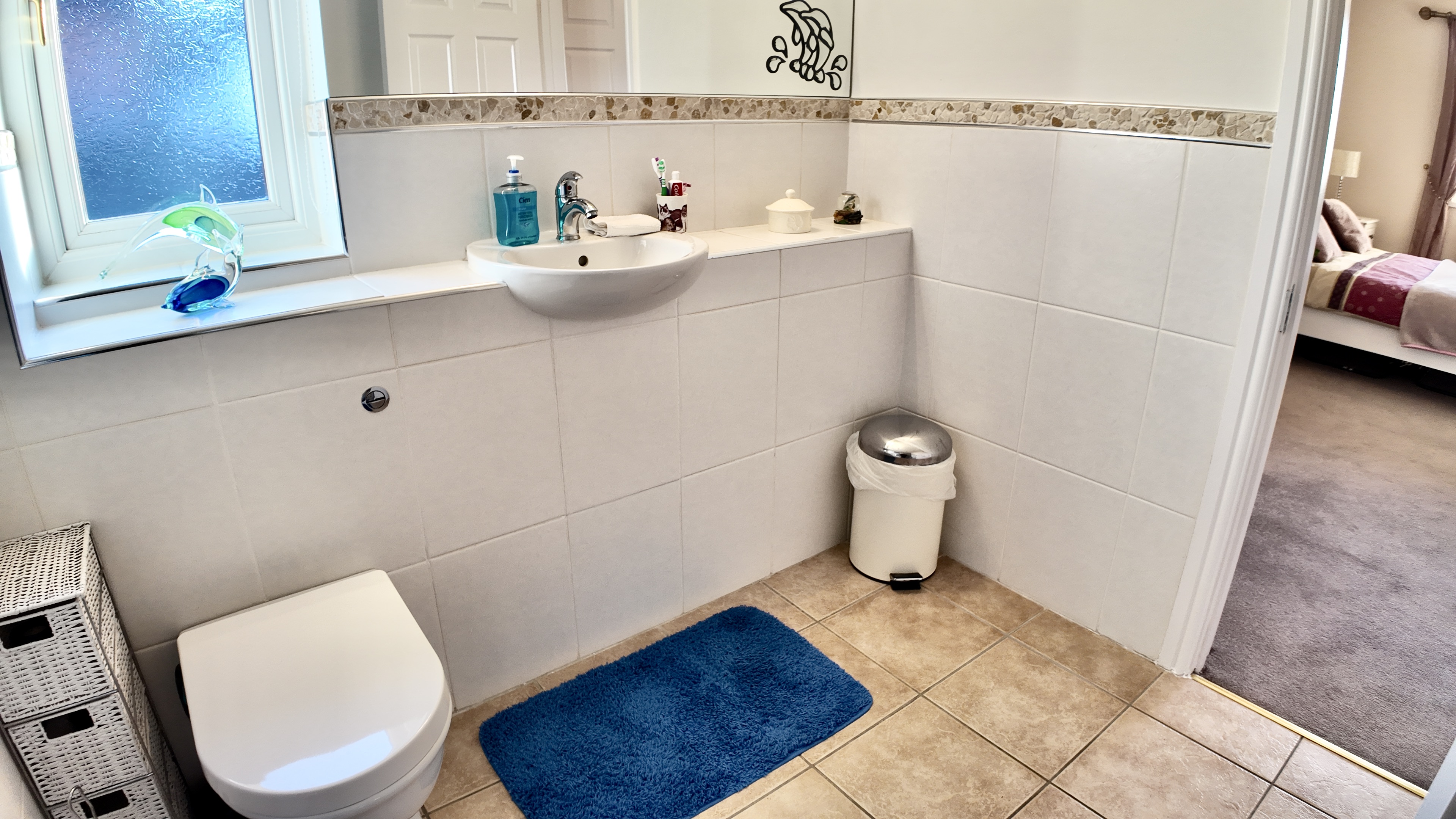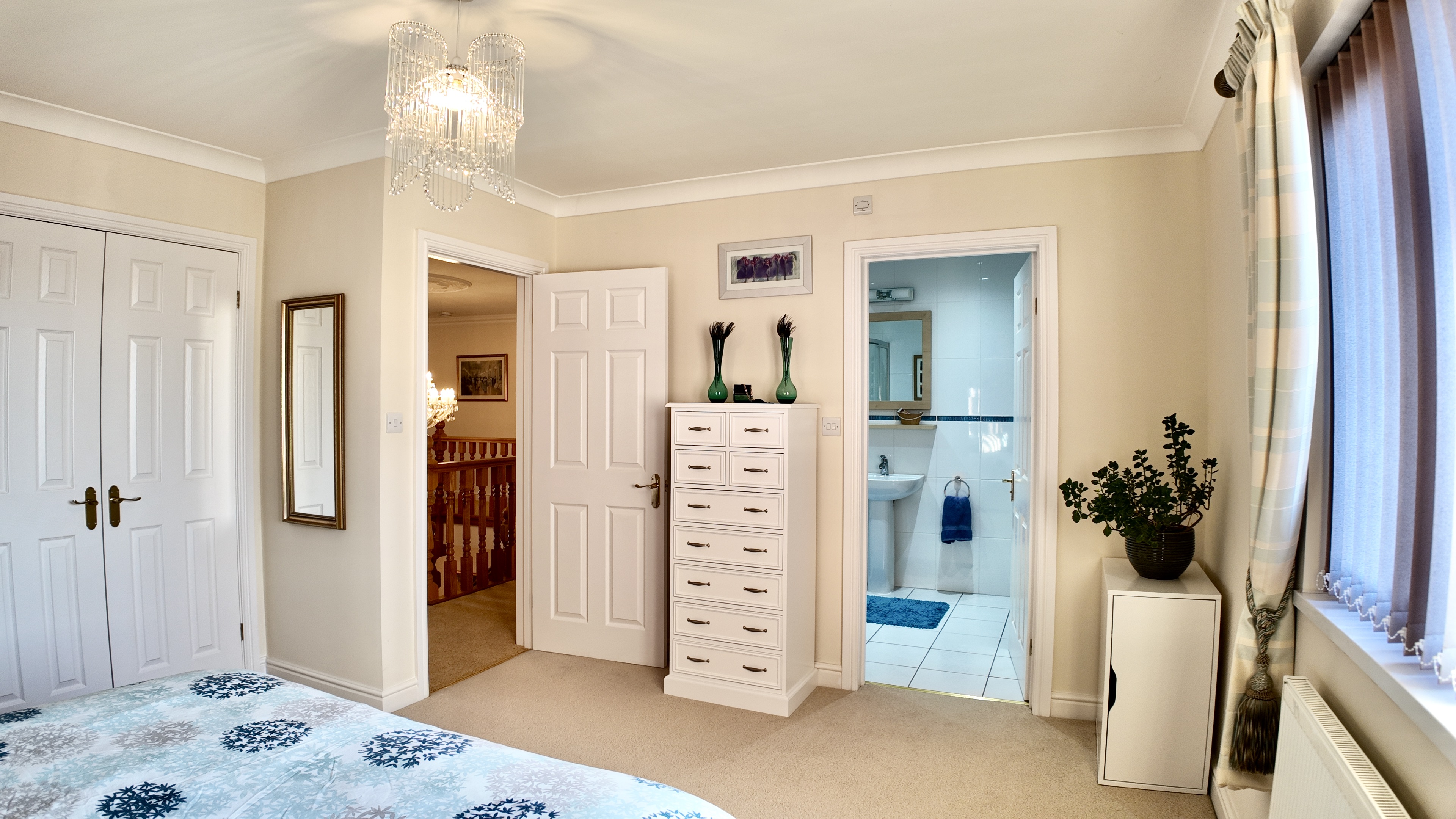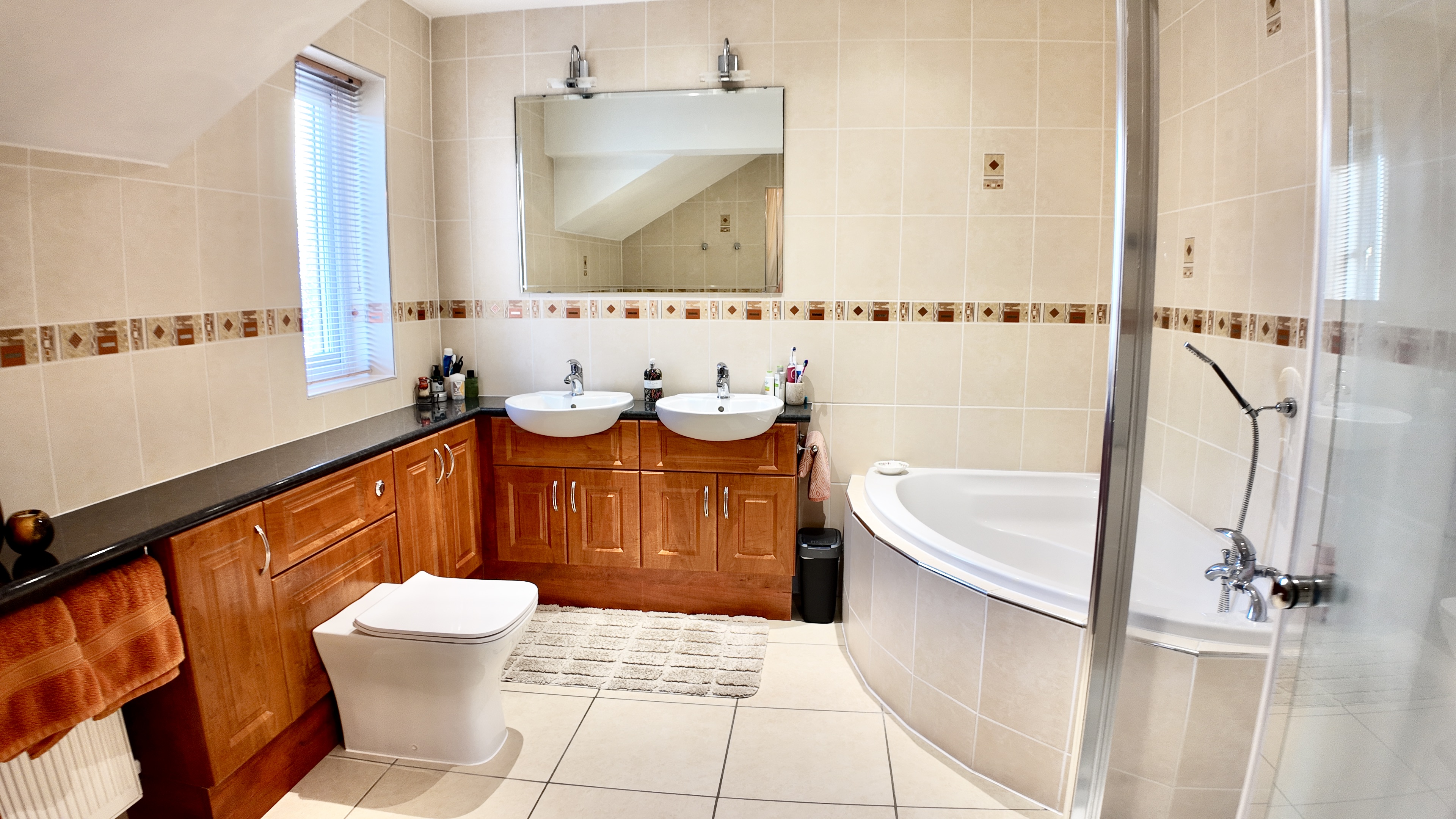 Two further double bedrooms each come with their own ensuite and built-in storage, making them ideal for older children or guests. The rear bedroom is a showstopper, with large windows that let the light pour in and its own crescent-shaped balcony for a private escape. There’s also a full family bathroom with a unique step-up bath, adding a touch of luxury, and a smaller single bedroom to the front, perfect for a nursery or study.