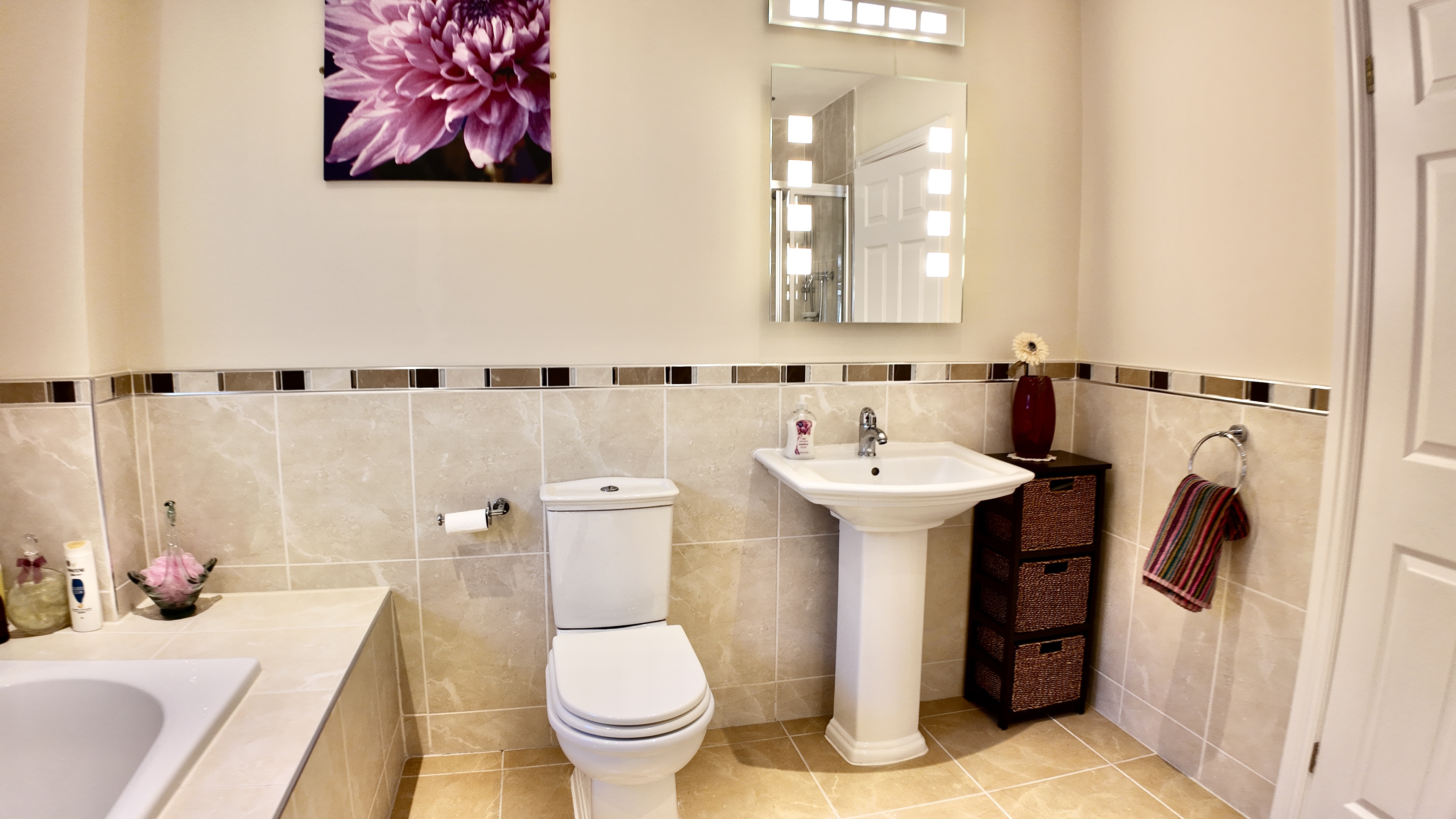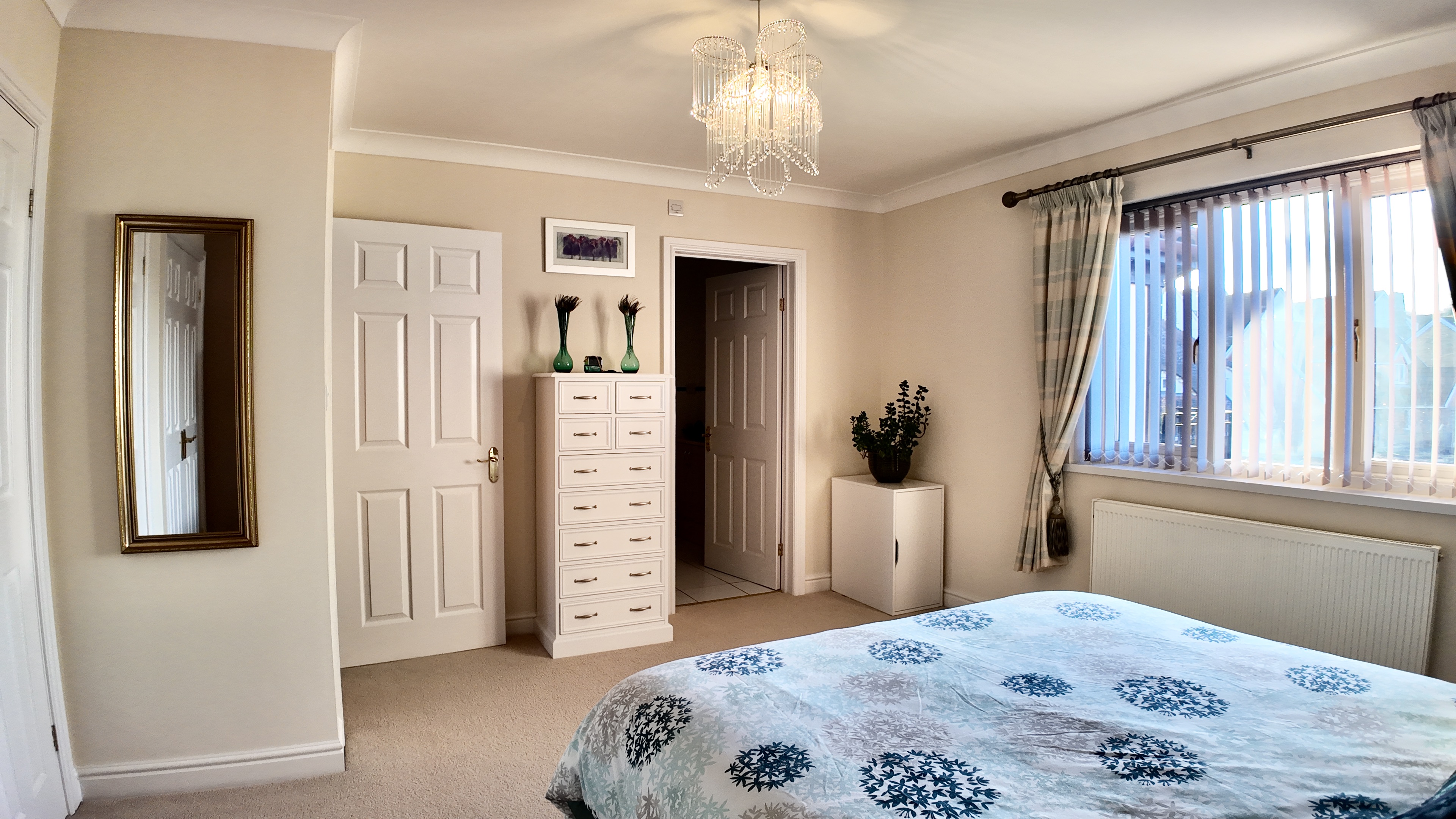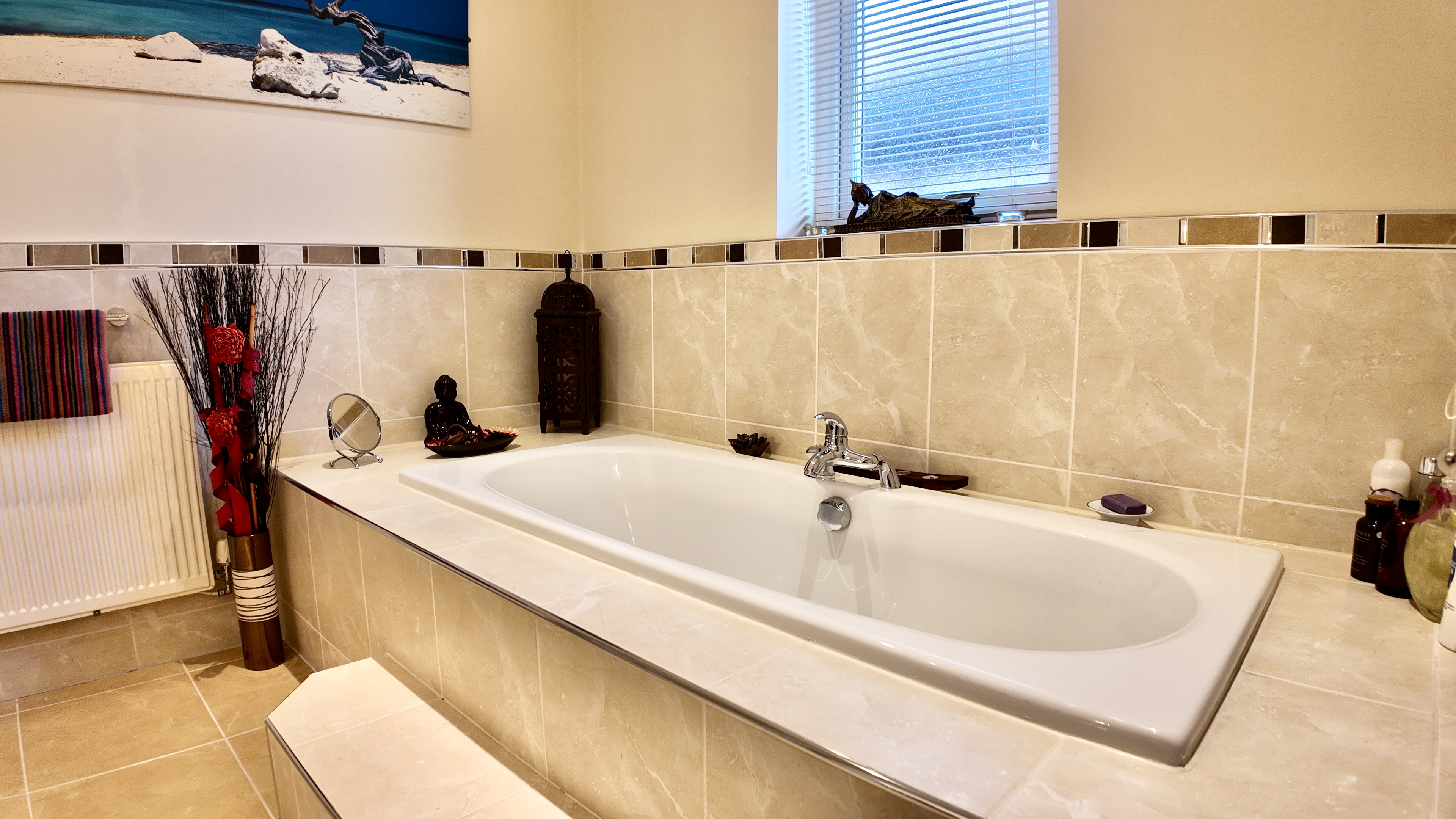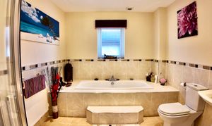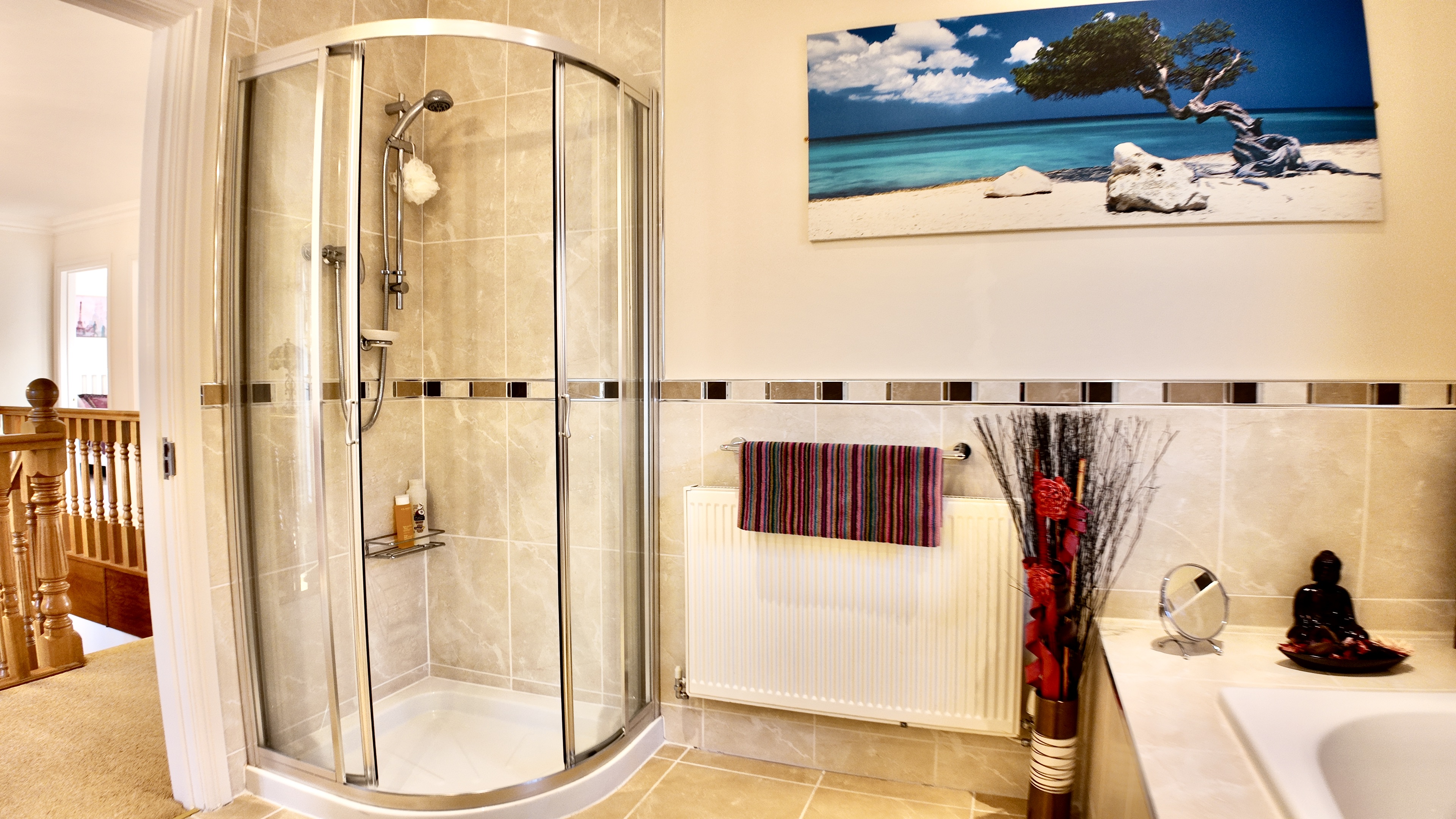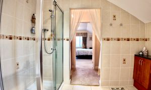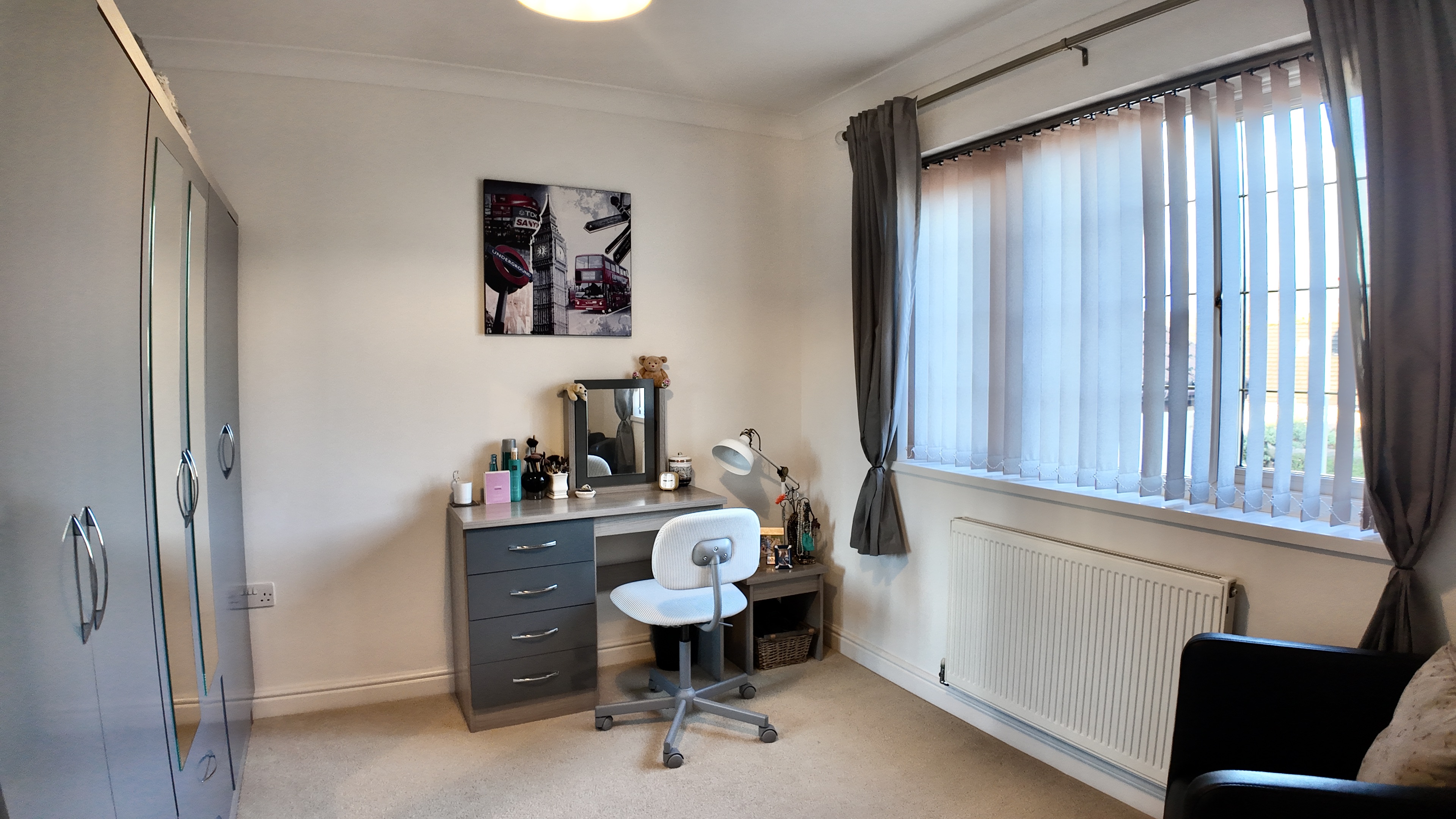 Two further double bedrooms each come with their own ensuite and built-in storage, making them ideal for older children or guests. The rear bedroom is a showstopper, with large windows that let the light pour in and its own crescent-shaped balcony for a private escape. There’s also a full family bathroom with a unique step-up bath, adding a touch of luxury, and a smaller single bedroom to the front, perfect for a nursery or study.