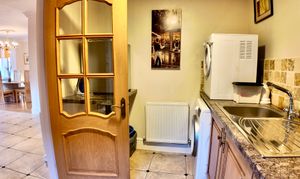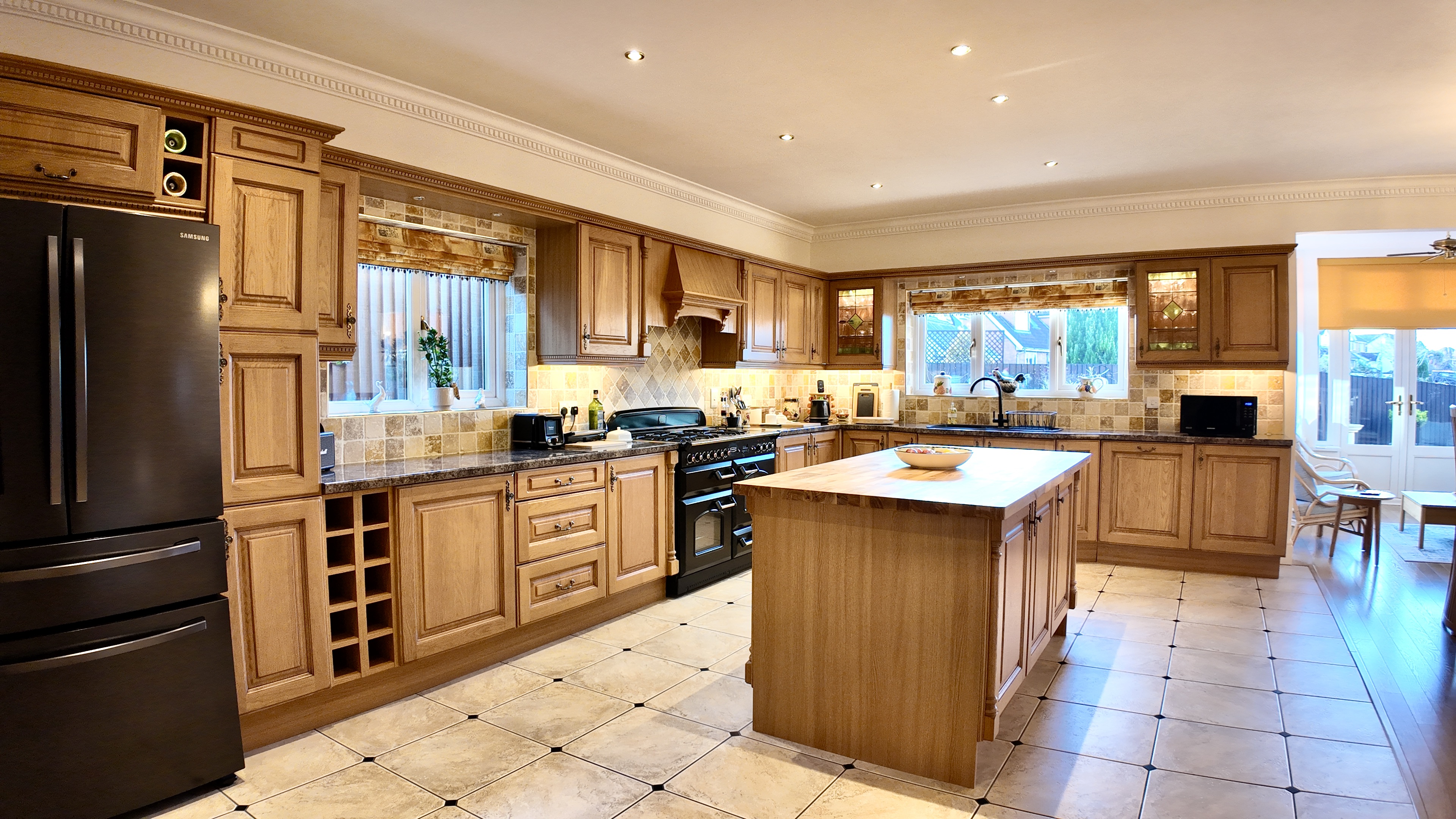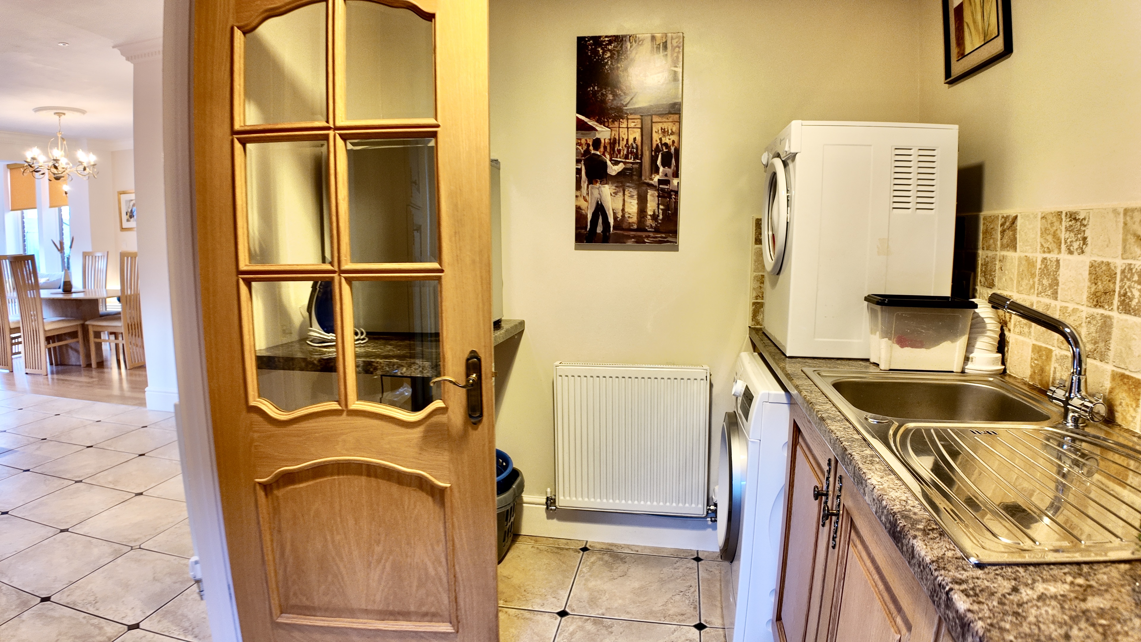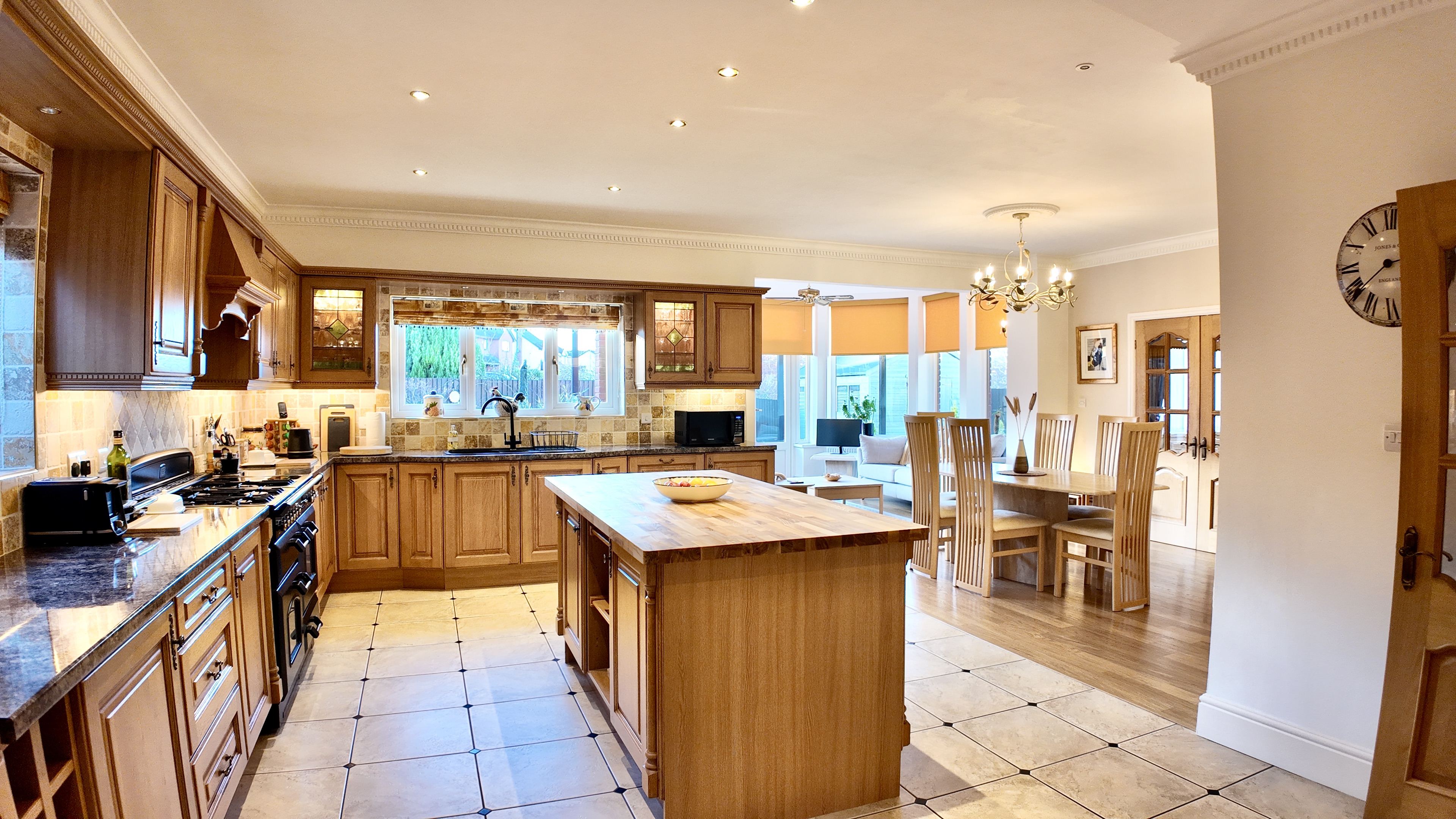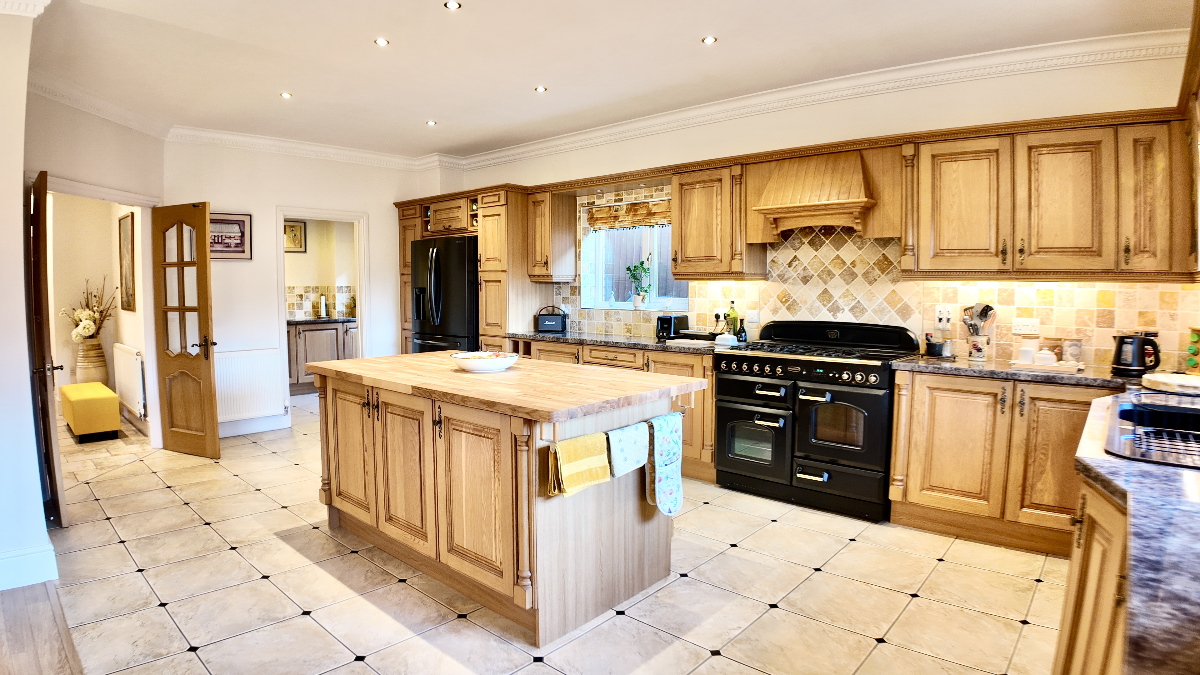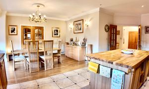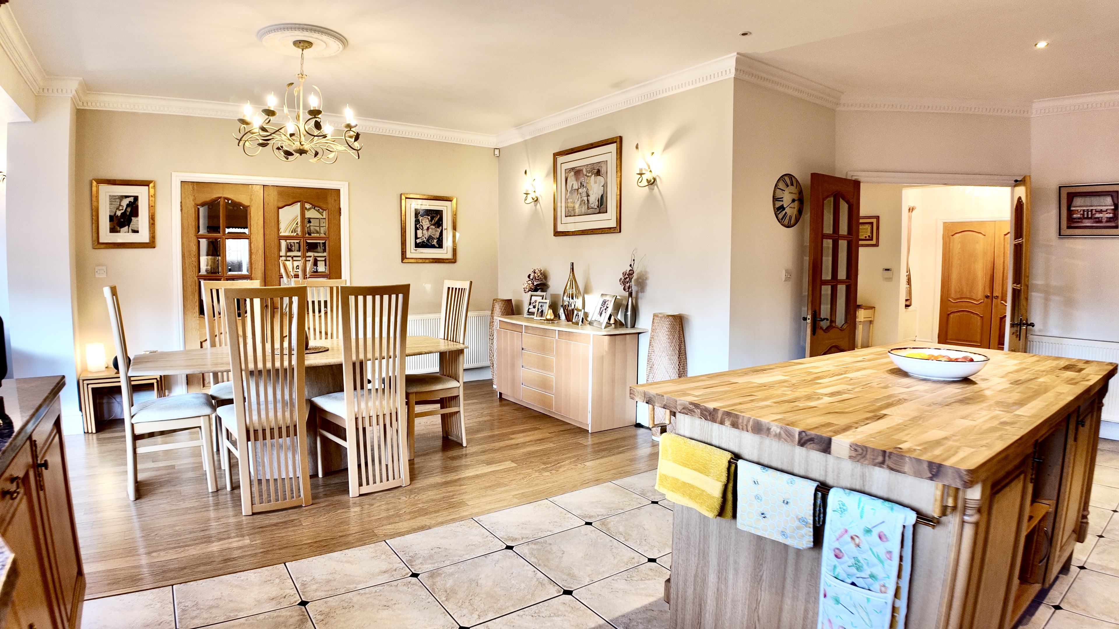 To your right, you’ll find a spacious formal reception room, perfect for relaxing or entertaining guests. Elegant doors open directly into the open-plan kitchen and dining area, creating a seamless flow for family gatherings or dinner parties. The kitchen itself is a real highlight, boasting a central island that’s ideal for casual breakfasts or evening drinks. There’s also a dedicated utility room with its own side access, keeping every-day chores tucked neatly away.