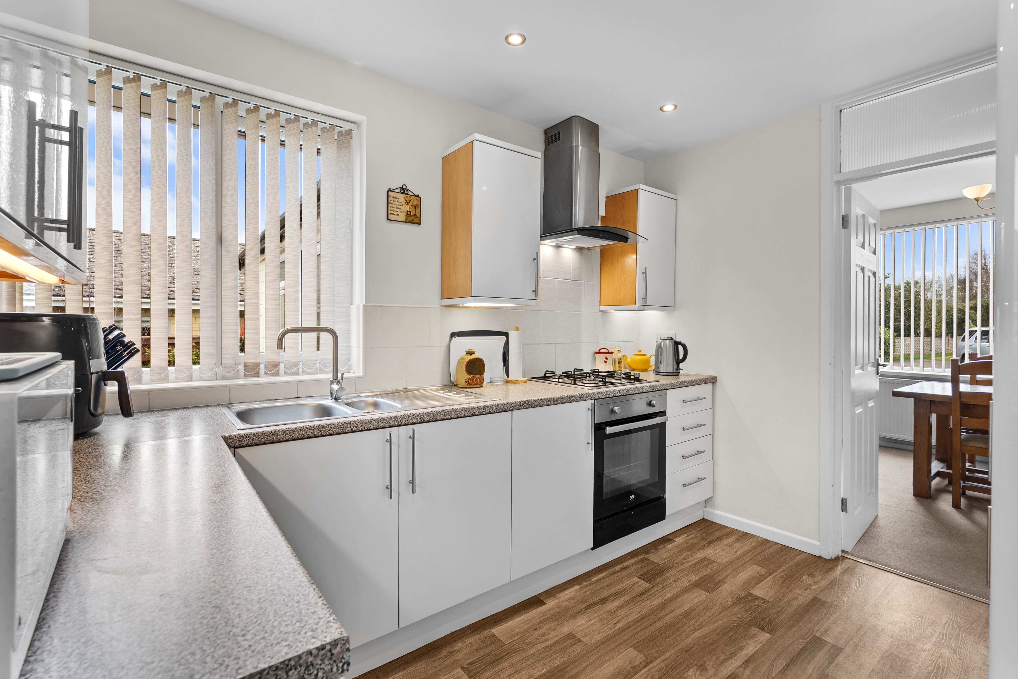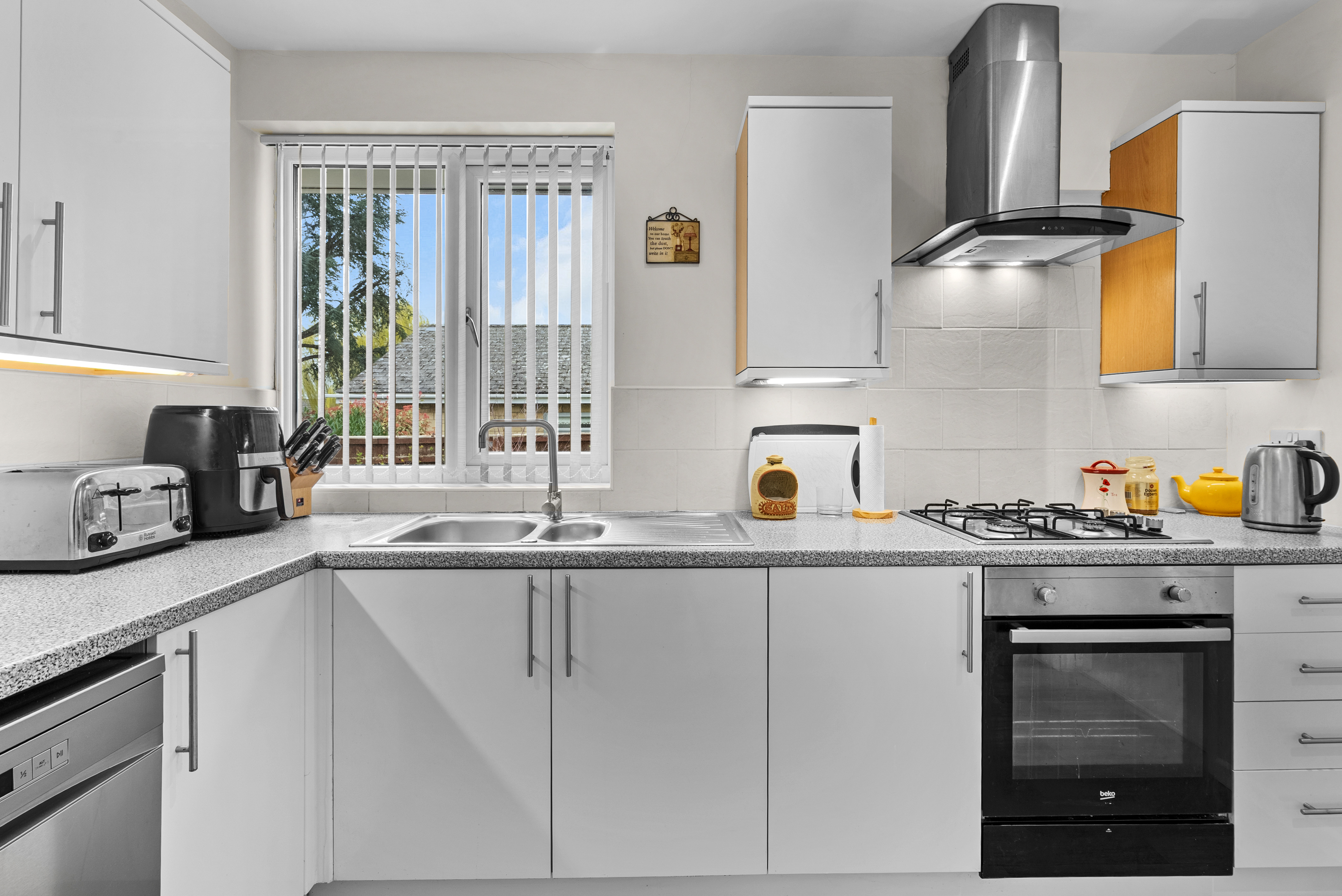 The kitchen is fitted with a range of wall and base units with integrated appliances, including an electric oven, gas hob and fridge/ freezer, while a separate utility room to the rear of the garage provides further storage, laundry facilities and access to the garden.