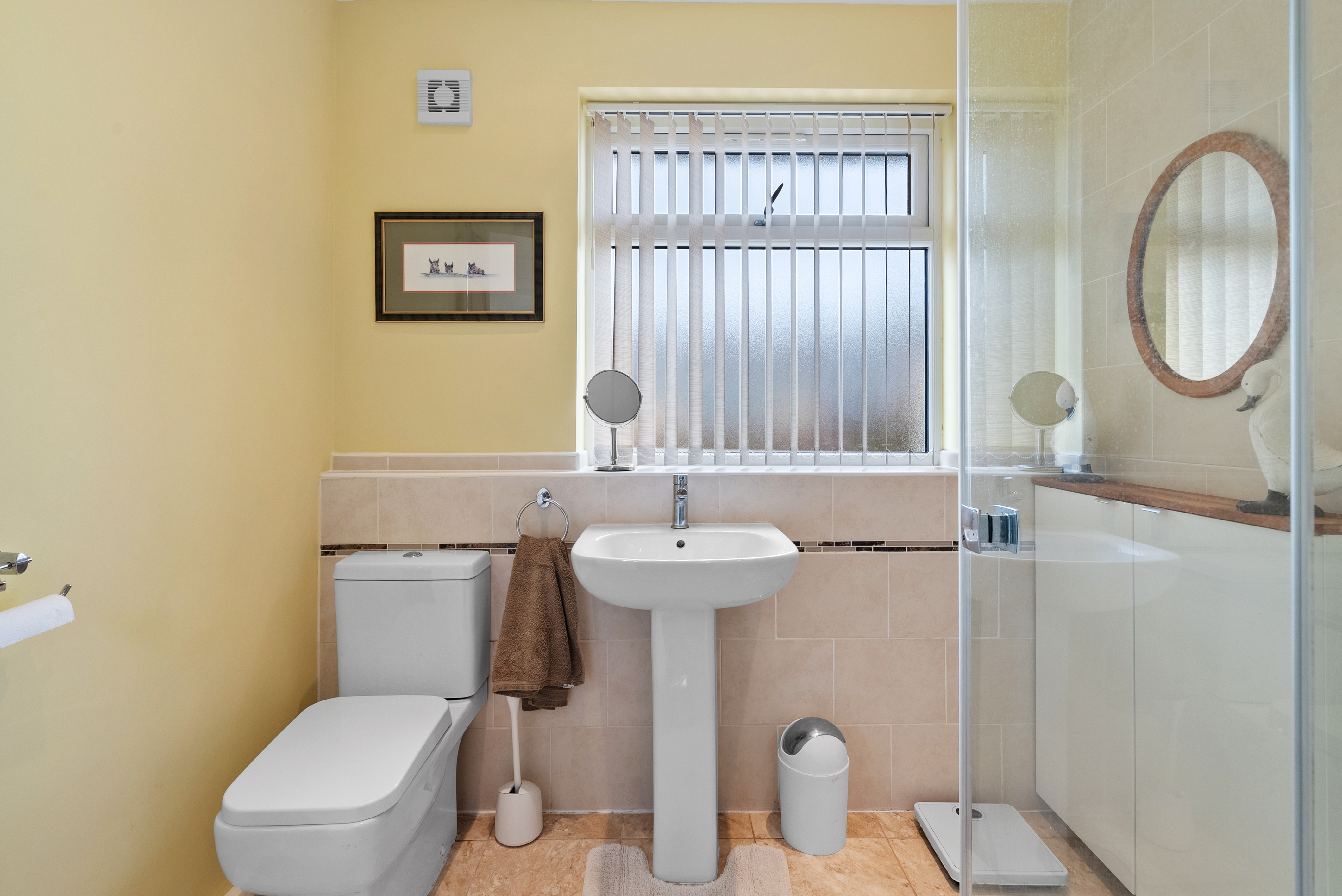 An inner hallway leads to three bedrooms, including two comfortable doubles with fitted wardrobes overlooking the rear garden, alongside a versatile single bedroom ideal for guests or a study. The accommodation is completed by a well-appointed shower room.