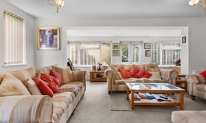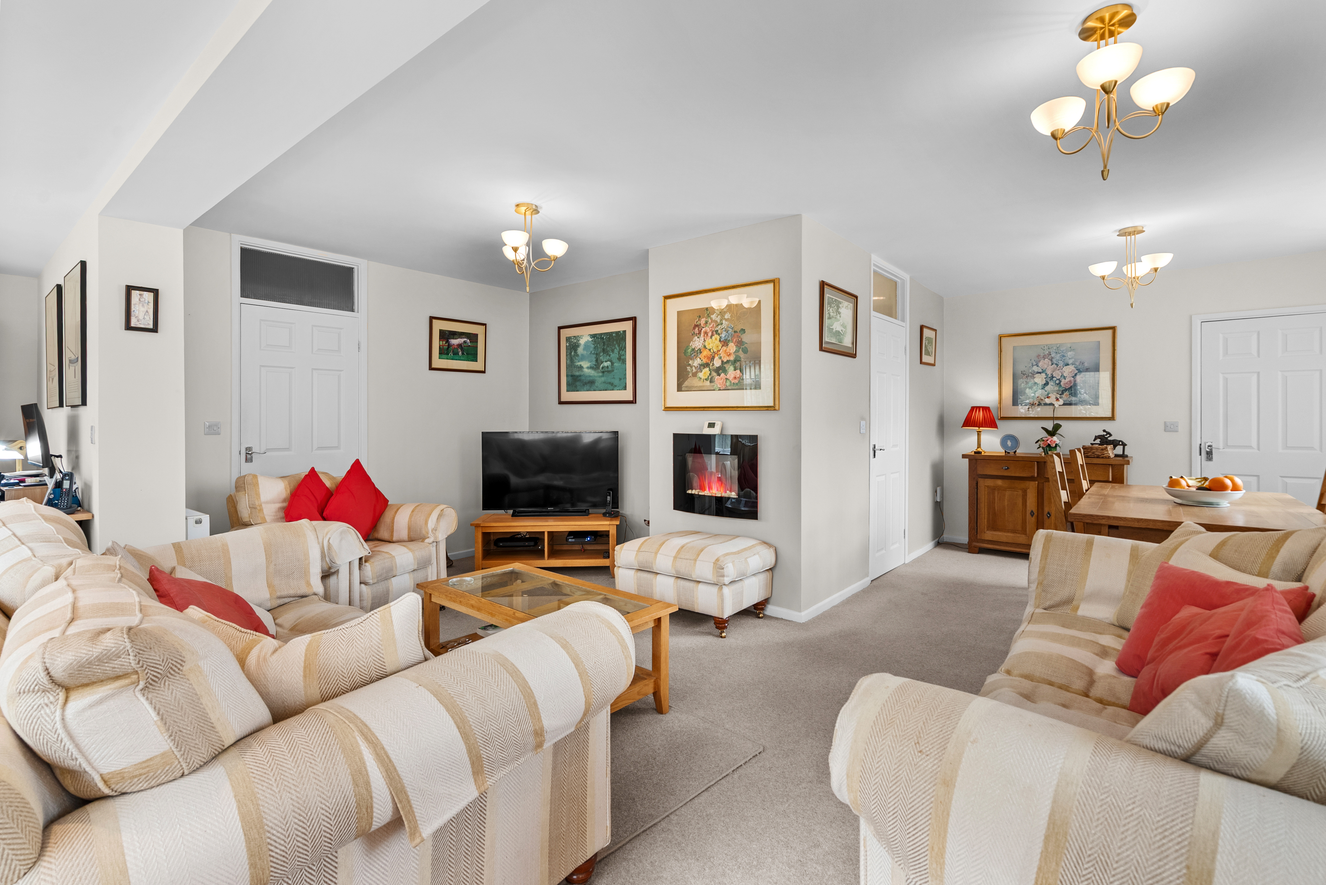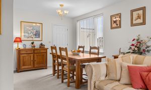 The property is entered via a welcoming entrance hall which leads through to a spacious L-shaped lounge and dining room, a bright dual-aspect living space that forms the heart of the home. A wall-mounted living flame electric fire provides a focal point, while French doors open directly onto a patio seating area, creating a seamless connection with the garden. A dedicated study area offers a useful space for home working or reading.