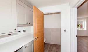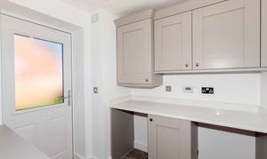 Plot 18, The Bamburgh welcomes you with a spacious entrance hall that leads to a generous family lounge featuring a striking bay window, a handy downstairs WC, and a versatile study or playroom. At the heart of the home is an impressive open-plan kitchen, dining, and living area, complete with sleek quartz worktops, integrated Bosch appliances, and stylish chrome sockets throughout. Aluminium bi-fold doors open out to a beautifully sized garden, ideal for relaxing or entertaining. A separate utility room adds convenience to this thoughtfully designed layout.