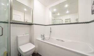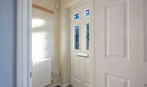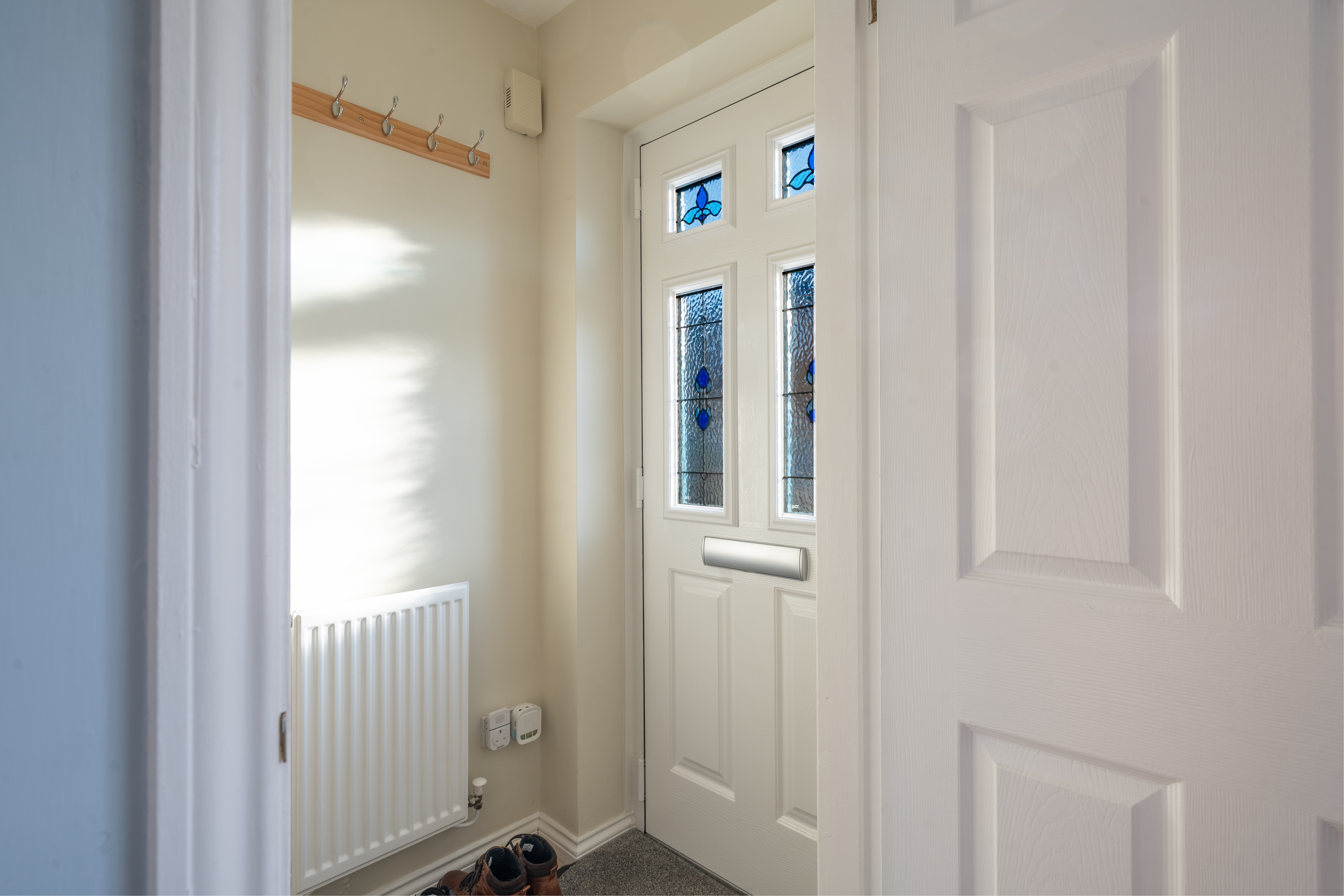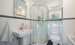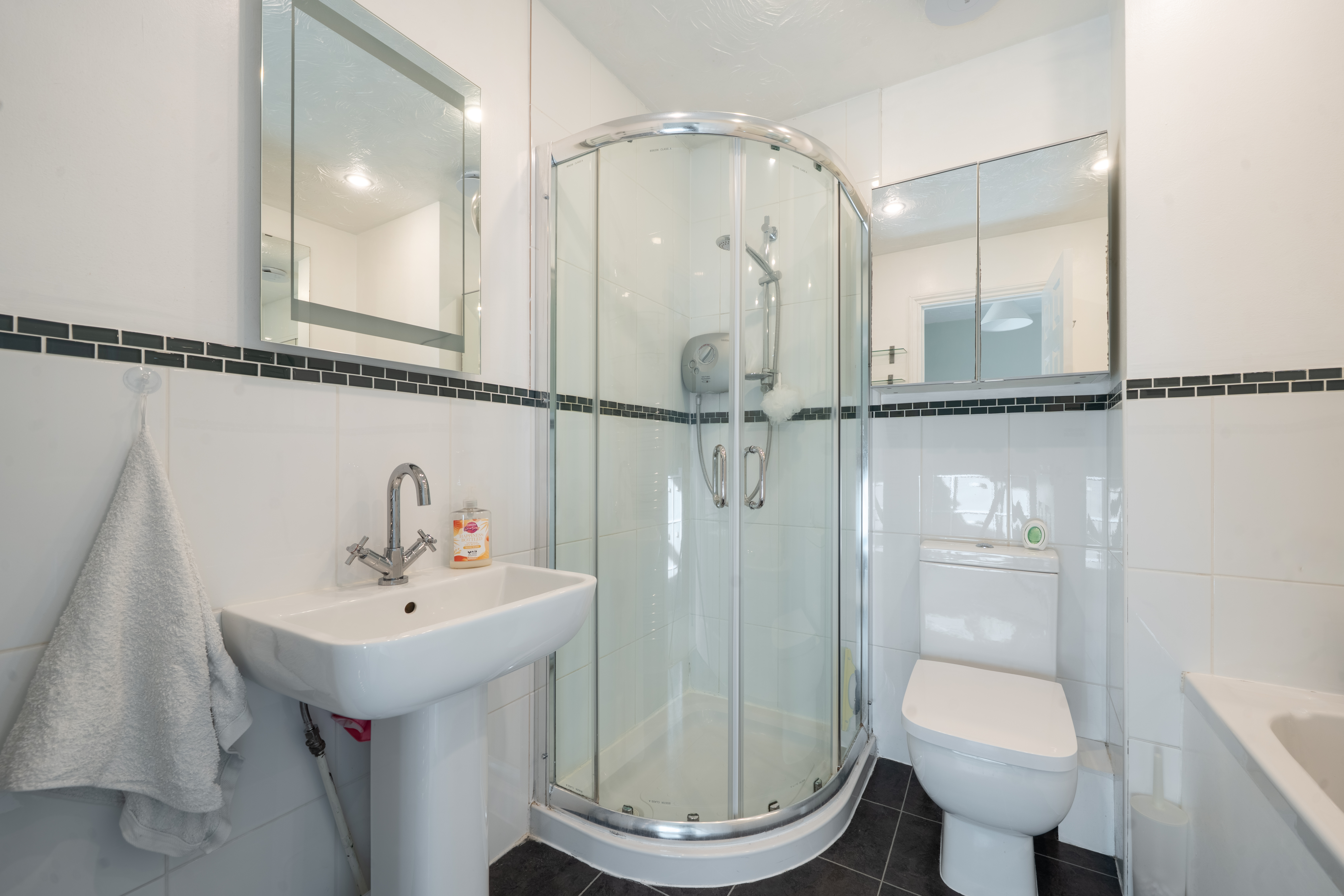 On the first floor there are two double bedrooms, Bedroom 1 with built in wardrobe and Bedroom 2 with a built in cupboard over the stairs. There is a modern four piece family bathroom comprising a panel enclosed bath, WC, shower cubicle, pedestal wash hand basin, heated towel rail, half-tiled walls, and a mirrored bathroom cabinet.
