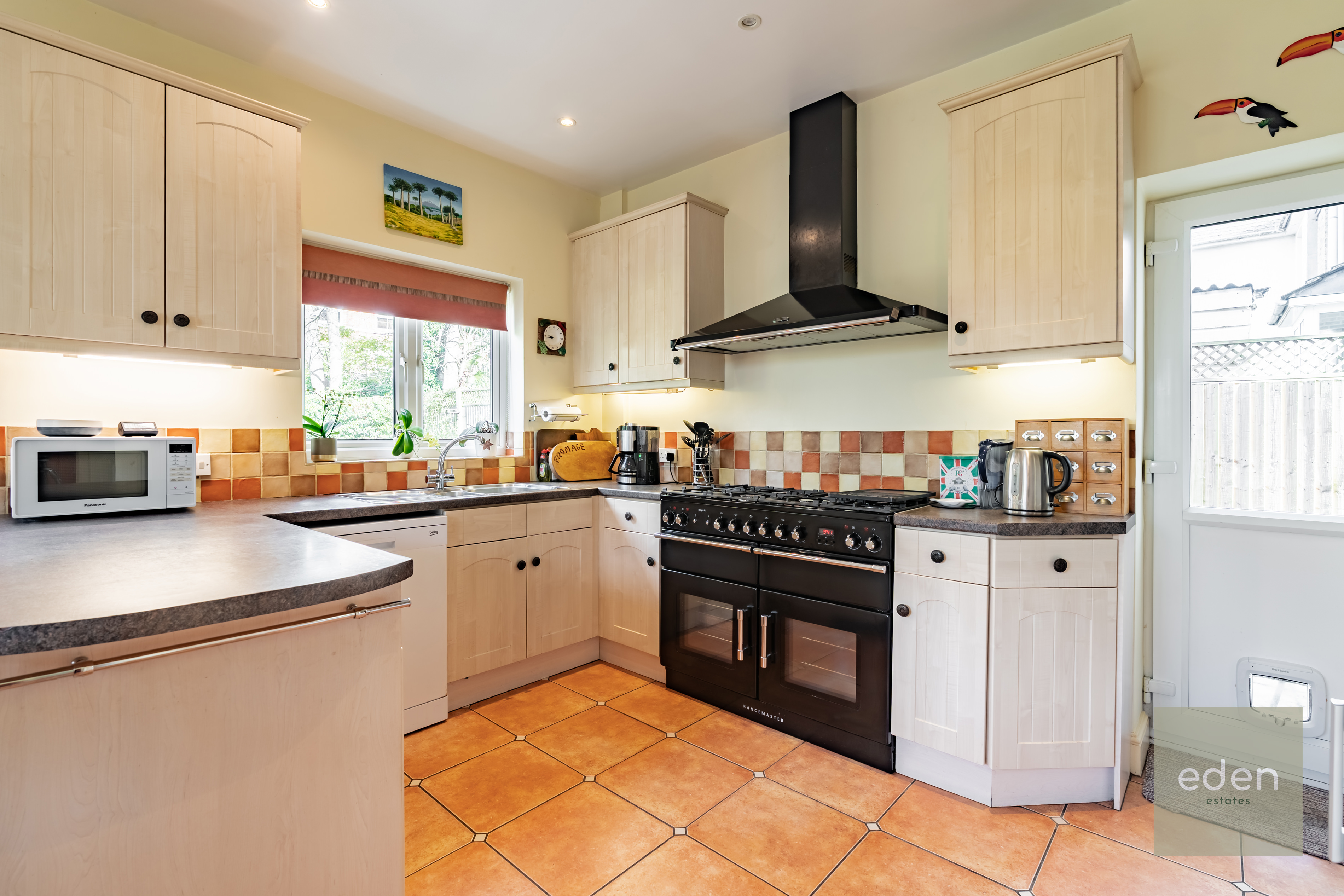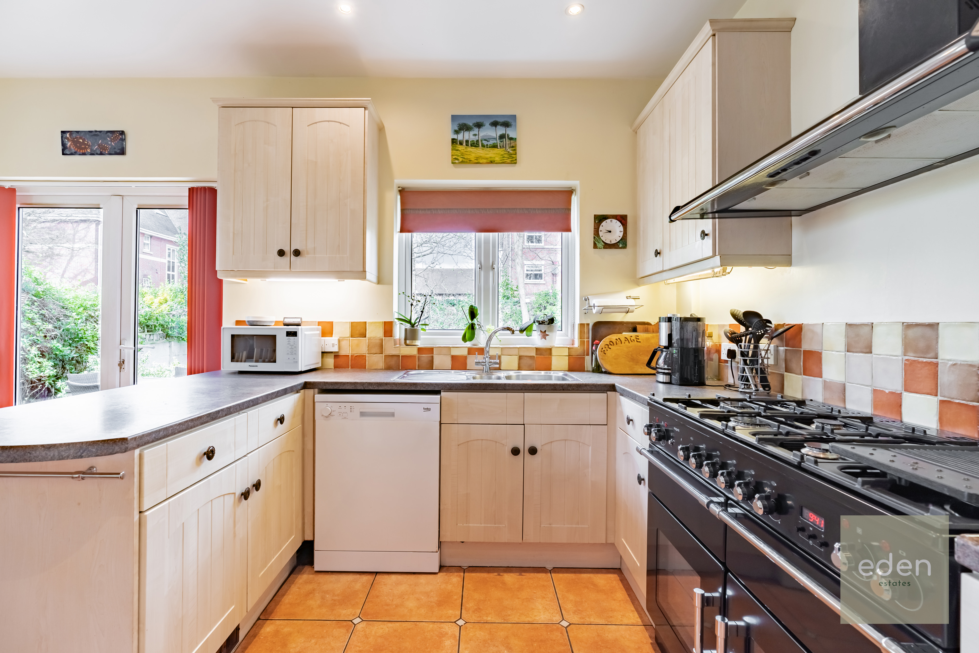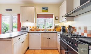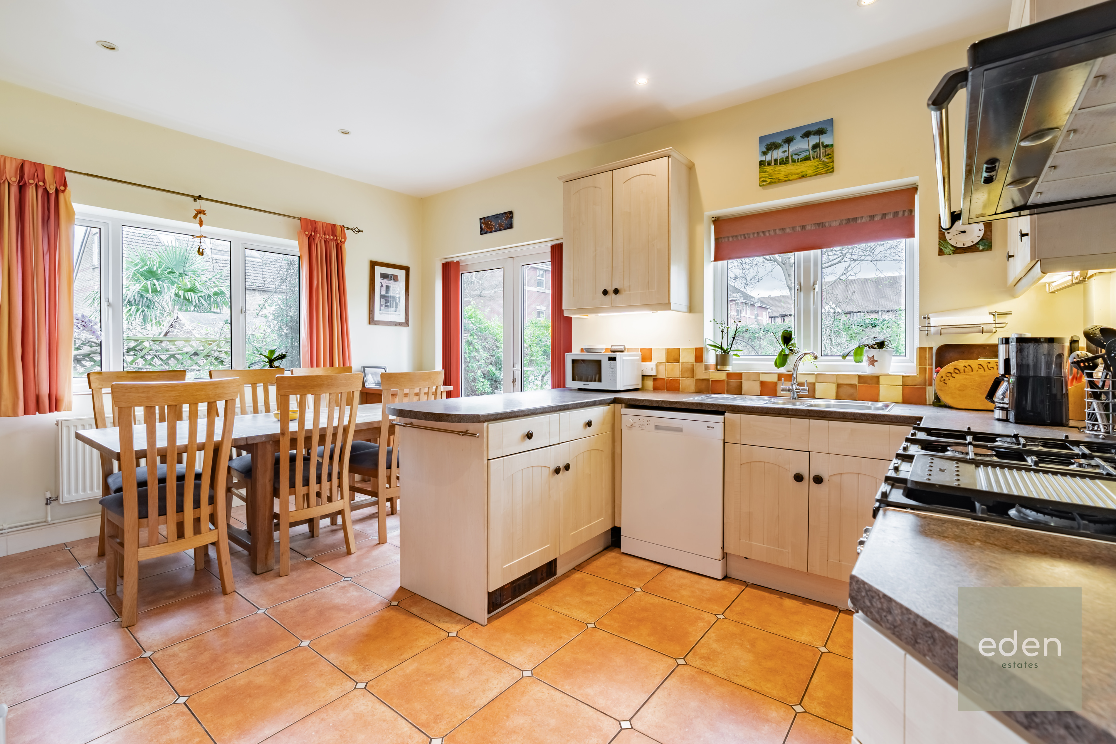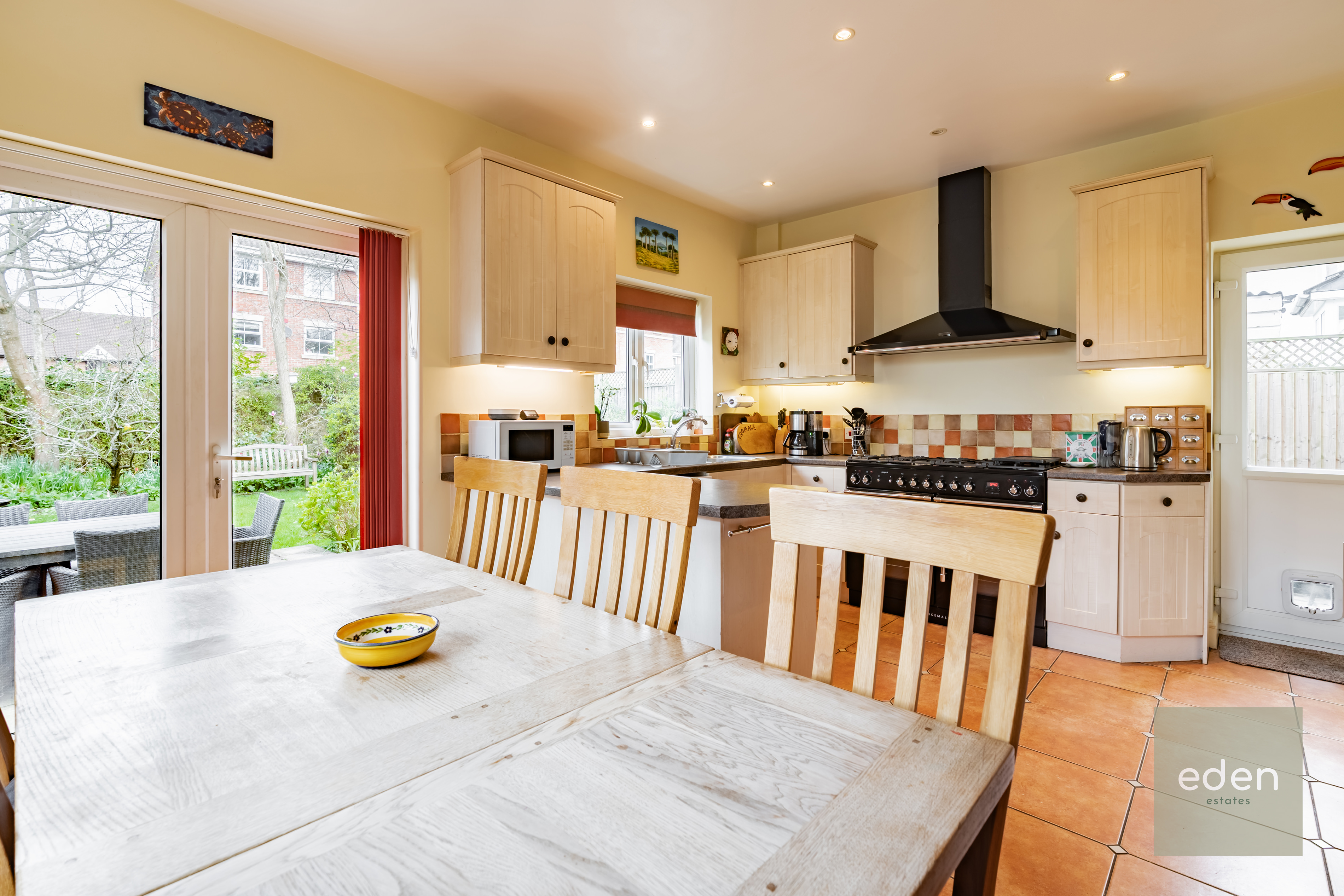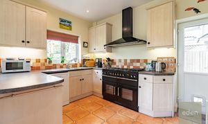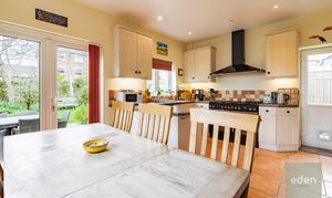 Step inside to discover a spacious open plan kitchen and dining area, featuring a stylish range cooker and ample storage and French doors leading to a large private garden.