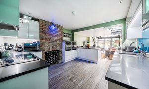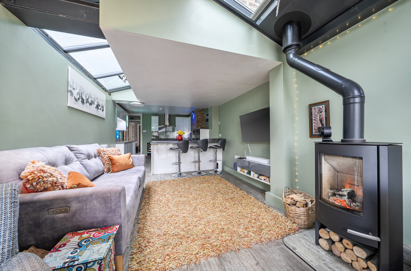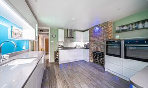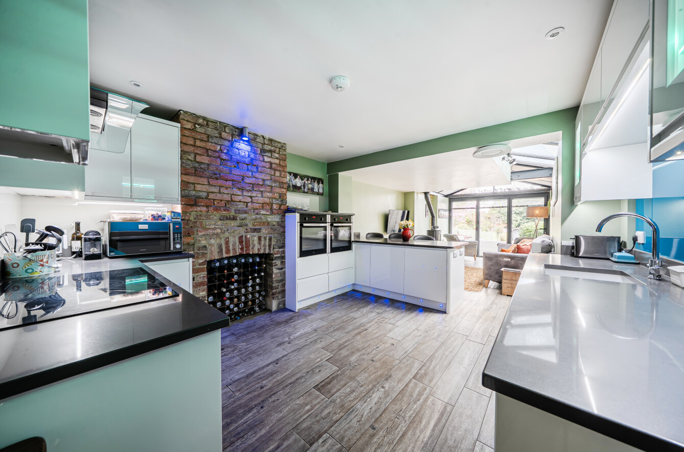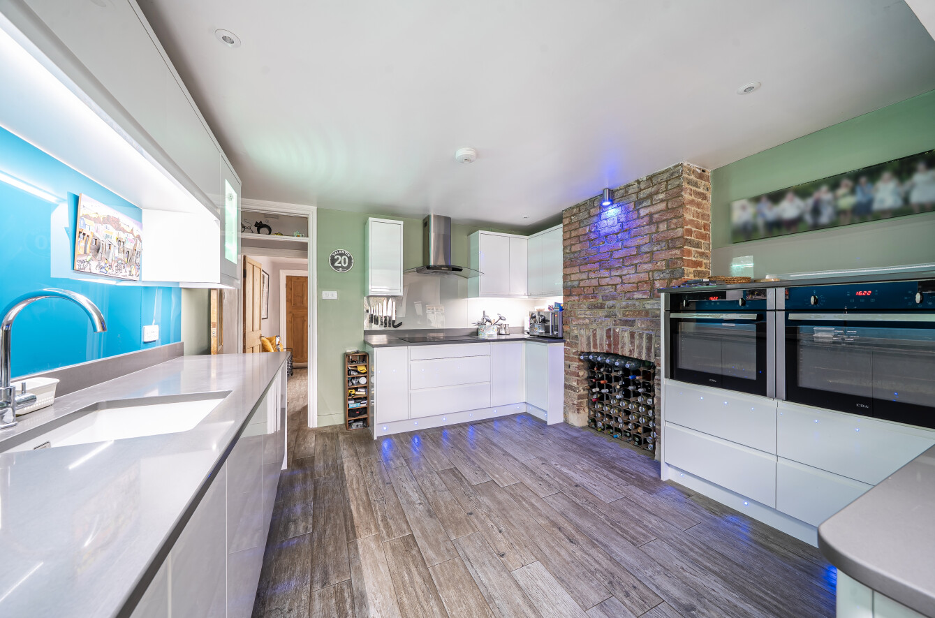 The sitting room is a lovely bright space with wood-effect flooring, feature fireplace, built-in shelves and a bay window with views to the front. The kitchen/dining/family room is a highlight of this property with plenty of natural light coming from the extended area of the property that has full-width glass doors leading into the garden. The kitchen is fitted with modern white units with complementing stone composite worktops, finished with coloured lighting. Appliances include two side-by-side electric ovens, integrated washing machine, tumble dryer, dishwasher, fridge/freezer, and an induction hob with chimney extractor over. A lovely feature of this room is the original brick chimney breast currently being used to house a wine rack.