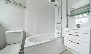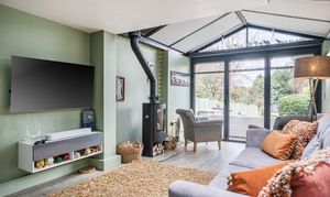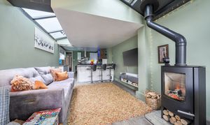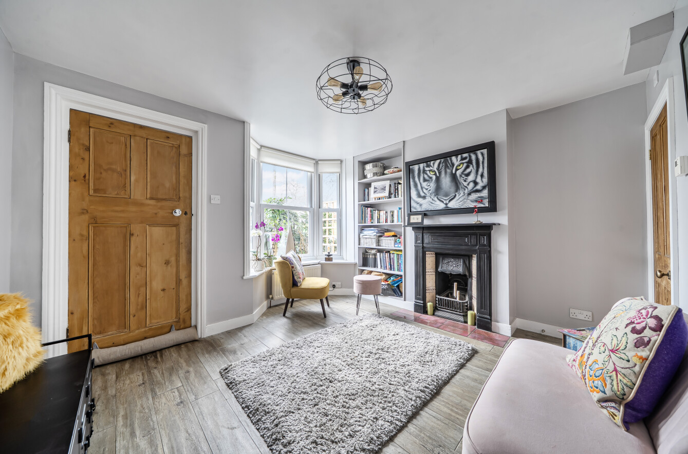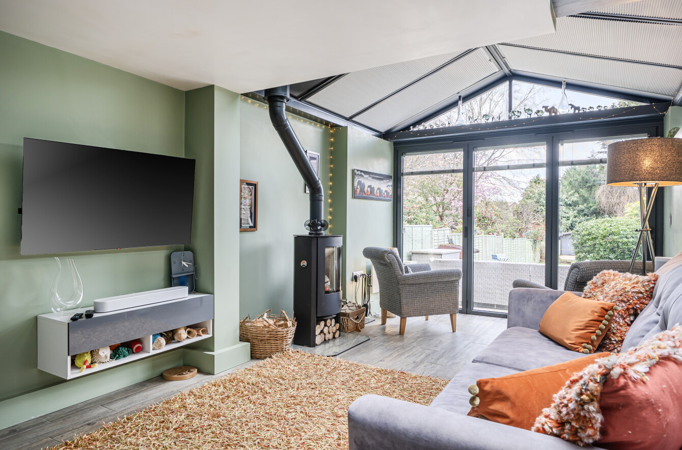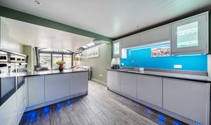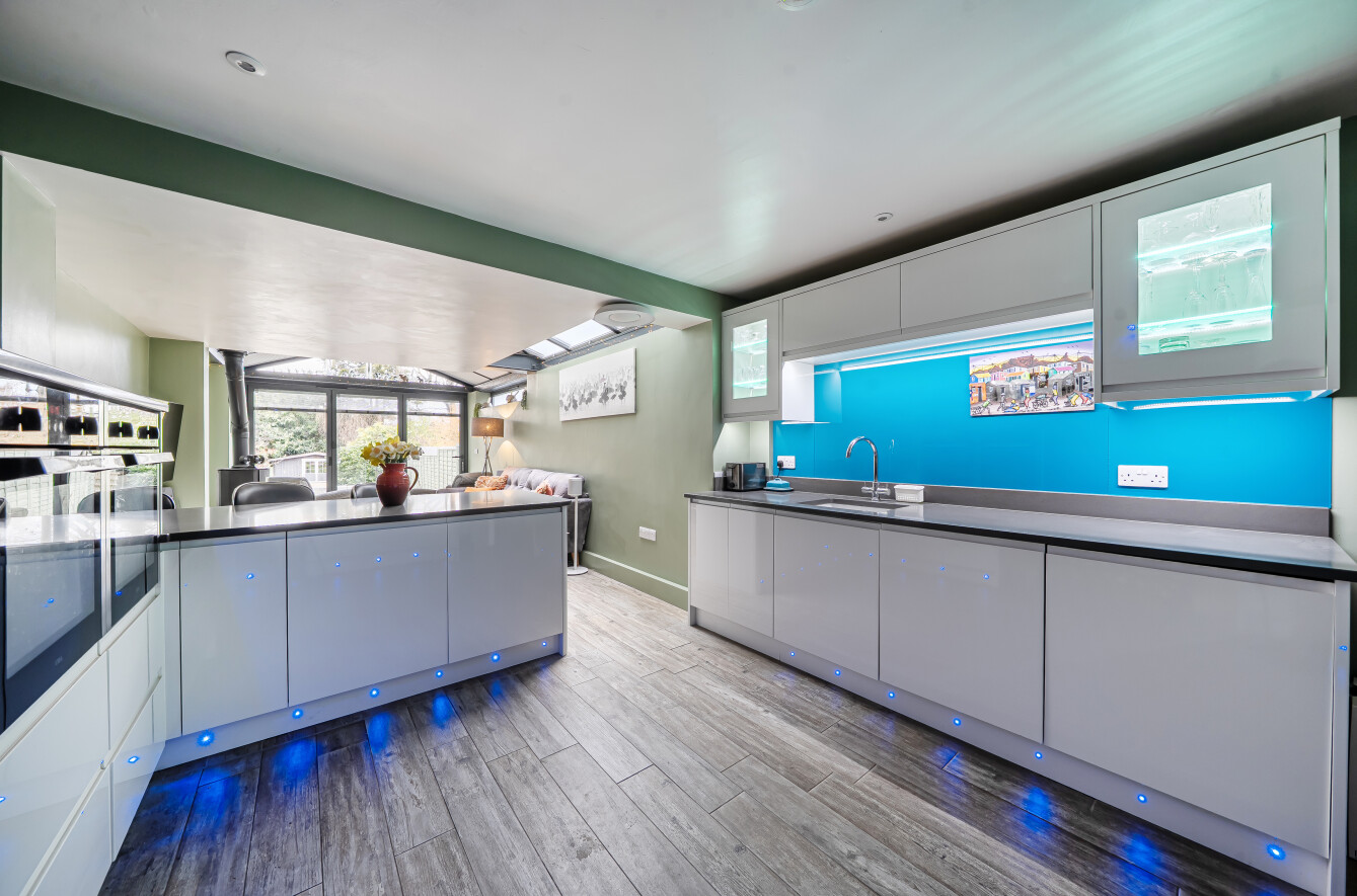 The sitting room is a lovely bright space with wood-effect flooring, feature fireplace, built-in shelves and a bay window with views to the front. The kitchen/dining/family room is a highlight of this property with plenty of natural light coming from the extended area of the property that has full-width glass doors leading into the garden. The kitchen is fitted with modern white units with complementing stone composite worktops, finished with coloured lighting. Appliances include two side-by-side electric ovens, integrated washing machine, tumble dryer, dishwasher, fridge/freezer, and an induction hob with chimney extractor over. A lovely feature of this room is the original brick chimney breast currently being used to house a wine rack.
