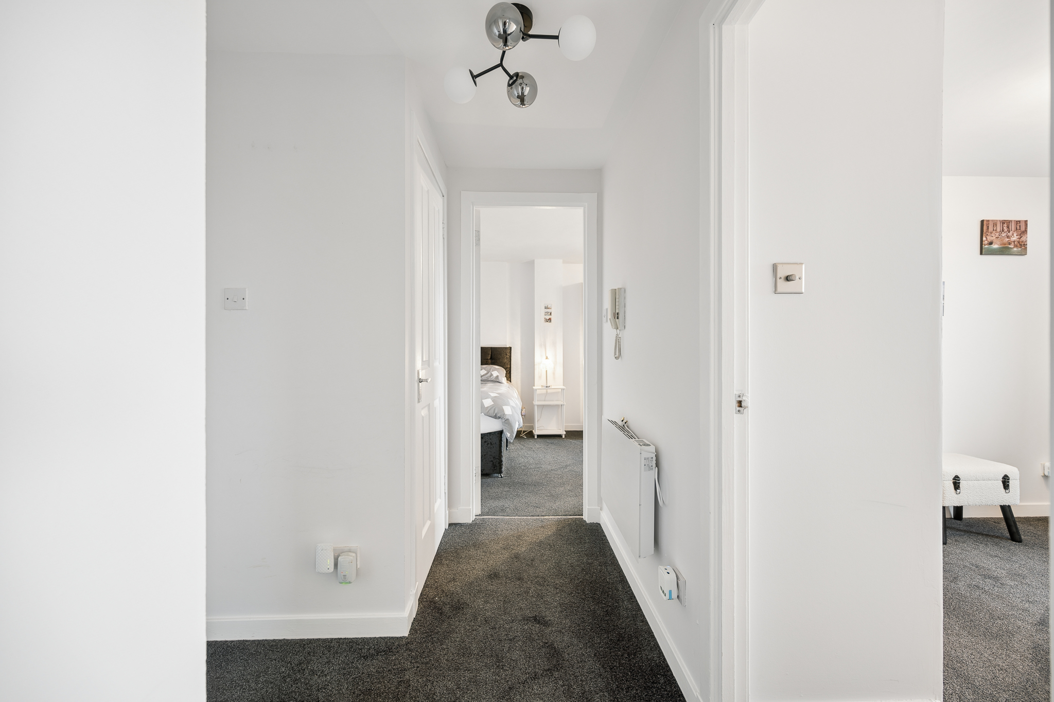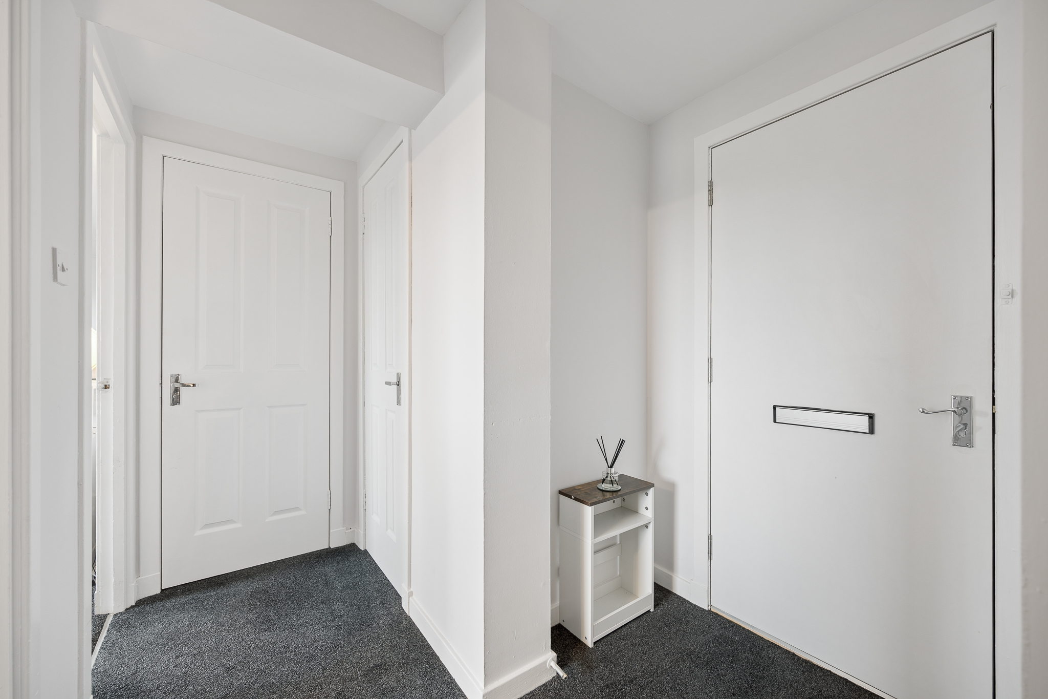 Upon entering the property, you are greeted by a bright and welcoming hallway, where crisp white walls, newly fitted doors and plush grey carpeting immediately set the tone for the rest of the home. Positioned to the left-hand side at the front of the hall, the main living space opens up into a wonderfully bright and spacious kitchen and living area, offering an open plan feel that works perfectly for modern living.