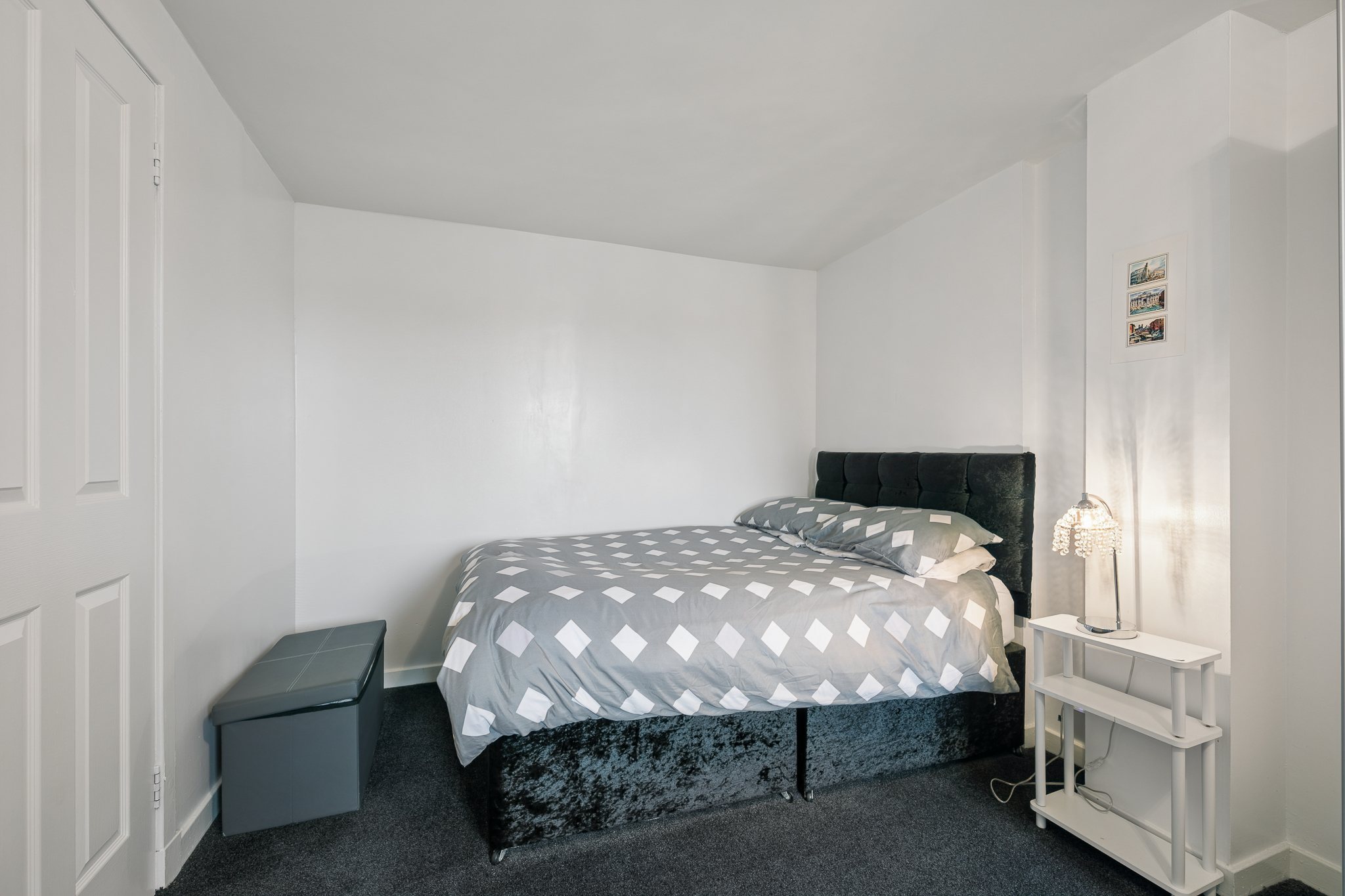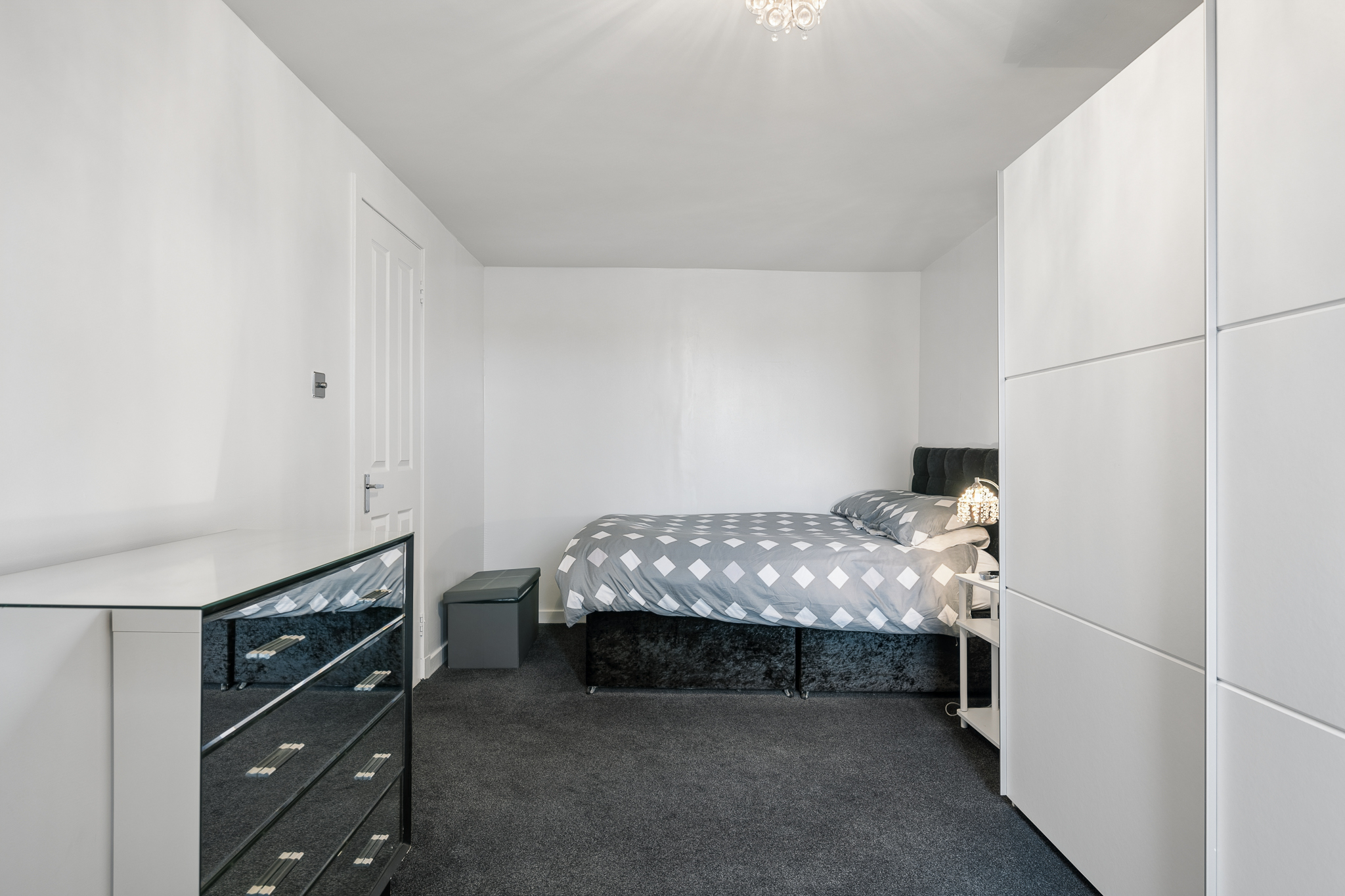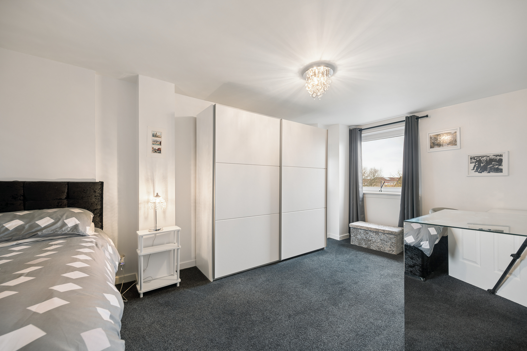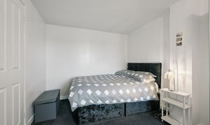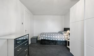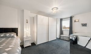 Back into the hallway and positioned at the end, the principal bedroom is a standout feature of the property. Spanning the full width of the flat, this is an exceptionally generous room, comfortably accommodating a king size bed alongside large freestanding wardrobes and a dedicated dressing area. The room benefits from excellent natural light and retains that calm, neutral styling.