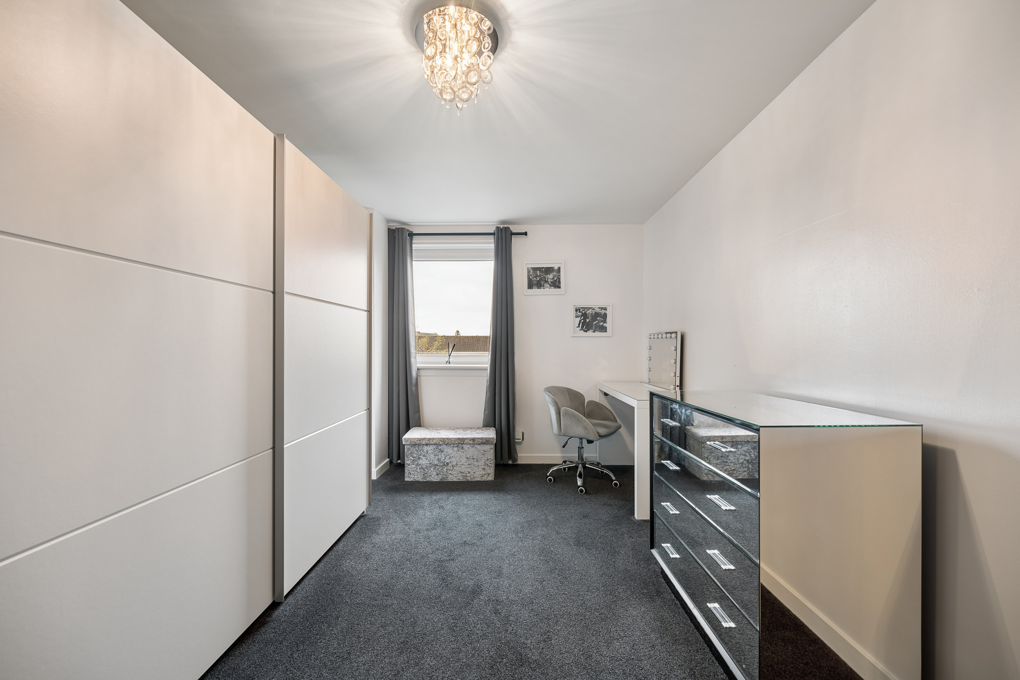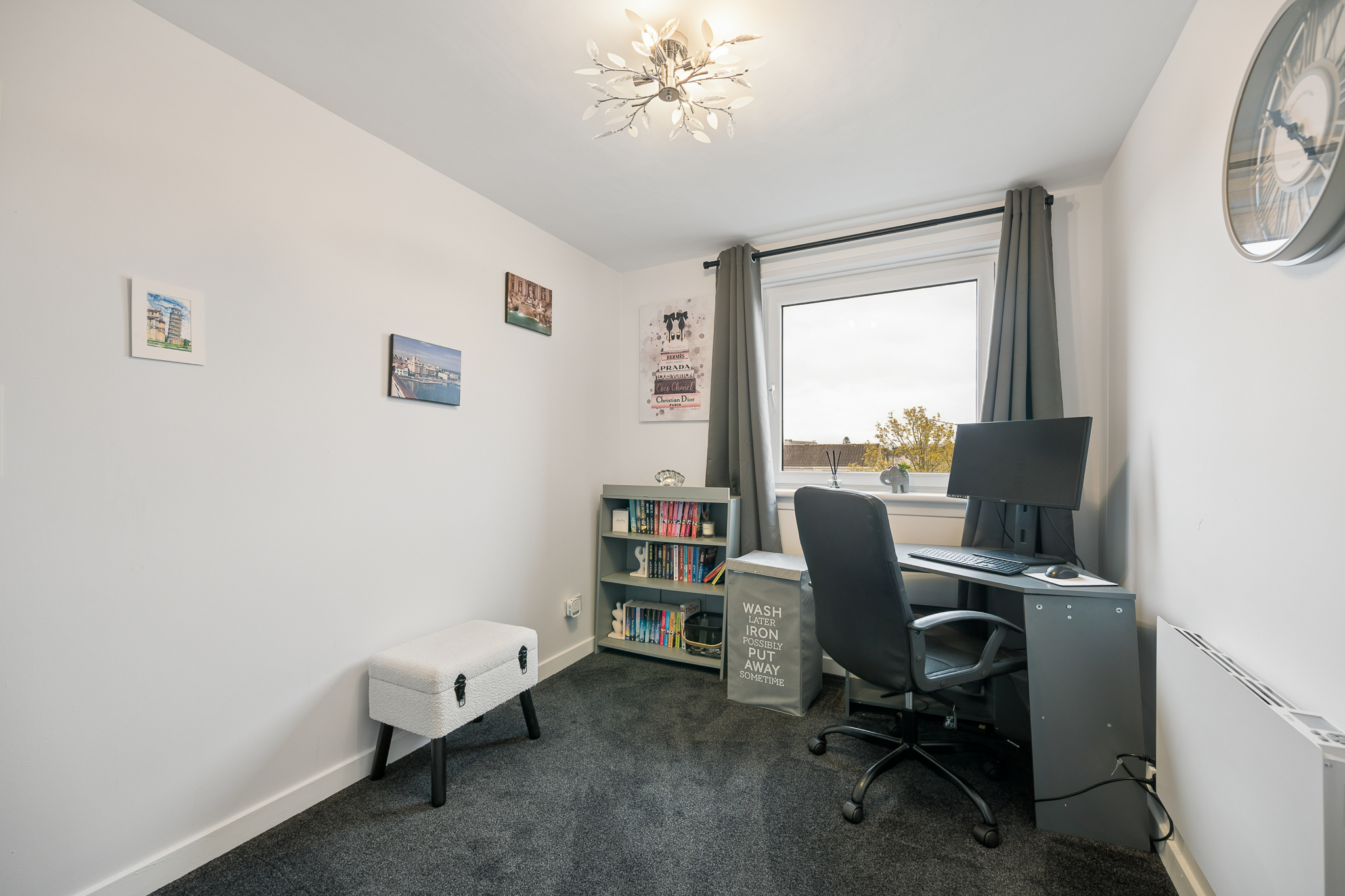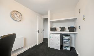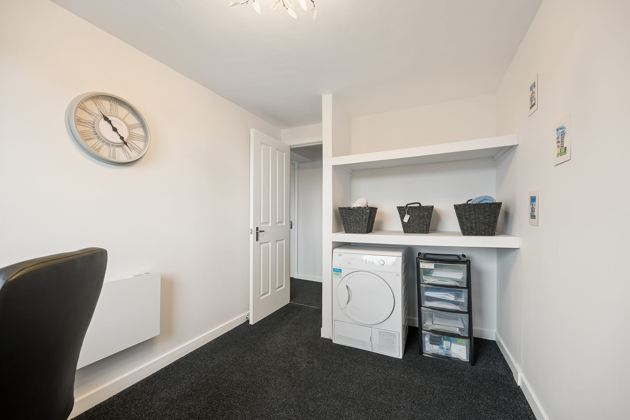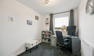 Moving along the corridor, you will find Bedroom Two, currently utilised as a home office. This is a versatile room that could easily adapt to suit a range of needs, whether as a guest bedroom, dressing room or children’s room. The space is bright and well proportioned, with the same fresh finishes and carpeting continuing through, ensuring a cohesive feel throughout the home.