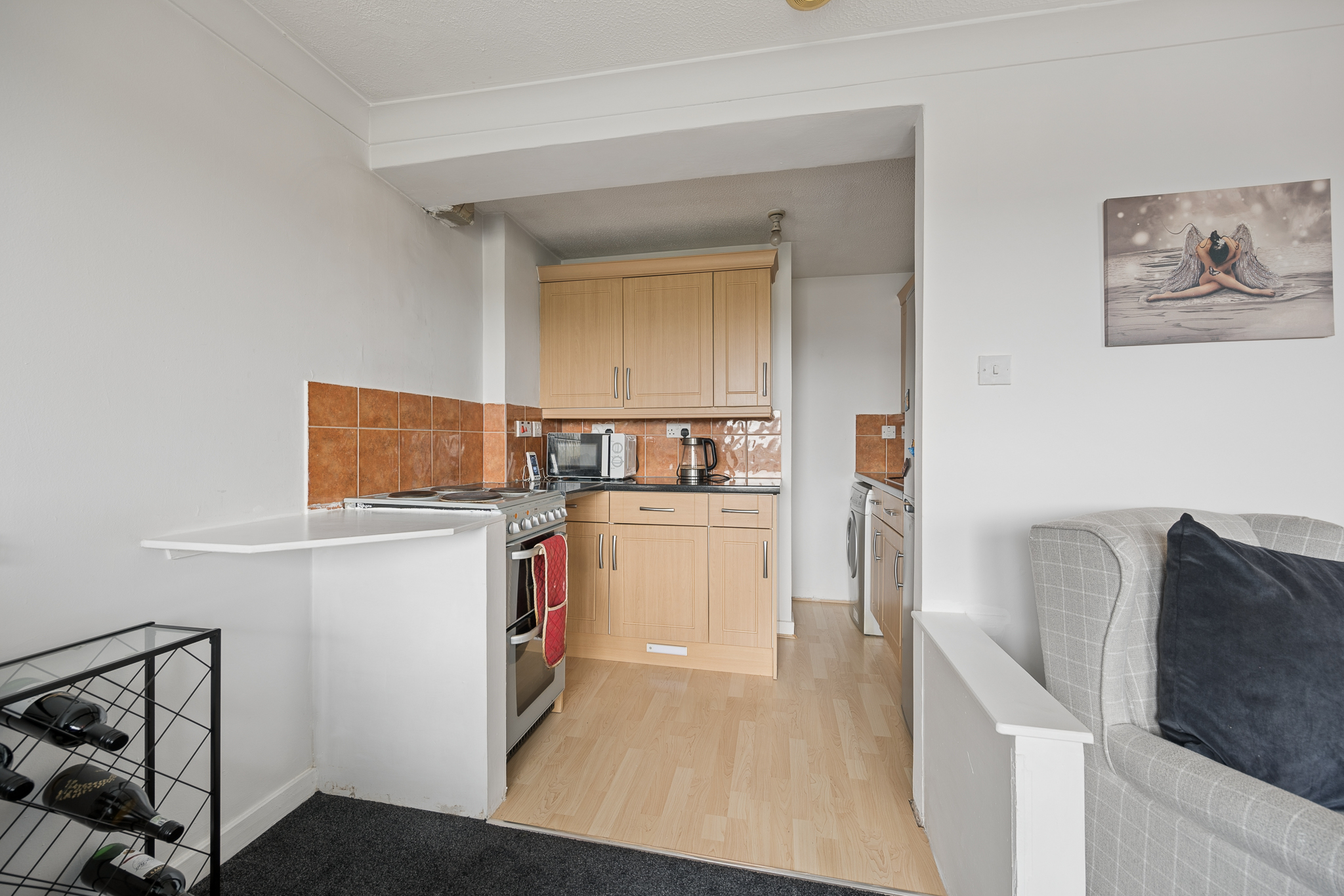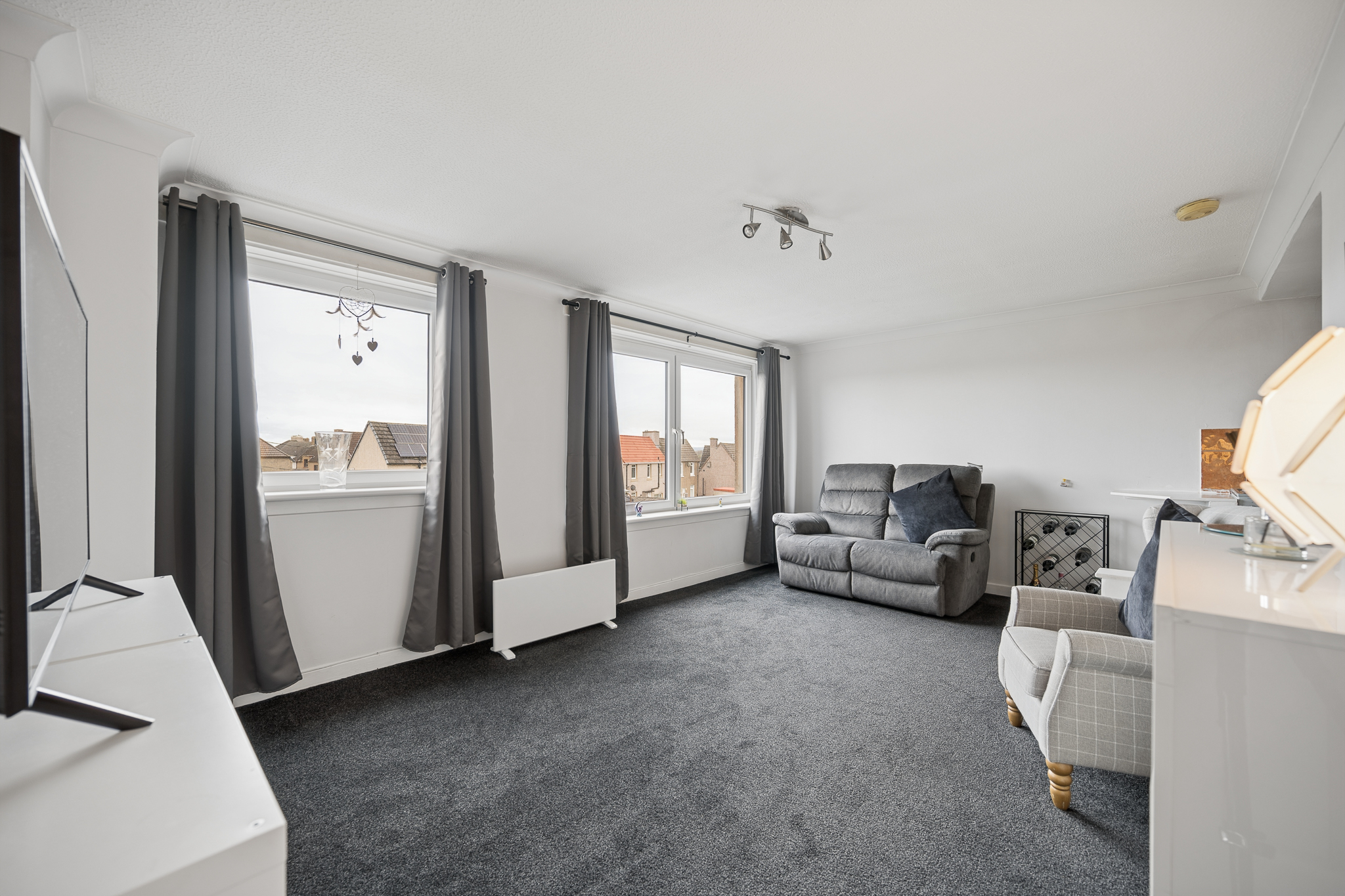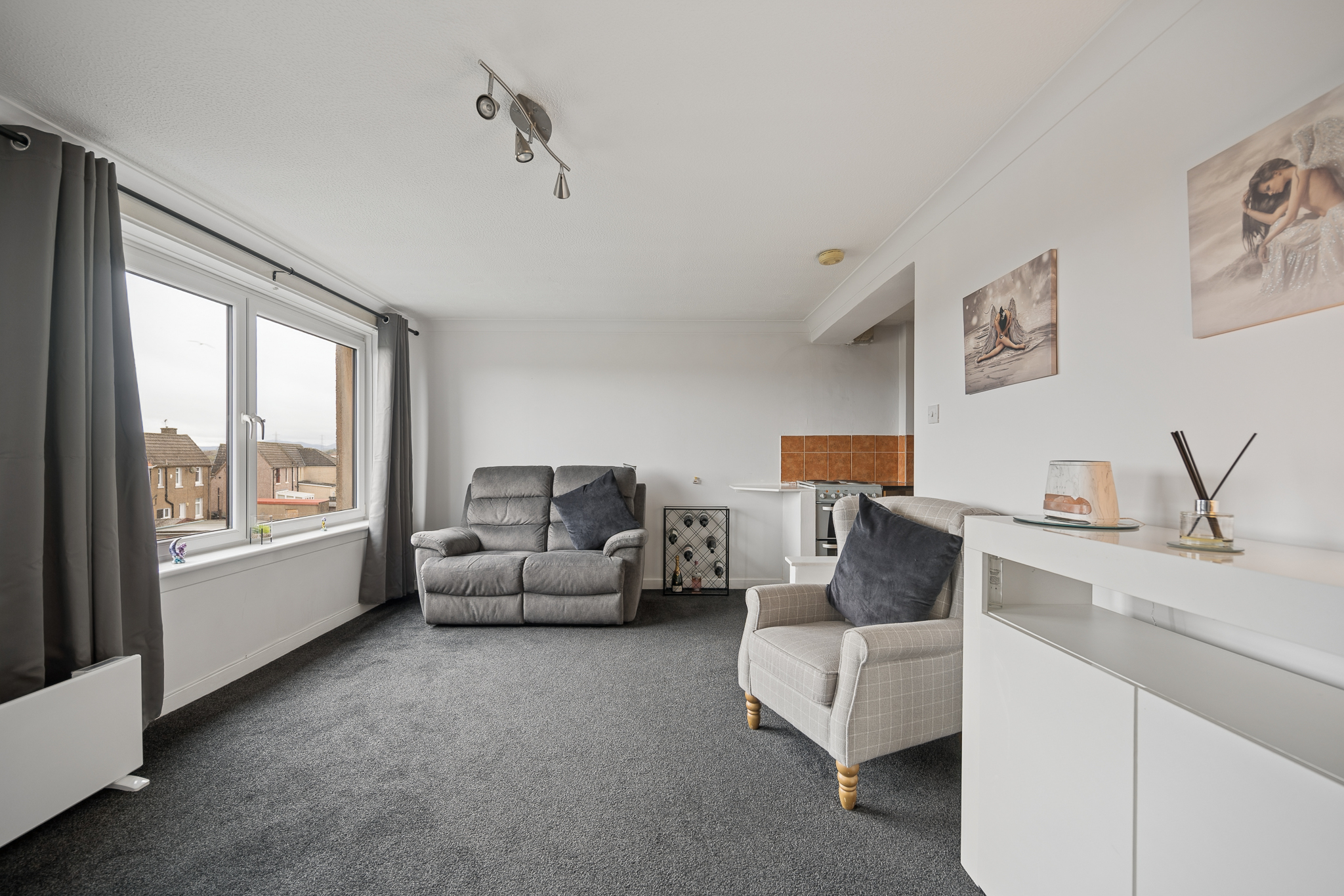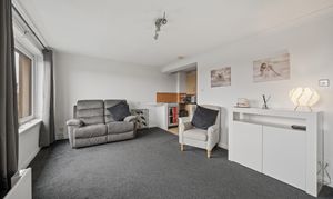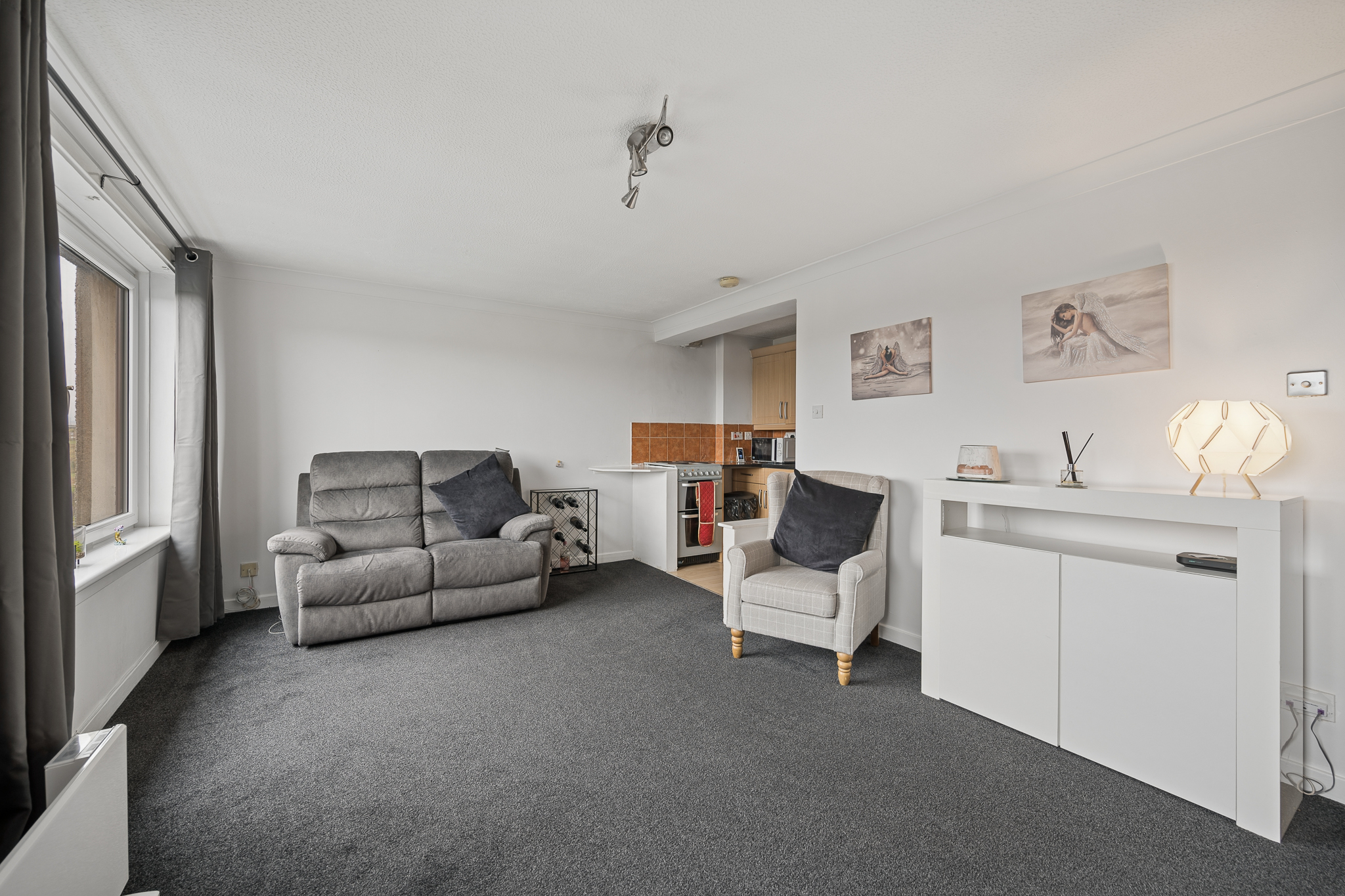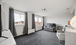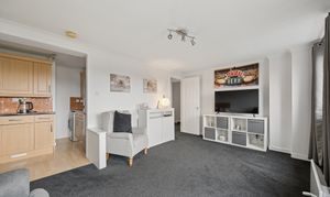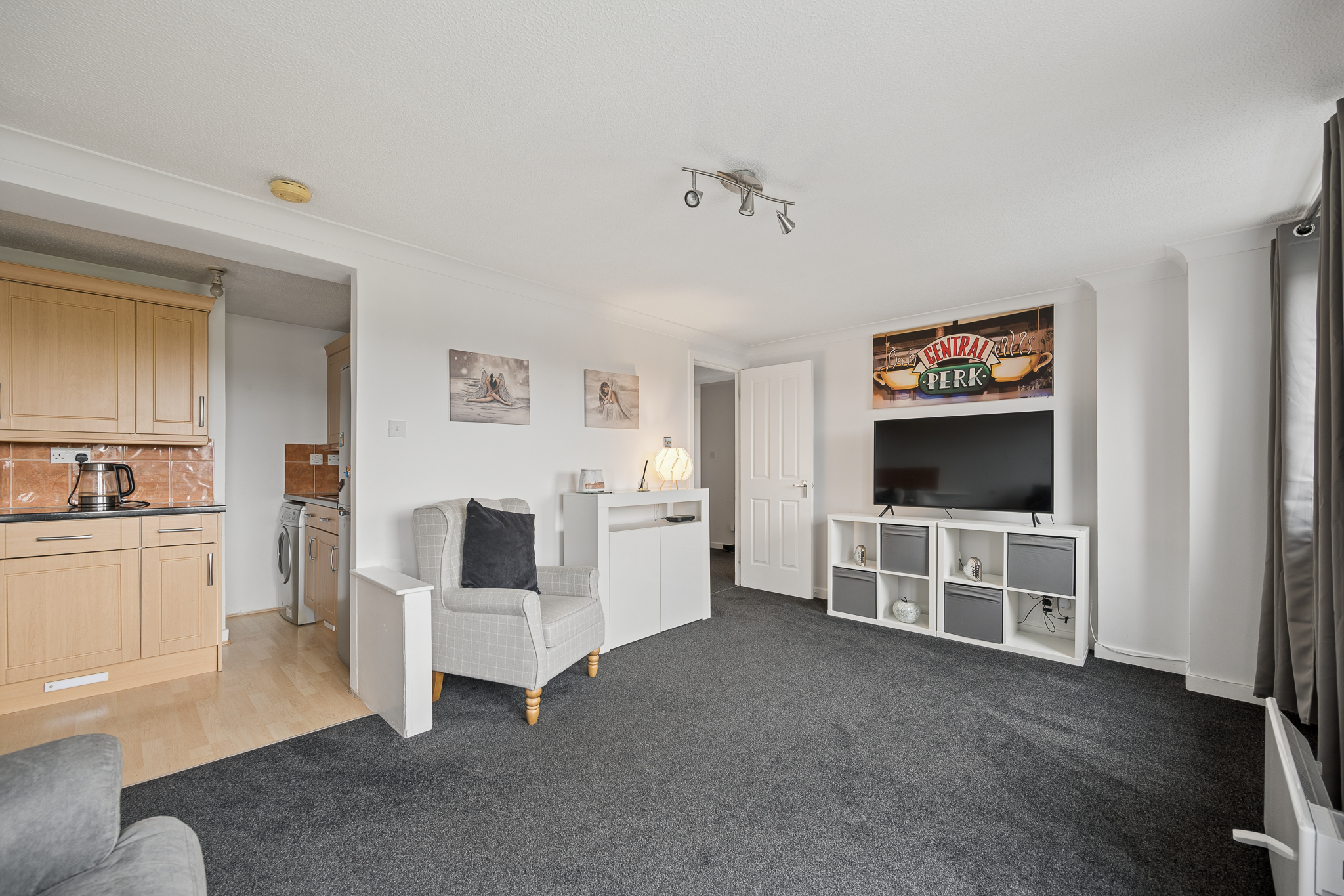 This impressive room is flooded with natural light thanks to dual aspect windows, dressed with soft grey curtains that complement the fresh décor. The living area itself provides excellent floor space for a variety of furniture layouts, centred around a contemporary media unit, while the plush carpeting adds warmth and comfort underfoot. The kitchen sits neatly adjacent within the same open environment, fitted with a range of light wood effect cabinetry, contrasting dark worktops and tiled splashbacks. With ample storage, worktop space and room for freestanding appliances, it’s a practical yet sociable space, ideal for both everyday use and entertaining.