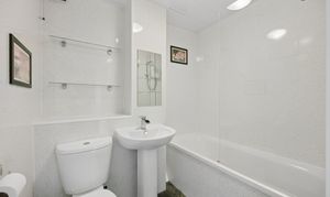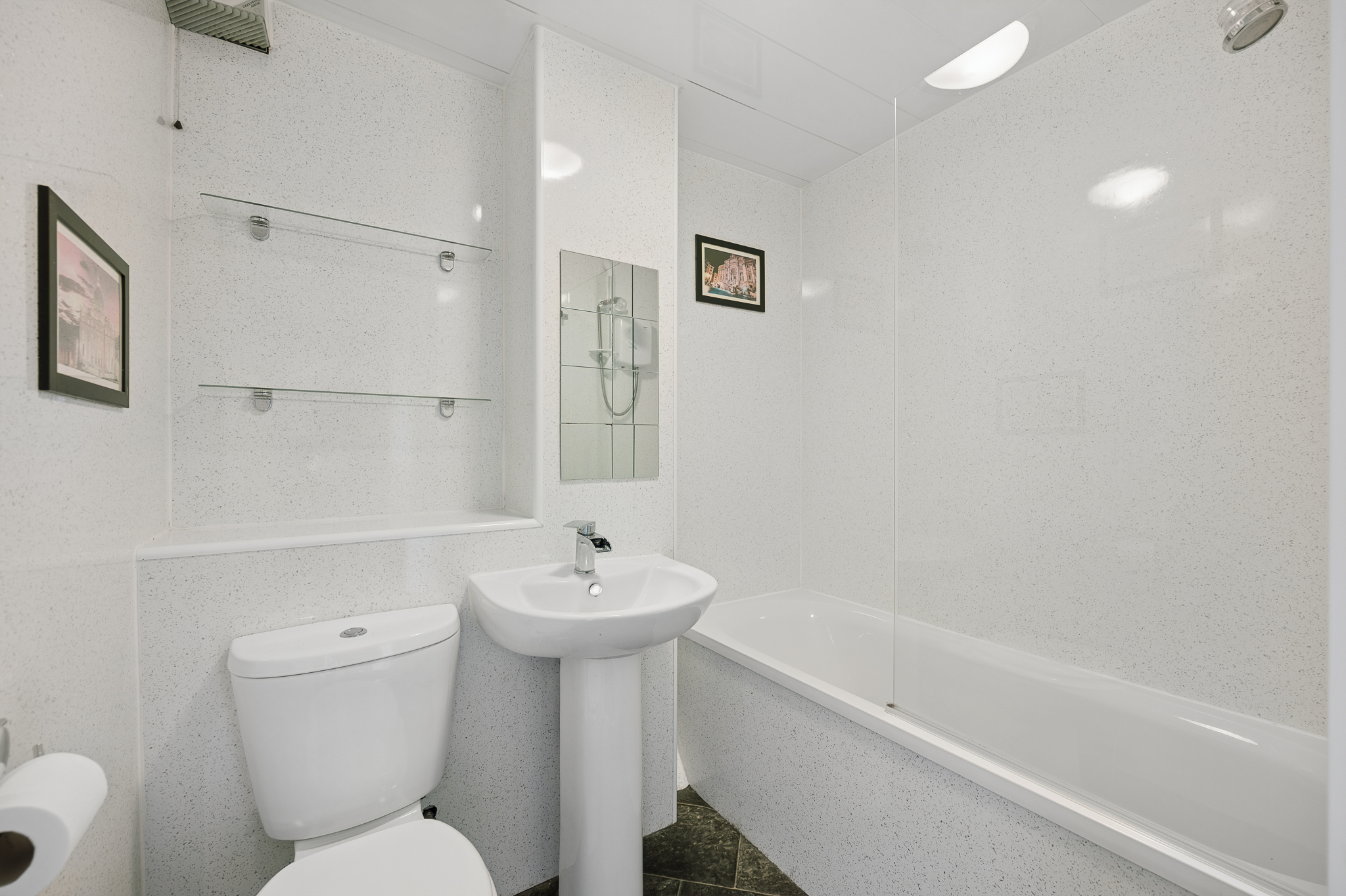 Stepping back out into the hallway and continuing towards the rear of the property, you will find the bathroom positioned at the end. Finished in a clean and neutral style, the space features a three piece suite including a full sized bath with overhead shower, pedestal sink and WC. The walls are lined with easy maintenance wet wall panelling, complemented by dark toned flooring, while built in shelving provides additional storage and display space, making this a functional and tidy room.
