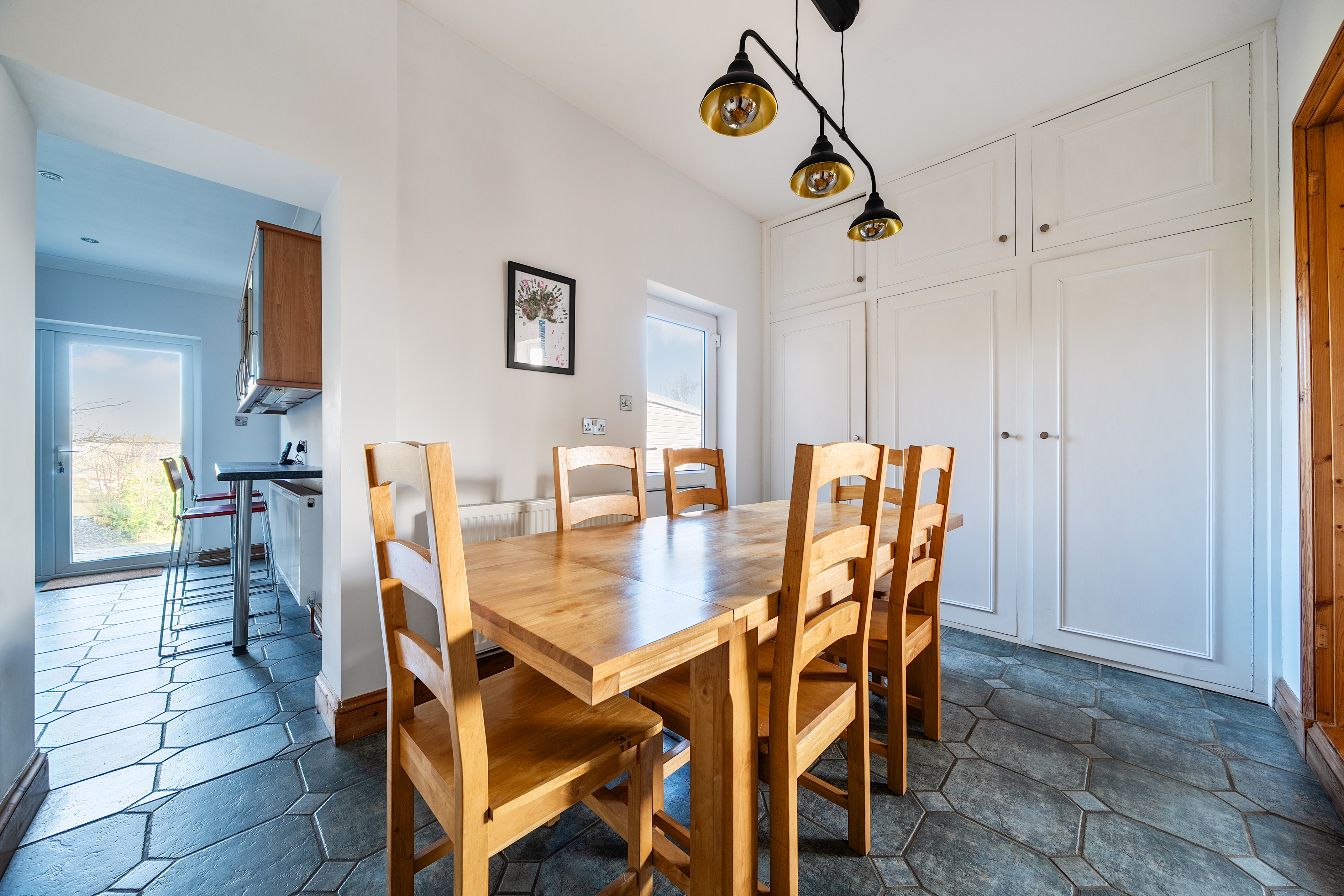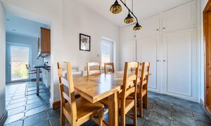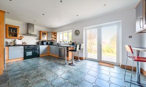 Tiled flooring, a range of matching wall and base units, space for Rangemaster oven with cooker hood over, stainless steel sink with side drainer, large larder cupboard, space and plumbing for dishwasher, two breakfast bars both with space for stools, double glazed patio doors leading onto the garden, double glazed window to rear, radiator. Doors to the dining room and utility room.