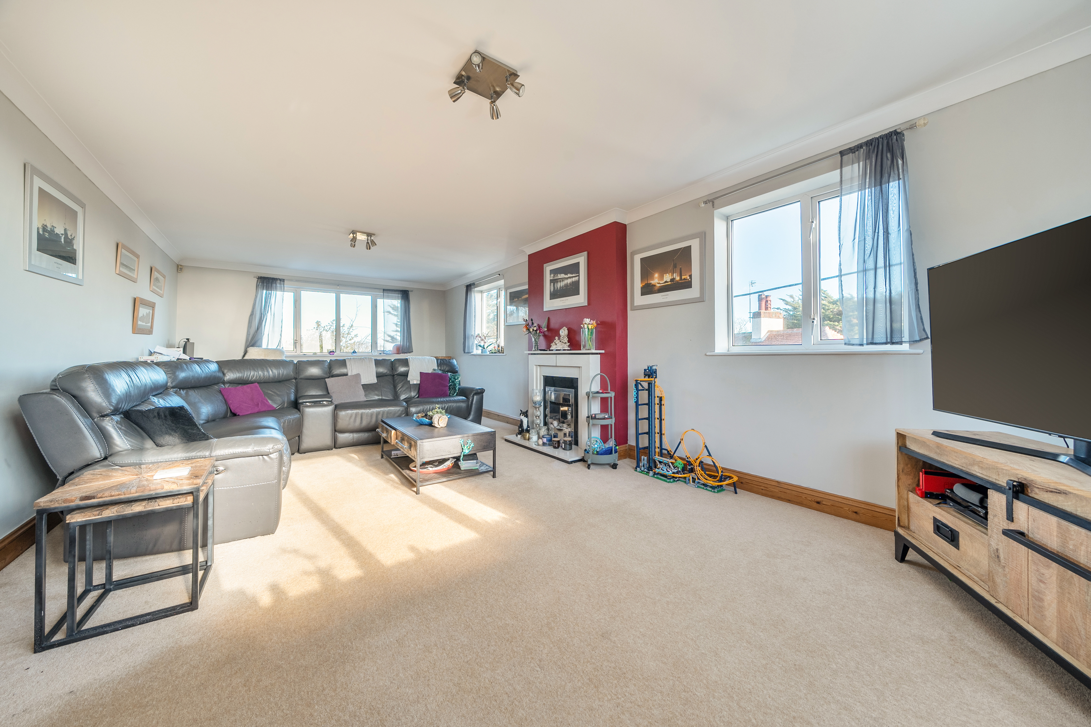 A triple aspect room with carpeted flooring, double glazed window to front with sea views, two double glazed windows to side with sea views and further double glazed window to rear with views over the garden and into the Valley beyond, feature fireplace with stone mantel, two radiators.