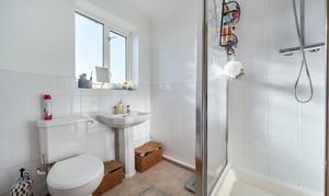 Tiled flooring, double glazed window to front with obscure glass, large shower enclosure, low level WC, wash hand basin, heated towel rail.