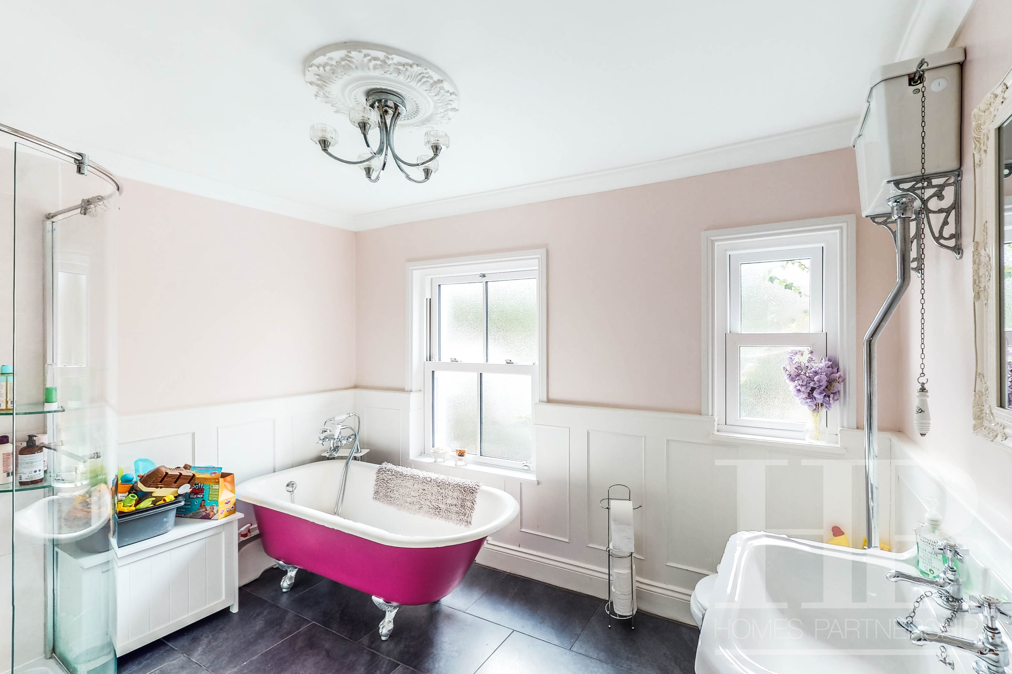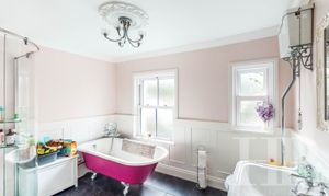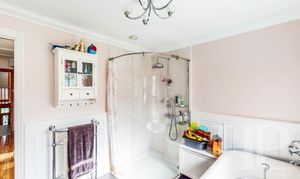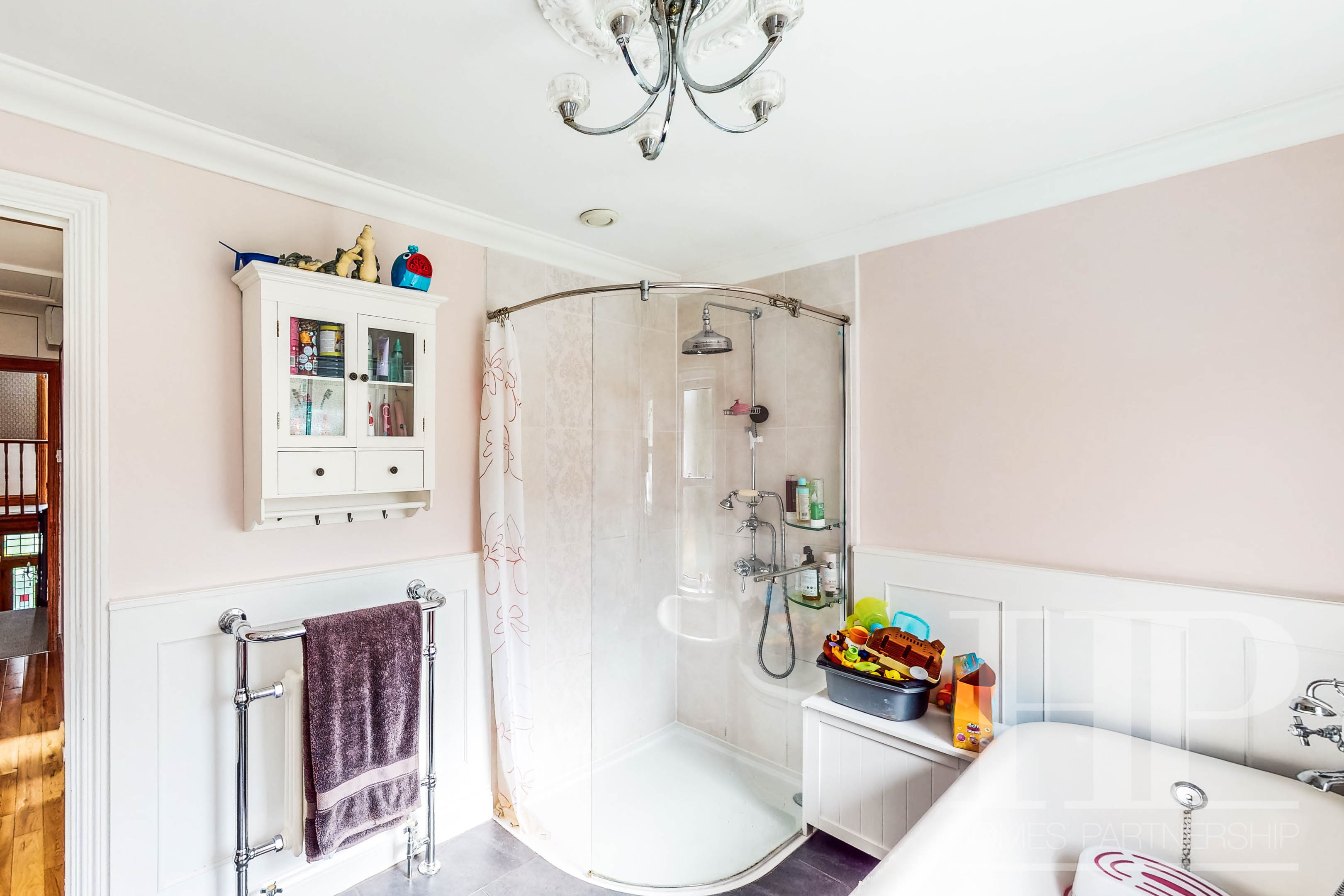 Refitted with a white suite comprising a free-standing bath with mixer tap and shower attachment, a shower cubicle, a high-level WC, and a wash hand basin. Heated towel rail. Radiator/towel rail. Two opaque windows to the rear.