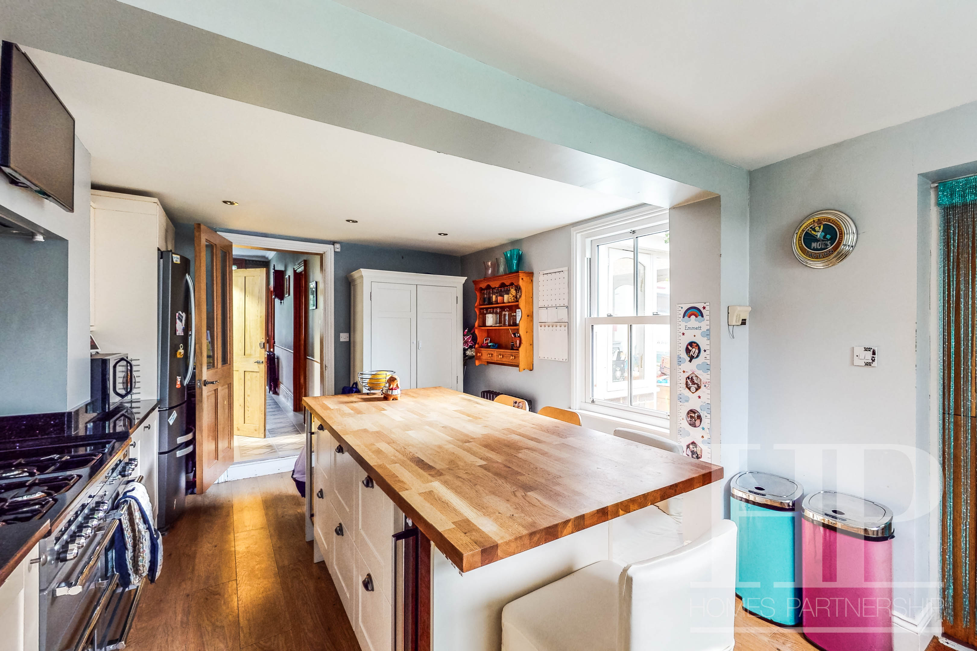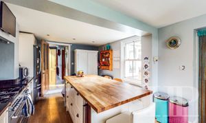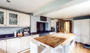 Refitted with a substantial range of wall and base level units with work surface over, incorporating a double butler sink, with a mixer tap. Central island with storage drawers and seating. Space for American-style fridge/freezer, range cooker, with extractor hoods over, washing machine, and dishwasher. Radiator. Dual aspect with two windows to the rear and a window to the side. Stable door opens to the side.