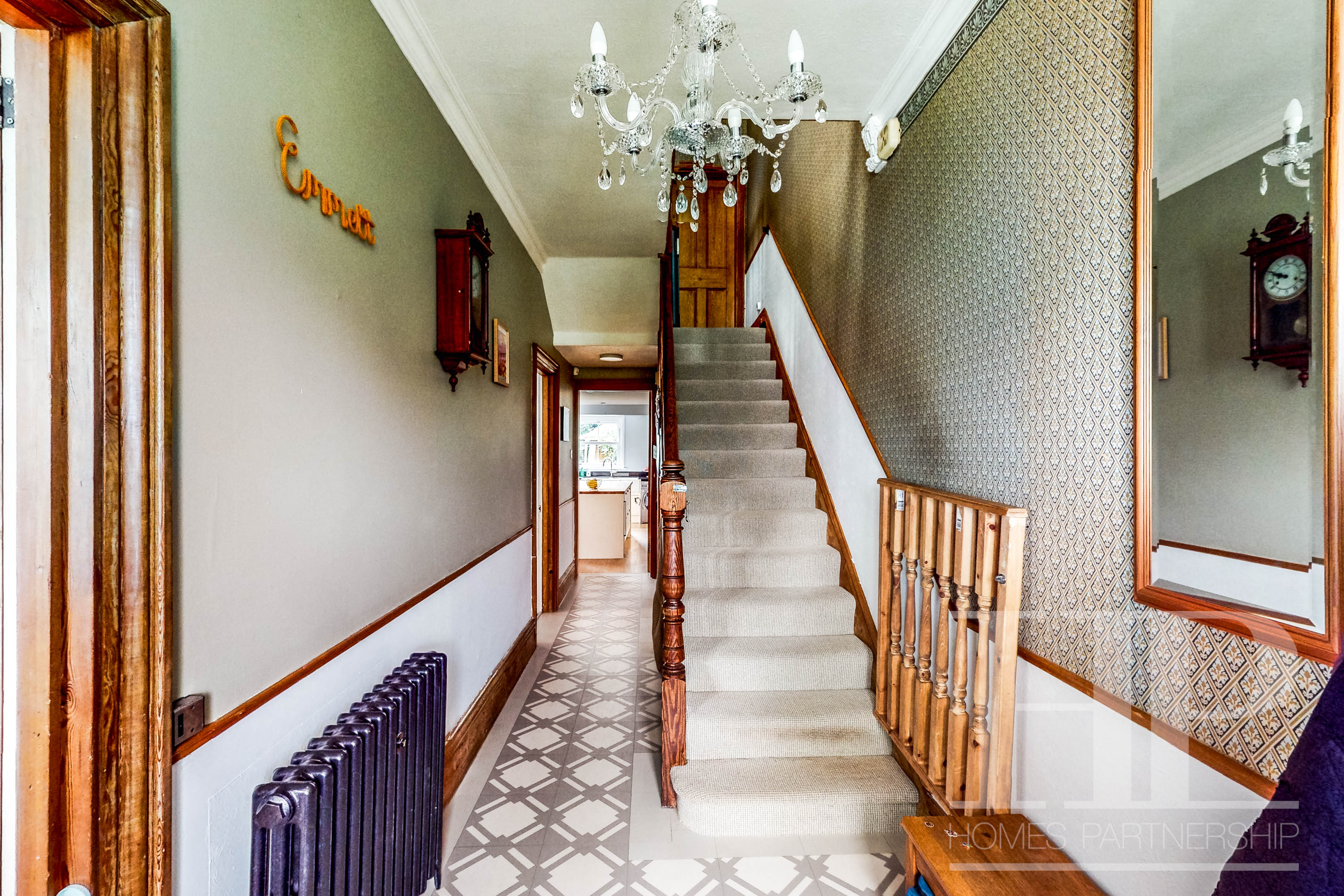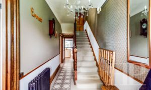 Stairs to the first floor. Radiator. Under stair storage. Doors to kitchen/breakfast room, cloakroom, and: