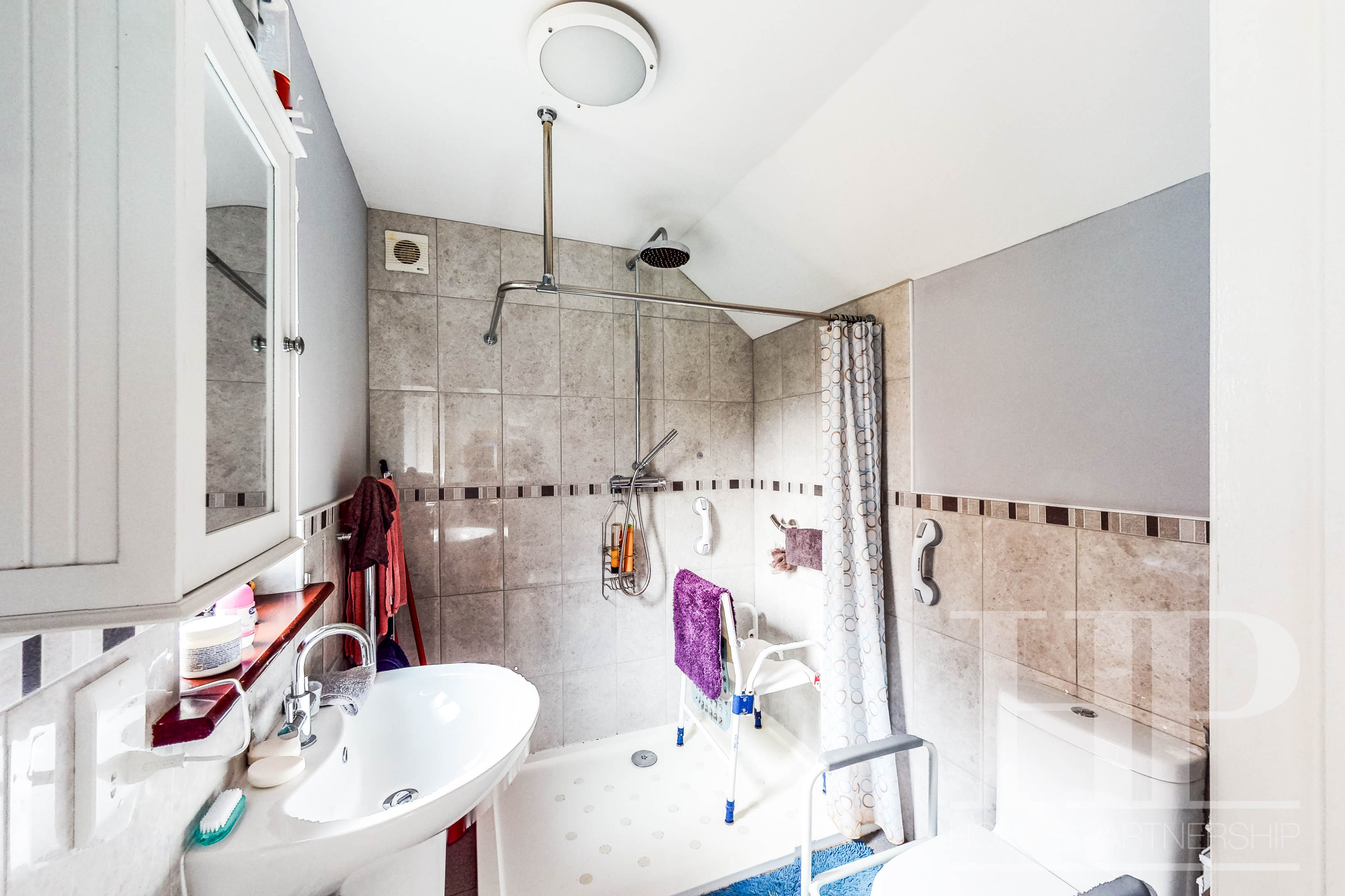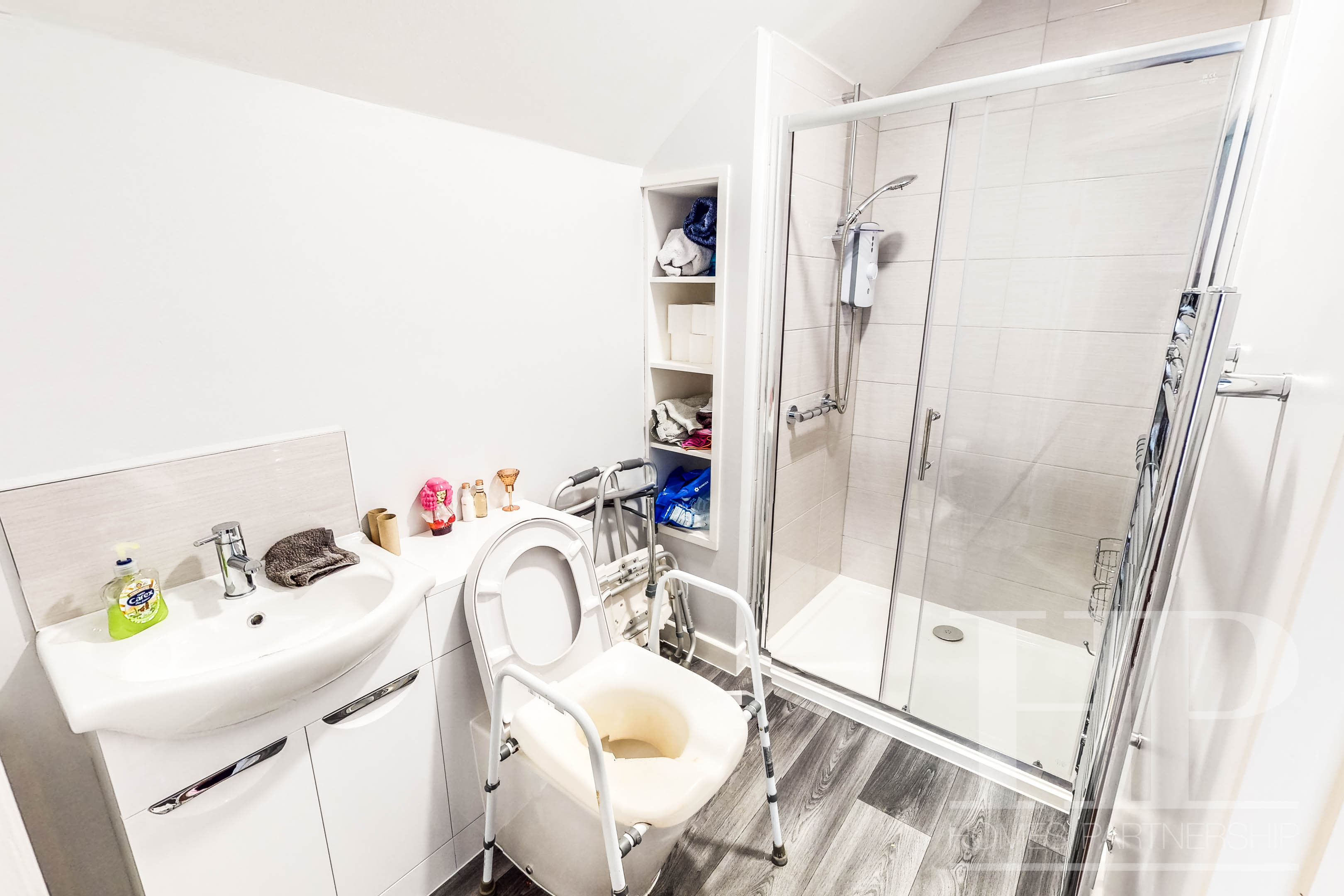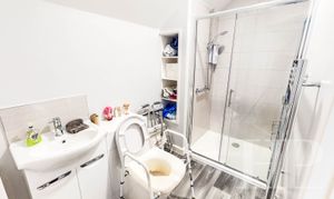 Refitted with a white suite comprising a low-level WC, a wash hand basin, and a shower cubicle. Heated towel rail. Extractor fan. Opaque window to the side aspect.
