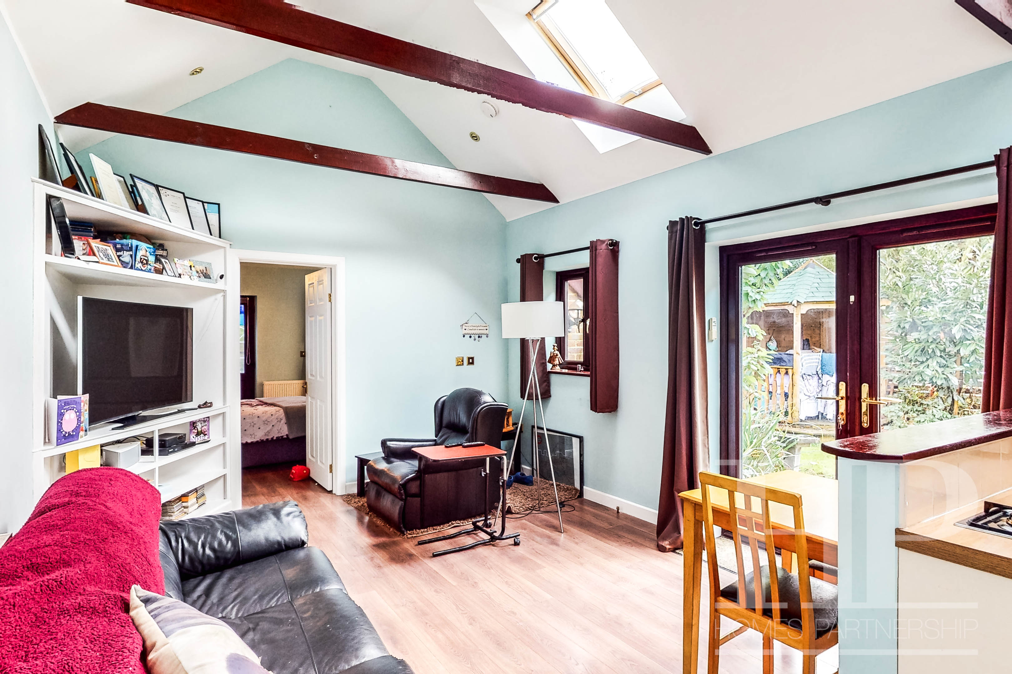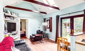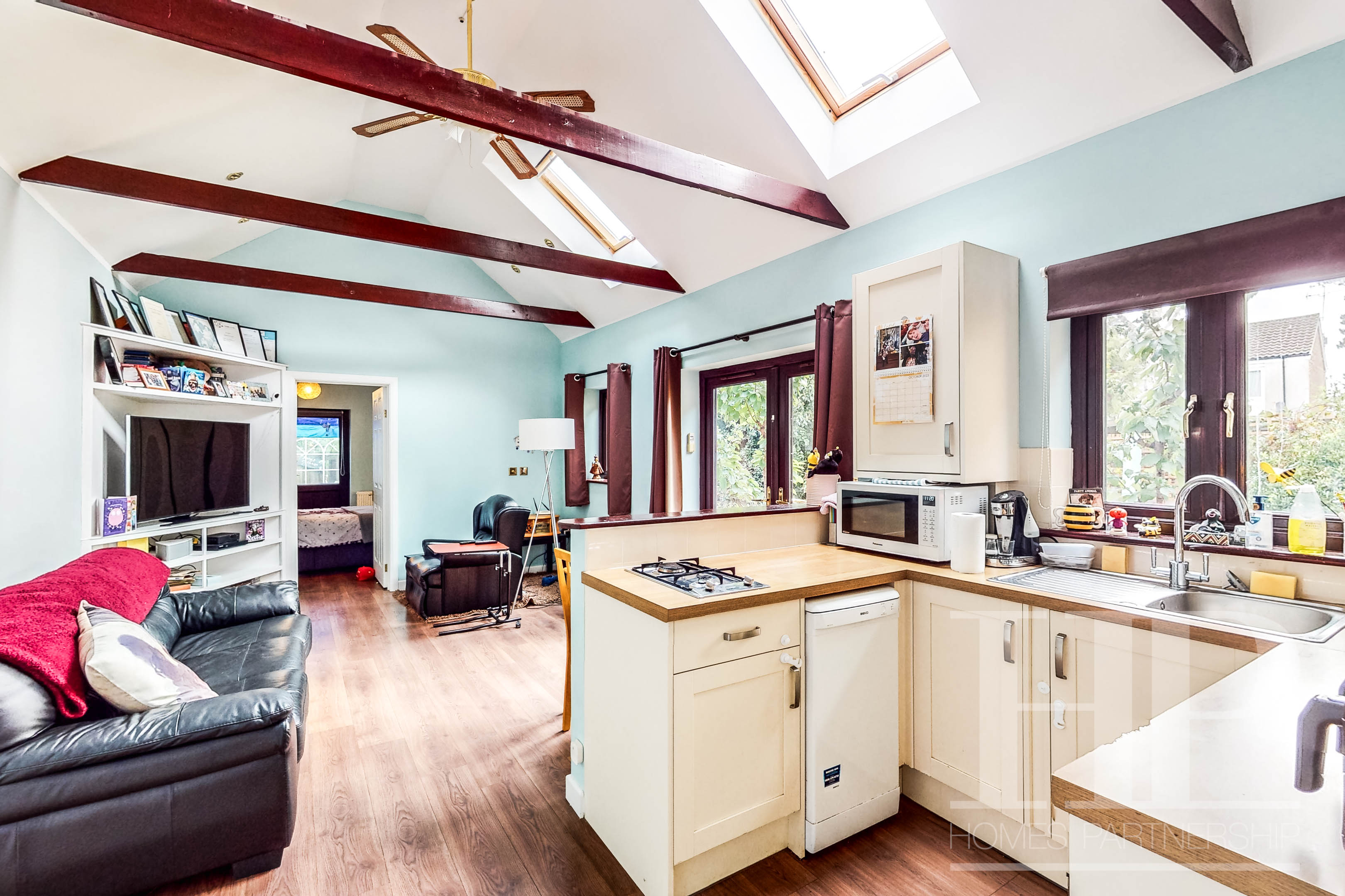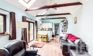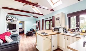 Open plan lounge/kitchen area. Kitchen area fitted with a range of wall and base level units with work surface over, incorporating a single bowl, single drainer, stainless steel sink unit with mixer tap. Cupboard housing boiler. Two-ring gas hob. Space for fridge/freezer, and washing machine. Radiator. Exposed beams. Two windows to the side aspect. French doors open to the side. Two Velux style windows. Door to:
