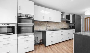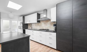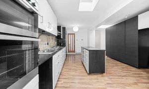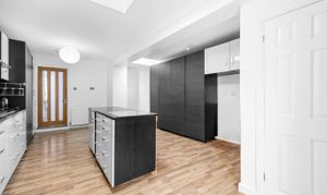 At the rear, a stunning 22’10” kitchen-diner forms the heart of the home. The design maximises space and light, featuring sleek cabinetry, integrated appliances, and ample countertop space for family cooking and entertaining.
