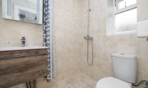 Conveniently located off the kitchen, this modern shower room features a walk-in shower, wash basin, and WC — ideal for guests or busy mornings.