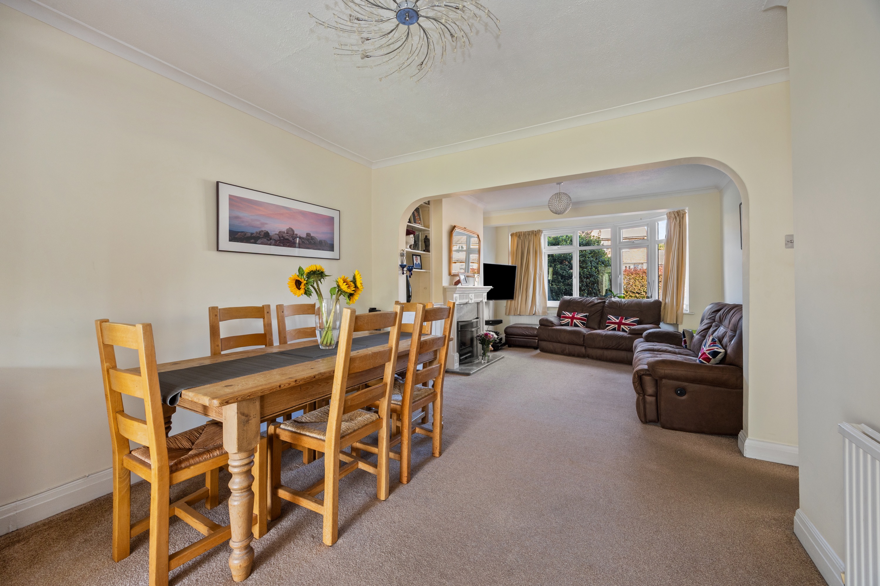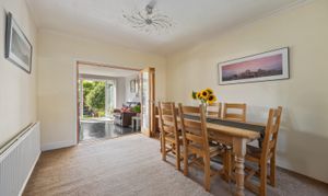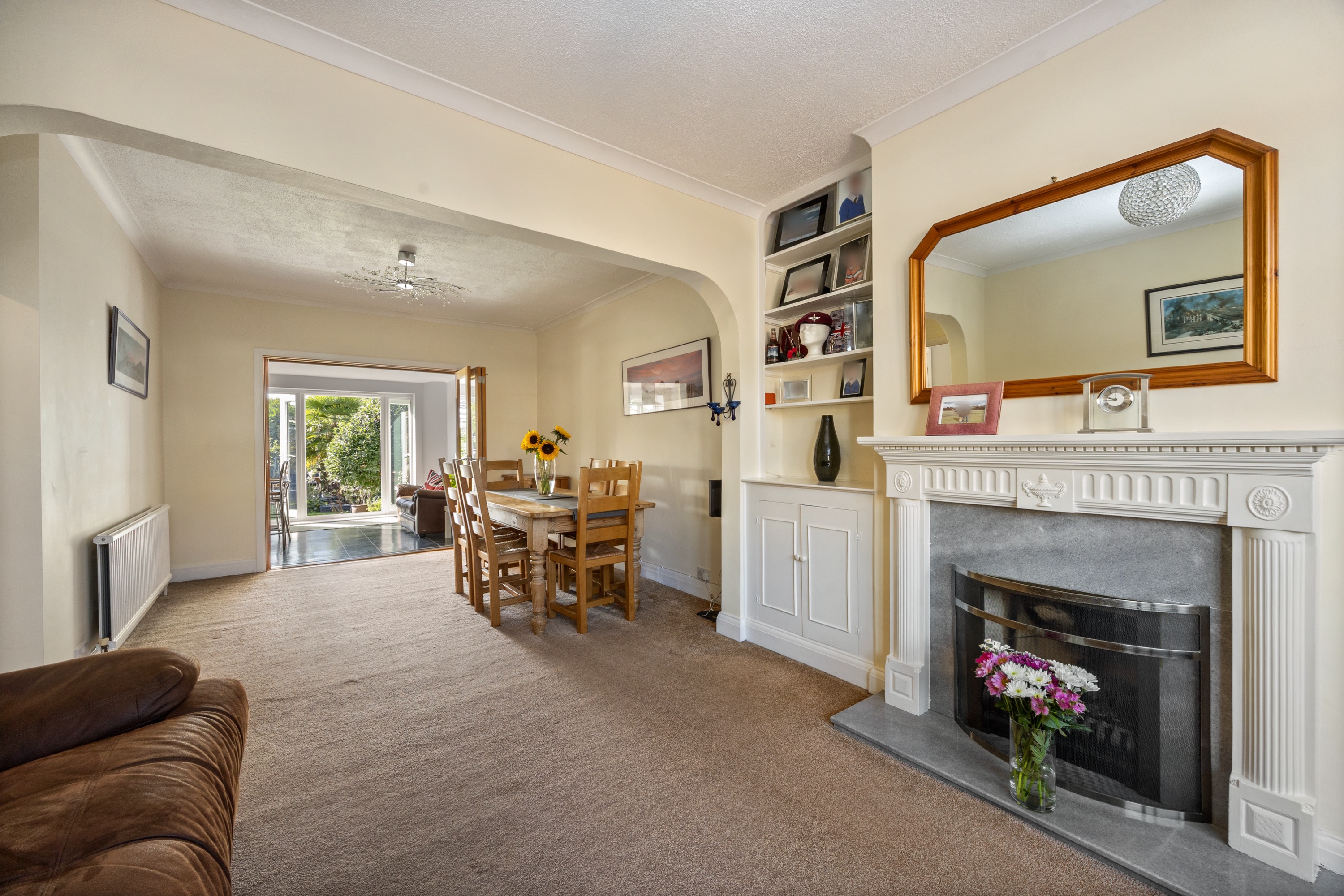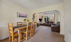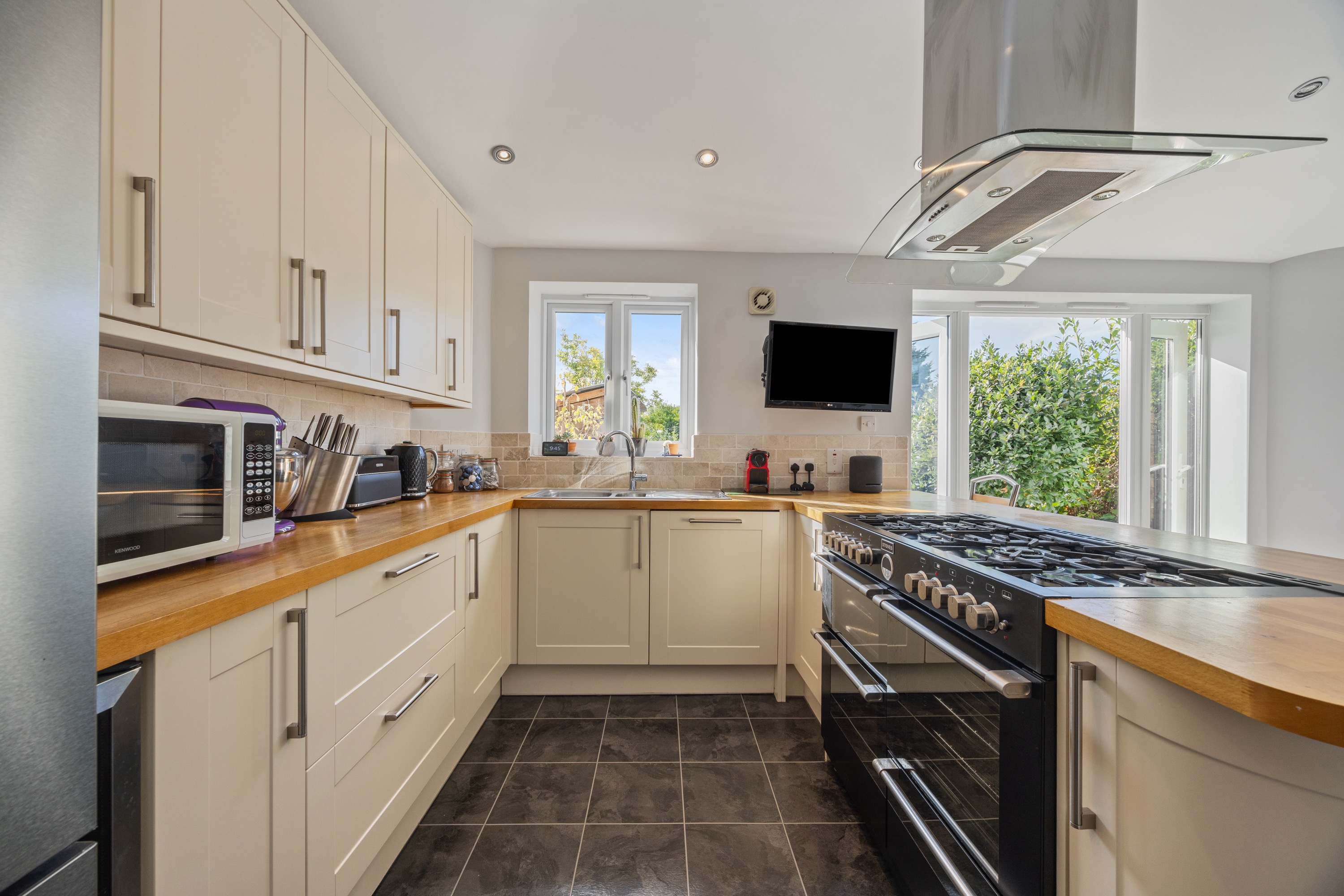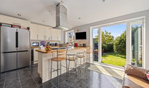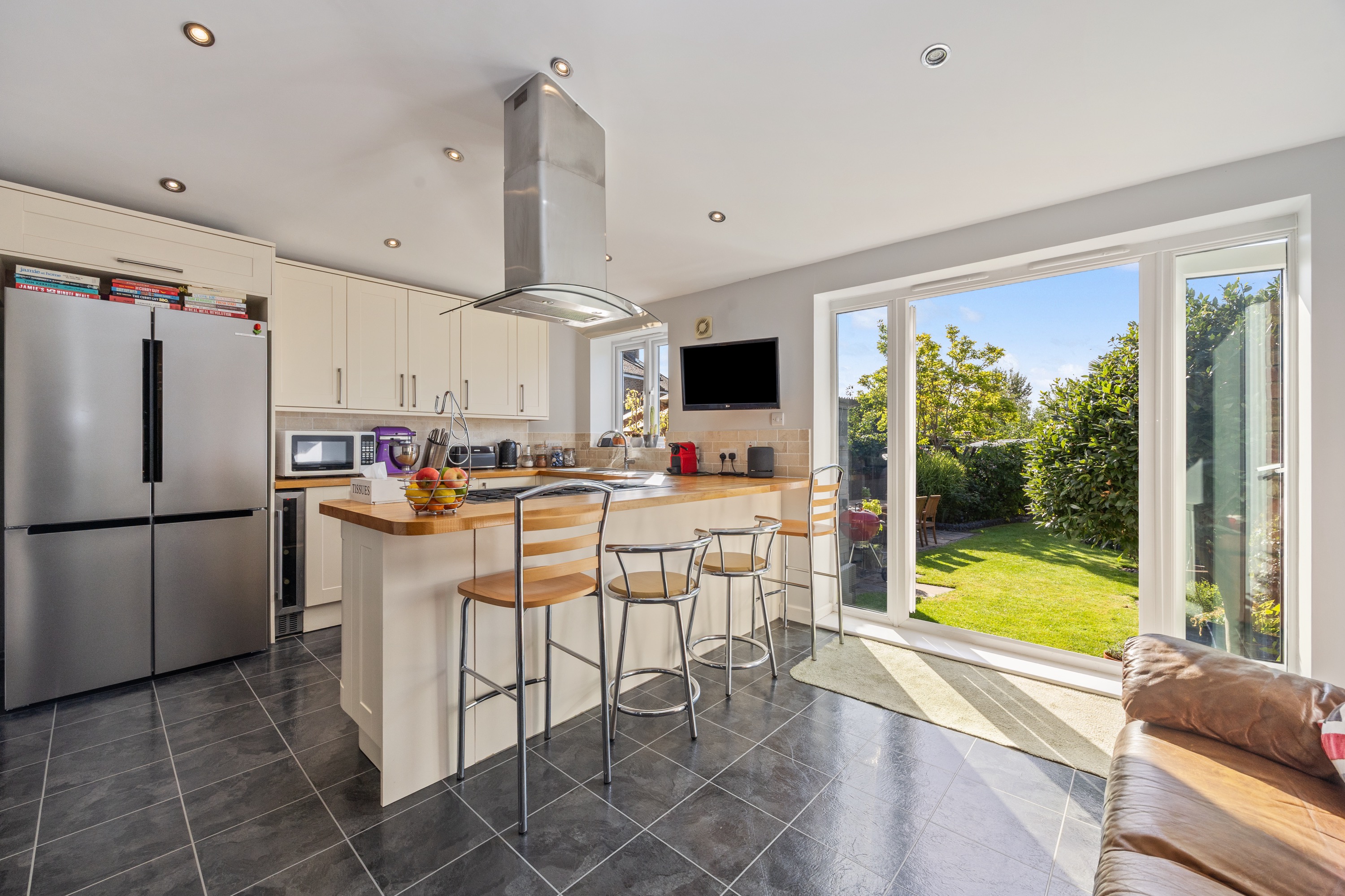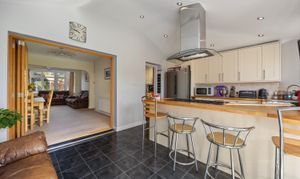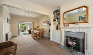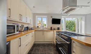 Upon approach to the property, there is a large driveway with ample parking, garage with electric roller door and a tasteful original arched door to the property. Entering, there is a spacious hallway with access to the living room, cloakroom and stairs to first floor. The cloakroom is a good size with a modern w/c, wash hand basin and window to side. The living room is set to a large L-shaped kitchen/diner/living room where it has been extended and remodelled. The living space, is a good size, with ample room for multiple family sofas and freestanding furniture. There is also a lovely bay window to front and feature fireplace. The kitchen/dining room is a bright and airy space, with vaulted ceilings with modern wall and base units, fitted appliances, Rangemaster oven and space for an 8+ person table. There are also doors to the utility room and bi-folding doors to the garden.