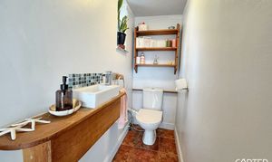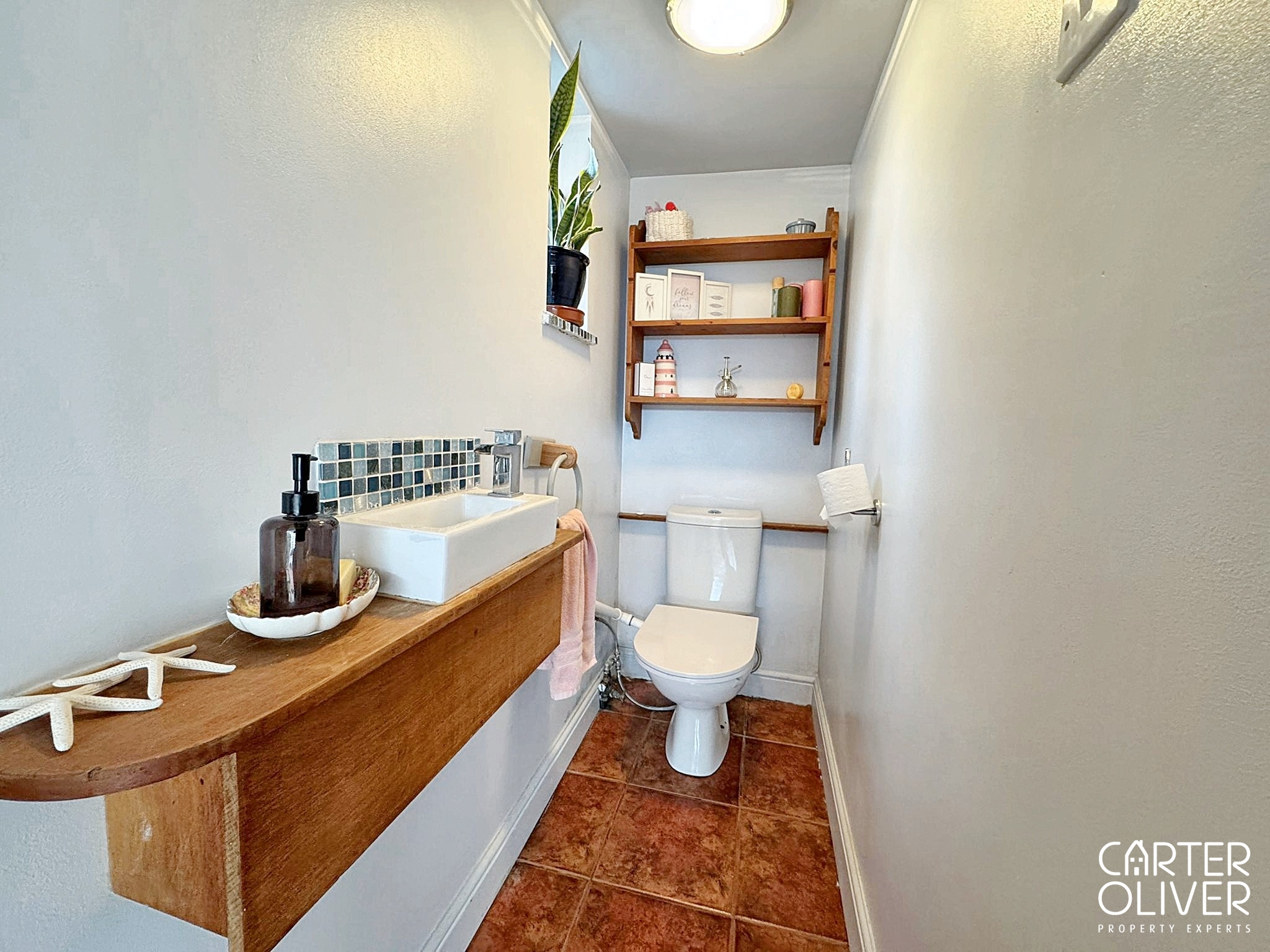Tiled Floor, with low flush WC, floating white wash hand basin and set in a wooden countertop.