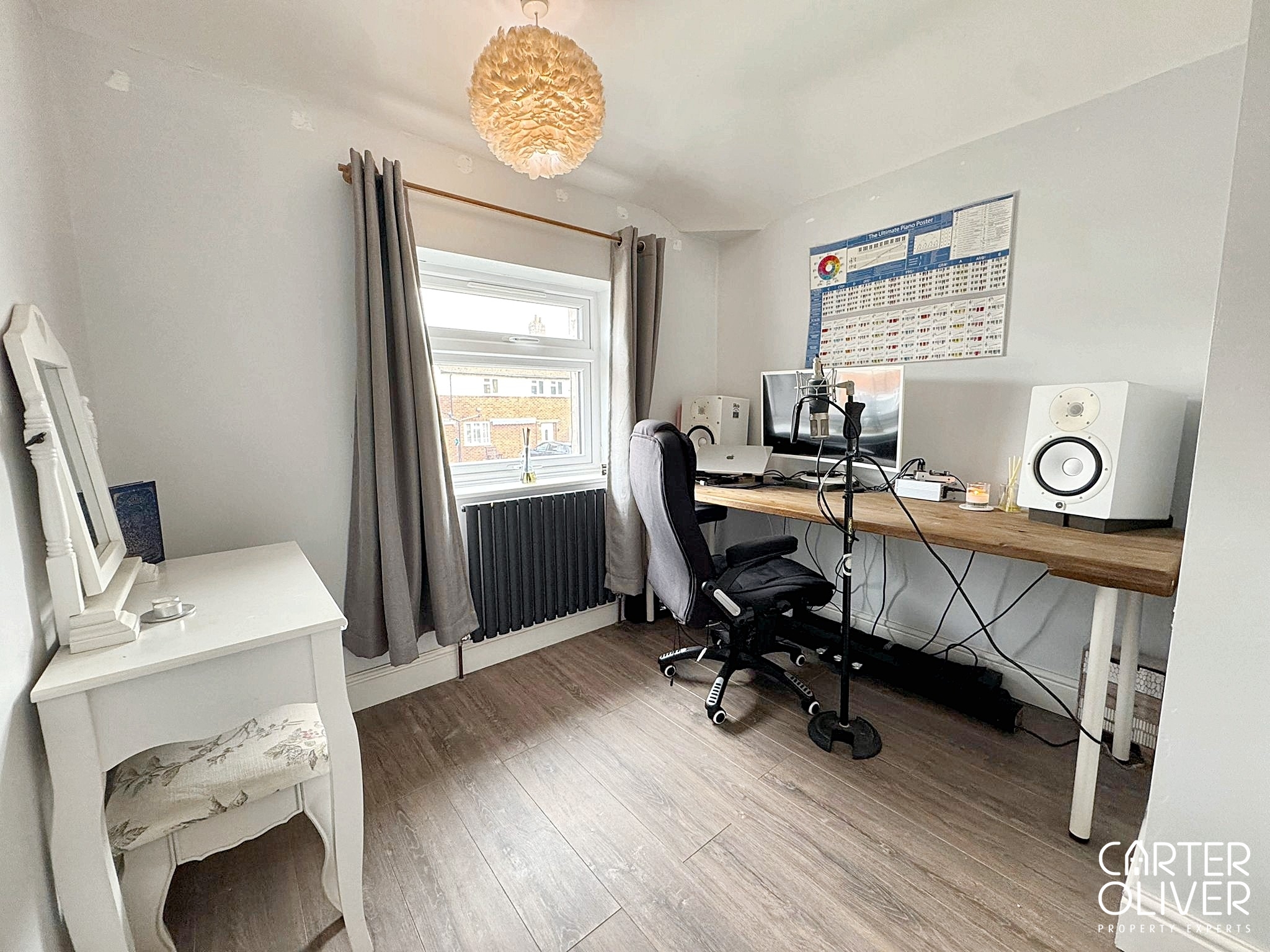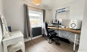 A good size single, currently being used as a home office / studio, with a wood effect laminate floor and new radiator to match the house theme.