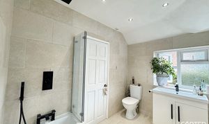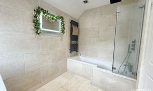 This Bathroom has been recently refurbished, to give it a modern and stylish new look, with a P shaped bath and black accent shower features finishing off the theme, With a smart mirror you don't only get a built in backlight it also has a bluetooth feature.