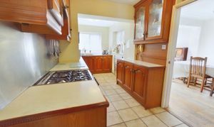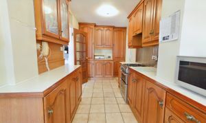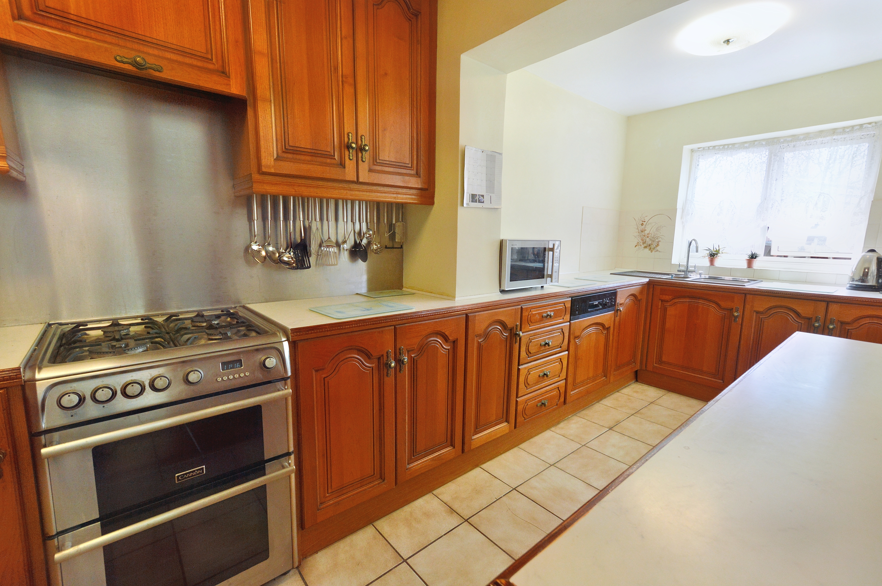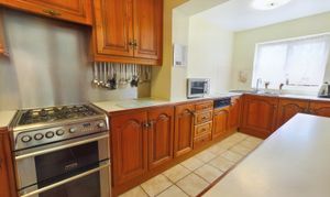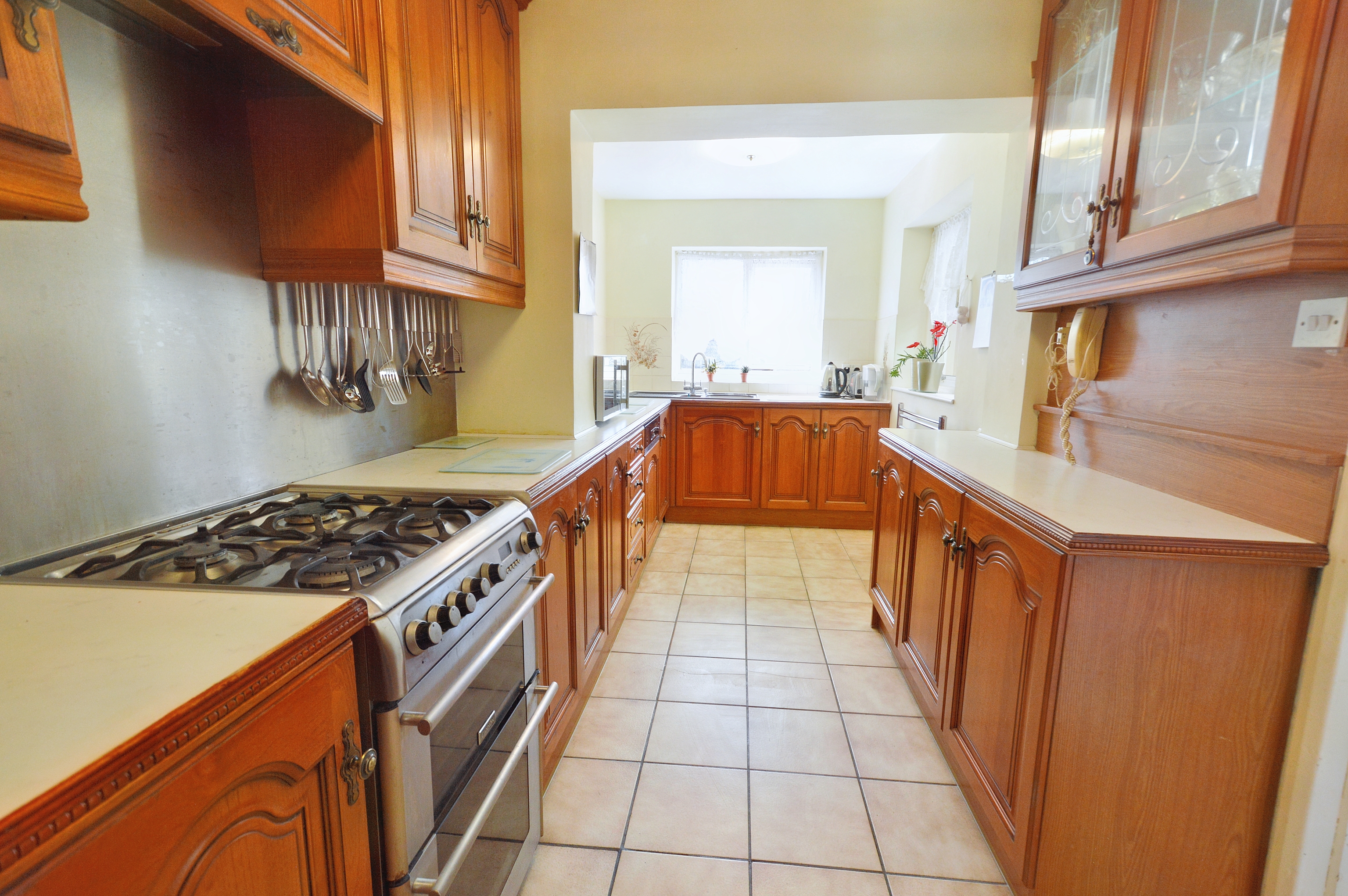 Double glazed window to rear with views overlooking the superb garden, a range of base and eye level units with integrated Bosch dishwasher, fridge/freezer, recess for a cooker with extractor fan above, built in cupboard housing a combi boiler which the vendor has advised is 3 years old, gas and electric meters, enamel sink unit with mixer taps inset to worktop, smooth plastered ceiling, wall mounted glass cabinet, telephone point, heated towel rail and tiled floor, obscure double glazed door to side leading to carport