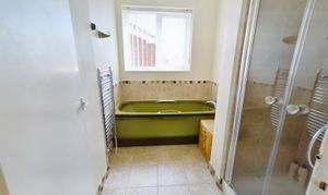 Obscure double glazed window to side, panelled bath with mixer taps, walk in shower cubicle, heated towel rail, smooth plastered ceiling, wash hand basin with mixer taps and tiled splashbacks, medicine cupboard.