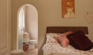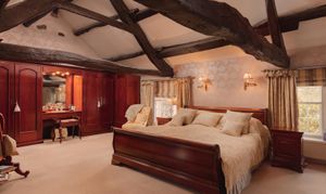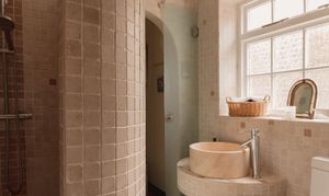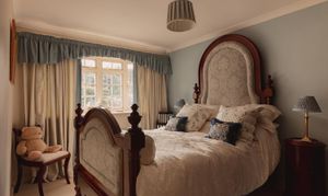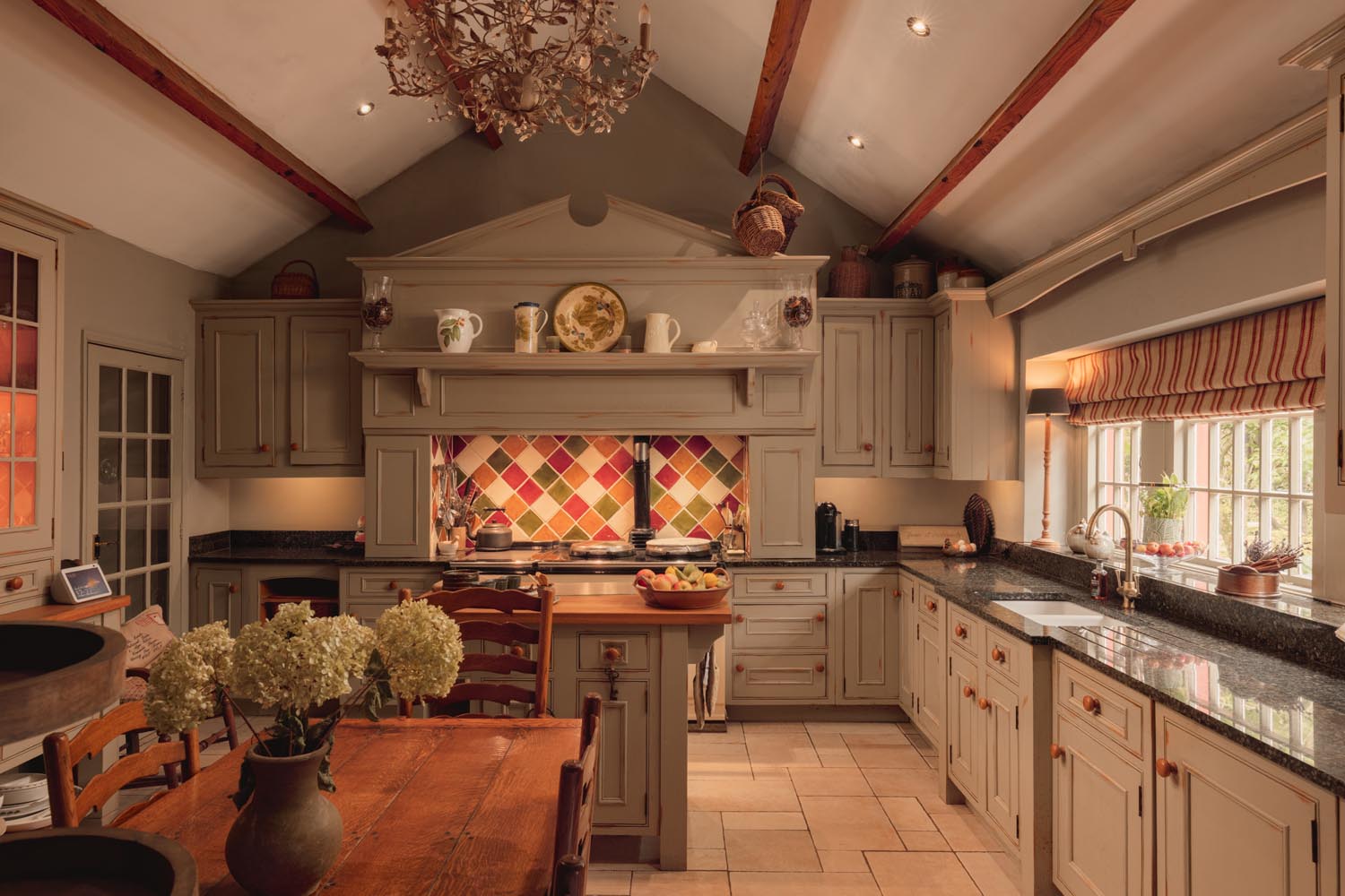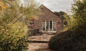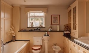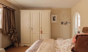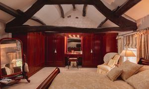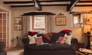 Upstairs, the principal bedroom is a generous space with a vaulted ceiling, exposed beams and fitted wardrobes, served by an en-suite shower room. Two further double bedrooms are well proportioned, one featuring expansive glazing with doors that open directly onto a pretty, private patio area. These bedrooms share a thoughtfully designed family bathroom, with fitted cabinetry and traditional fixtures, while a rear-facing window fills the space with soft natural light.