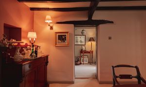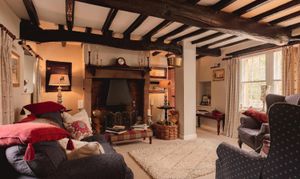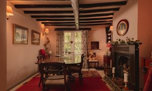 From the kitchen, a rear hallway leads to the garden and contains the staircase to the first floor, with a WC and shower room providing convenient facilities. To the right of the kitchen, a separate dining room with exposed beams and a period fireplace creates an inviting setting for formal occasions. This room opens to a living room, a quiet space with an open fire and a garden outlook, then continues to a home office with a door to the front garden, useful for work, study or a calm reading spot.