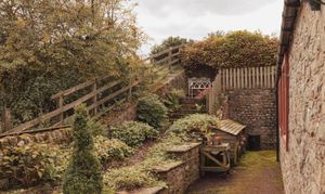 A double garage and broad driveway provide secure parking, enclosed by a traditional stone wall and gates, with ample additional space for visitors. The gardens are a standout feature, wrapping around the house to create a private, richly planted setting. South facing paved seating areas are positioned to follow the sun, ideal for morning coffee and evening suppers, while generous lawns are edged by mature trees and layered borders for seasonal colour and texture. A stream feeds an ornamental pond, linked by a pretty footbridge. Paths draw you through different pockets of the garden, from quiet corners for reading to open areas suited to larger gatherings. The planting has been established to provide privacy without feeling enclosed, and the outlook is towards open countryside, a calm, rural backdrop.