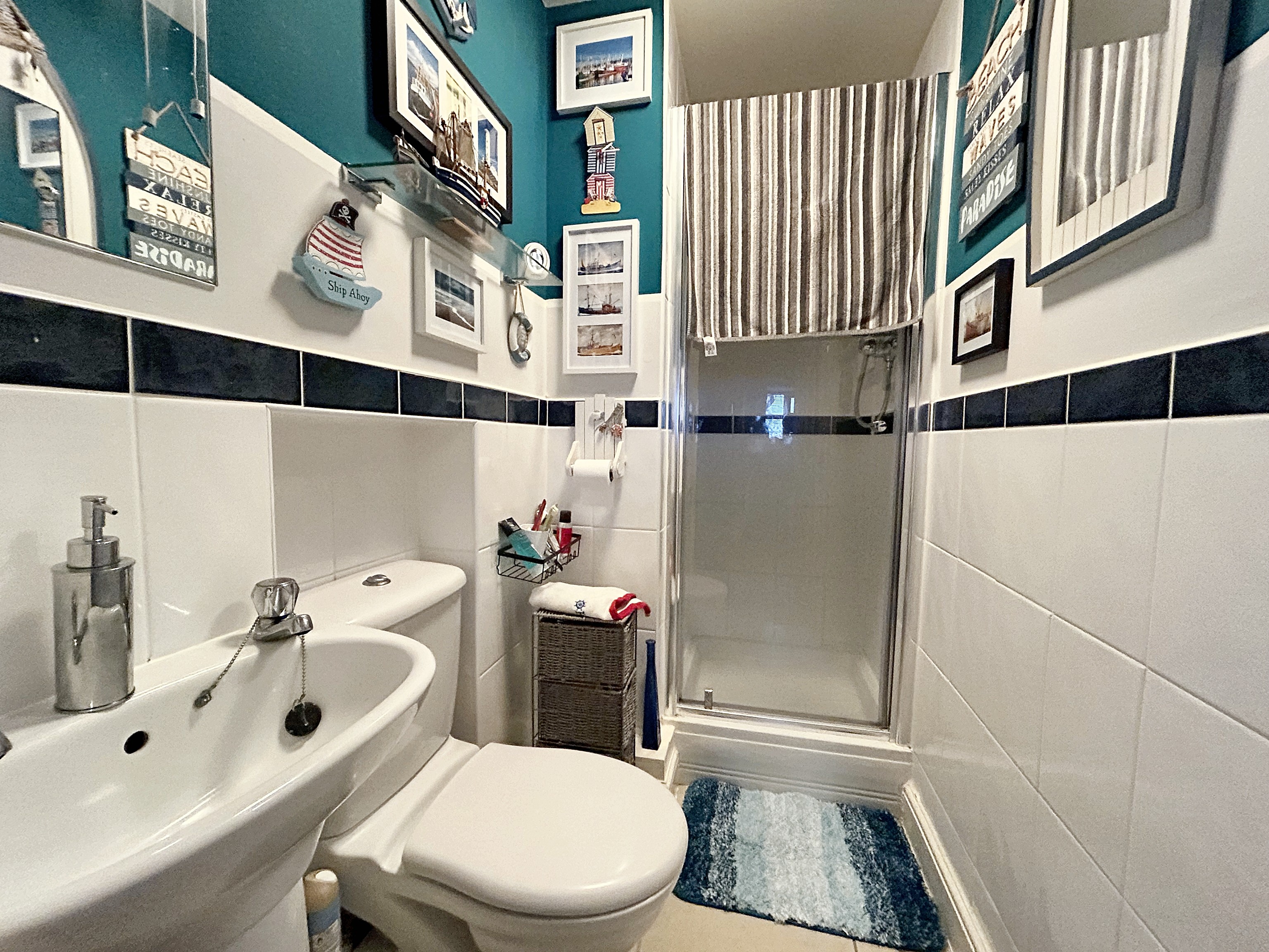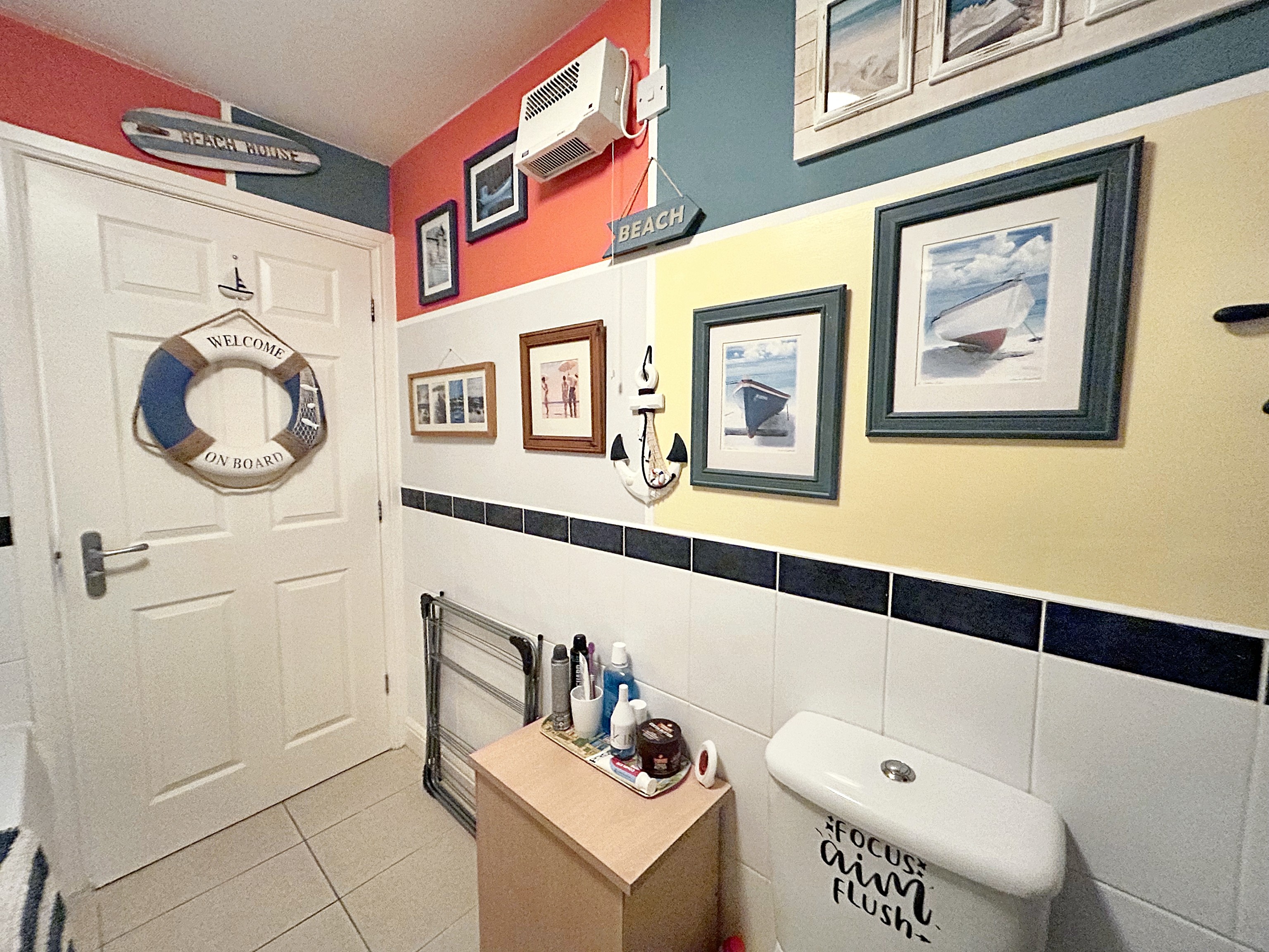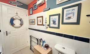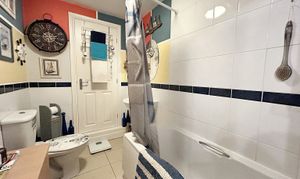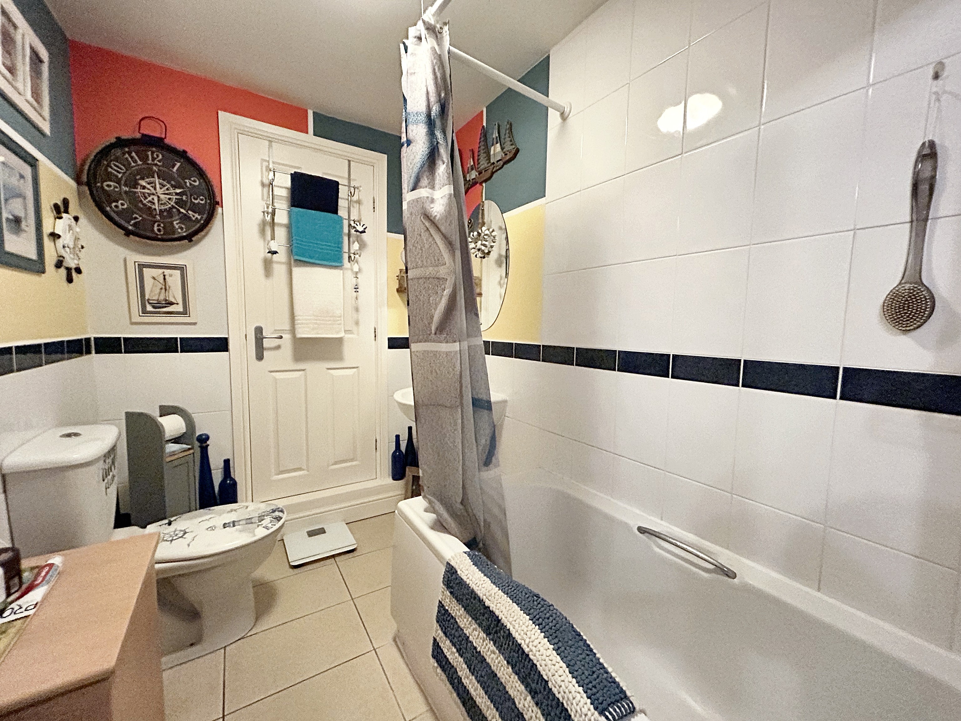 Fitted with a bath with a shower over, a low level W.C and a pedestal hand wash basin. Internal door through to Water Tank storage cupboard.