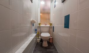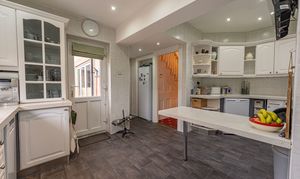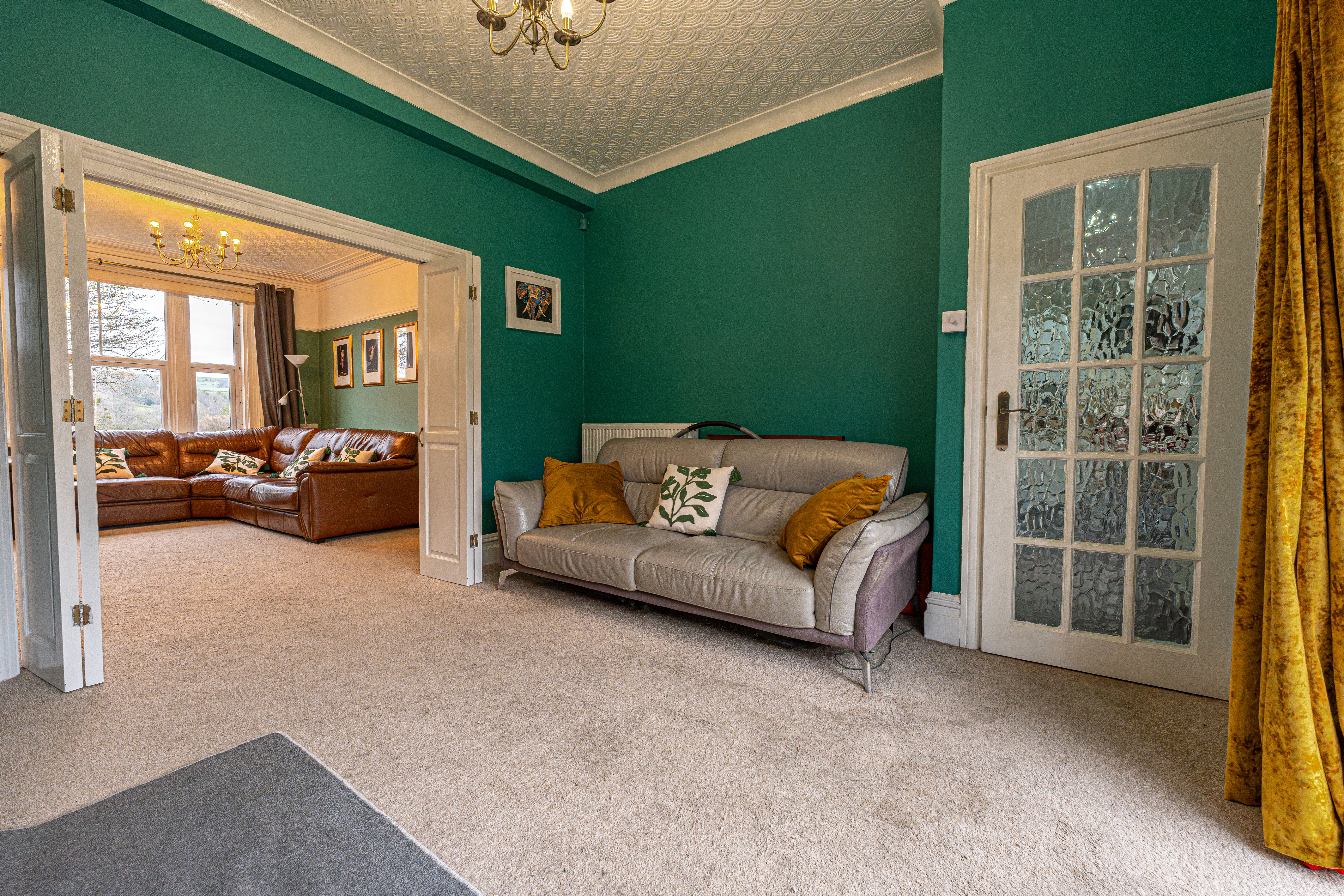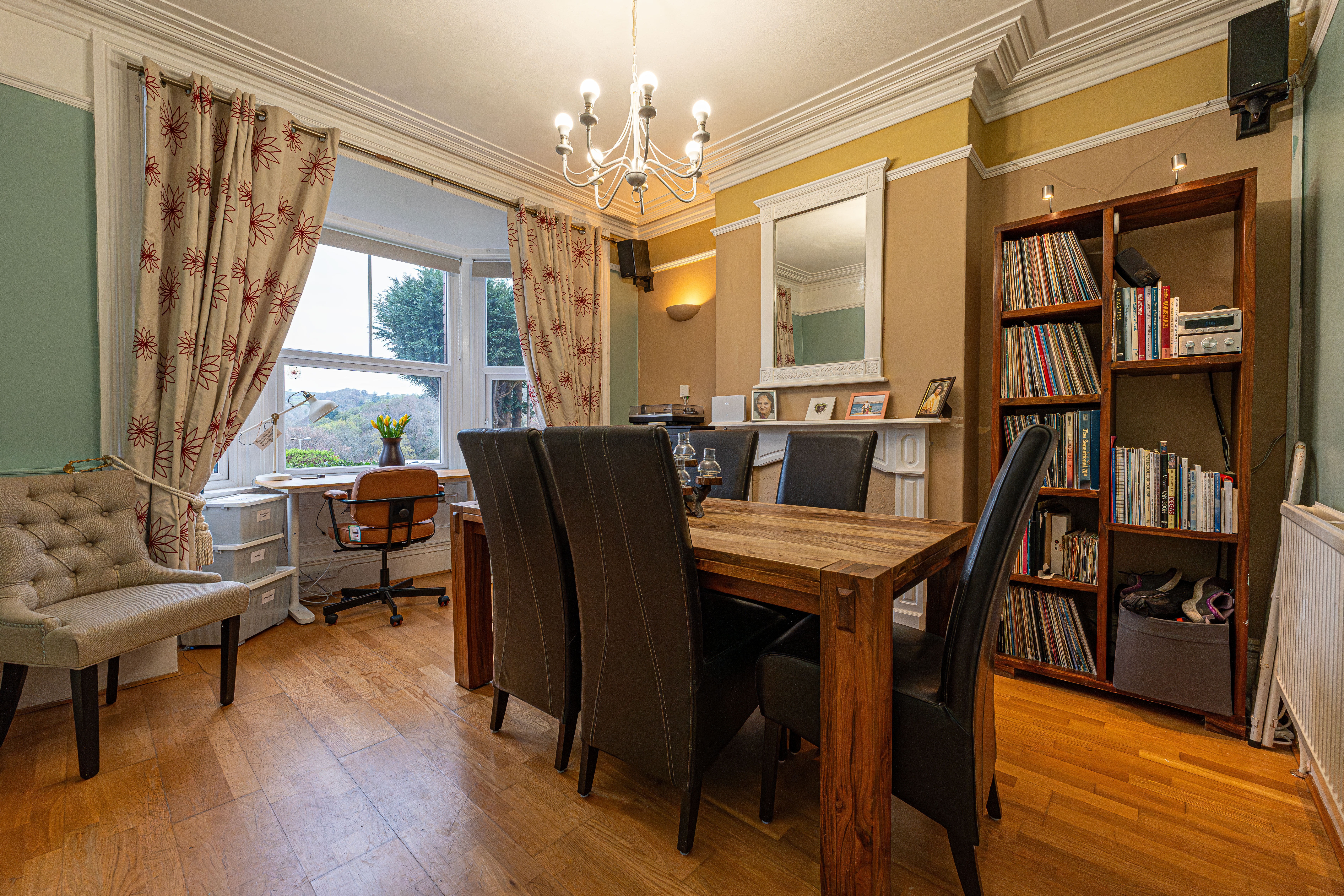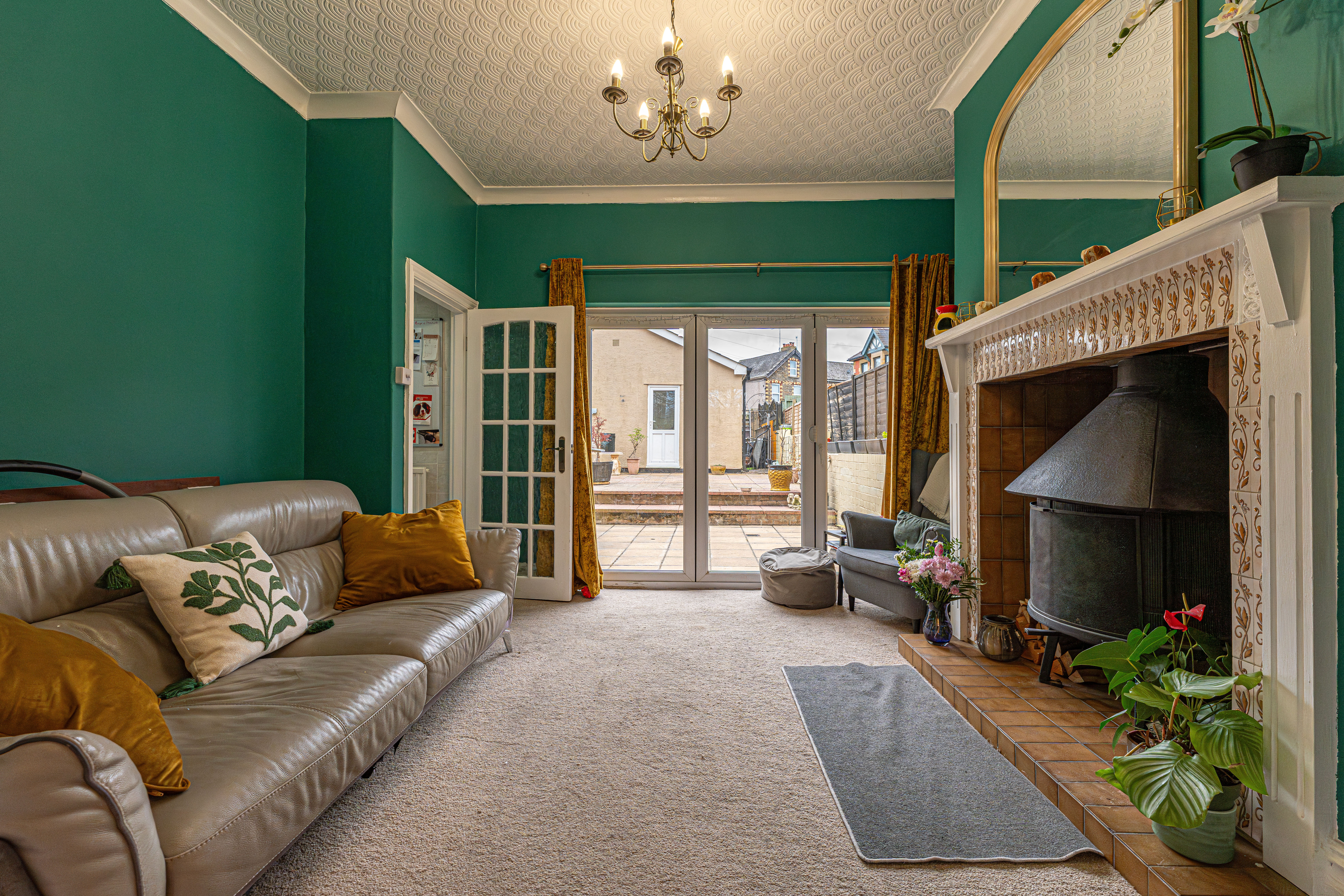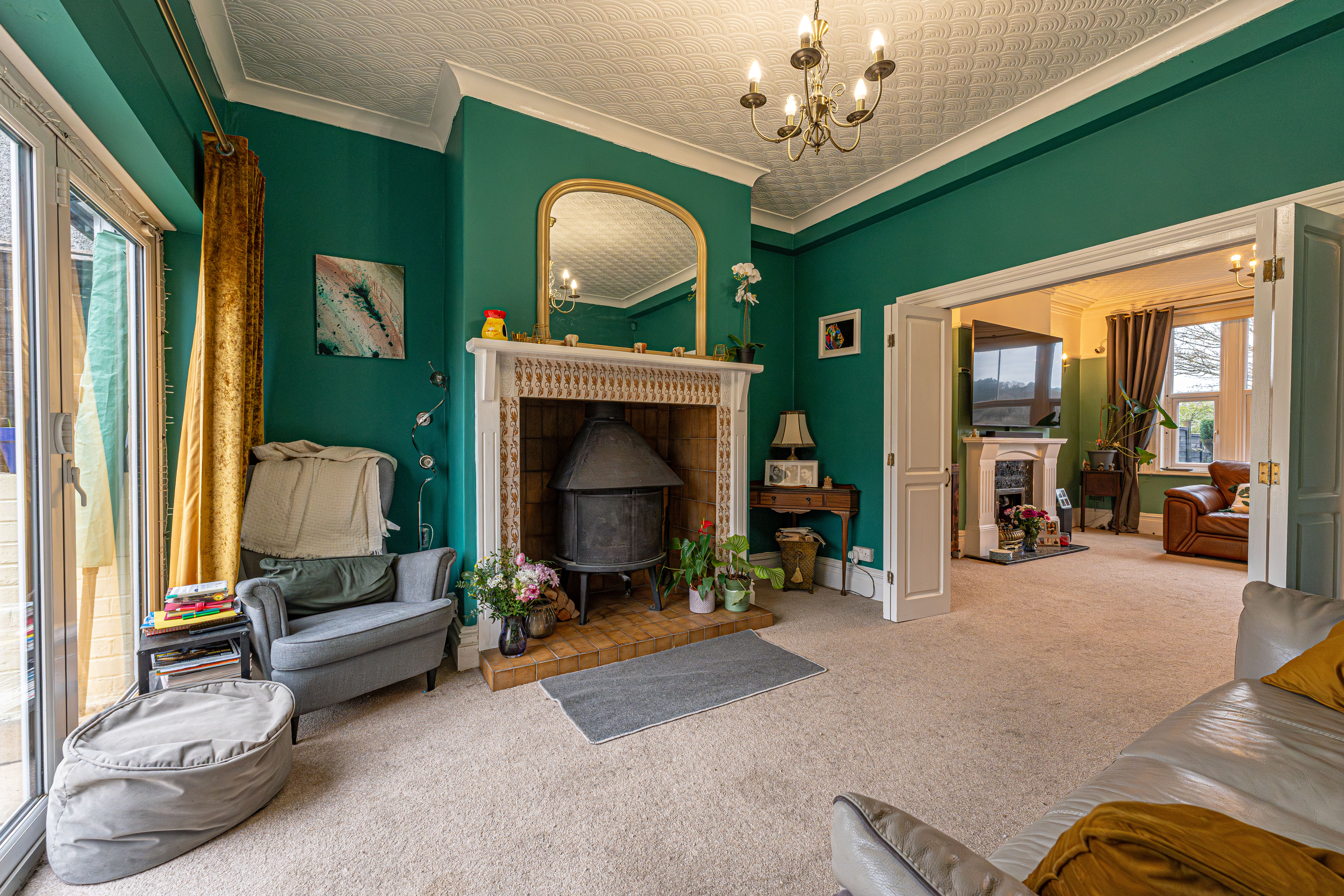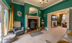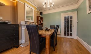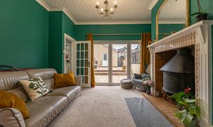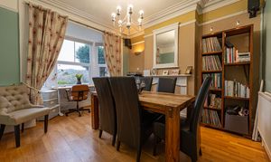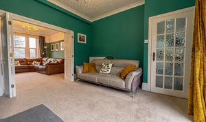 This beautifully presented family home welcomes us with an abundance of family living space, with multiple reception rooms on the ground floor, as well as a stunning blend of period charm and contemporary decor. At the heart of the home is a dual-aspect living area, presented with charming fireplaces and a flood of natural light, highlighting an impressive space for relaxing and entertaining guests. The two rooms can be easily partitioned by convenient folding doors, with the rear facing sitting room benefitting from bi-fold doors that seamlessly open out to the garden. The kitchen is positioned at the rear of the house and also provides access into the garden, as well as a variety of fitted storage options and ample space for appliances to join the fitted oven and gas hob. The kitchen also features a breakfast bar for an easy dining option, whilst another reception room can be found at the front of the house, providing a formal dining room lit up by bay-fronted windows, which could also work well as an office nook. From the ground floor we can also find a W.C from the entrance hallway, with the vibrant design continuing up into the first floor.