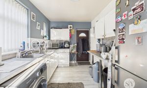 Laminate flooring, fitted base and wall units with contrasting work top, upvc double glazed window x2, tiled splashback, sink and drainer, boiler, space for washing machine, space for cooker, space for fridge freezer