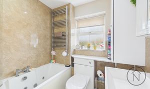 The bathroom is fitted with a spa bath with shower over, vanity wash hand basin, and low-level W.C.