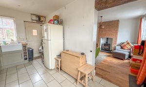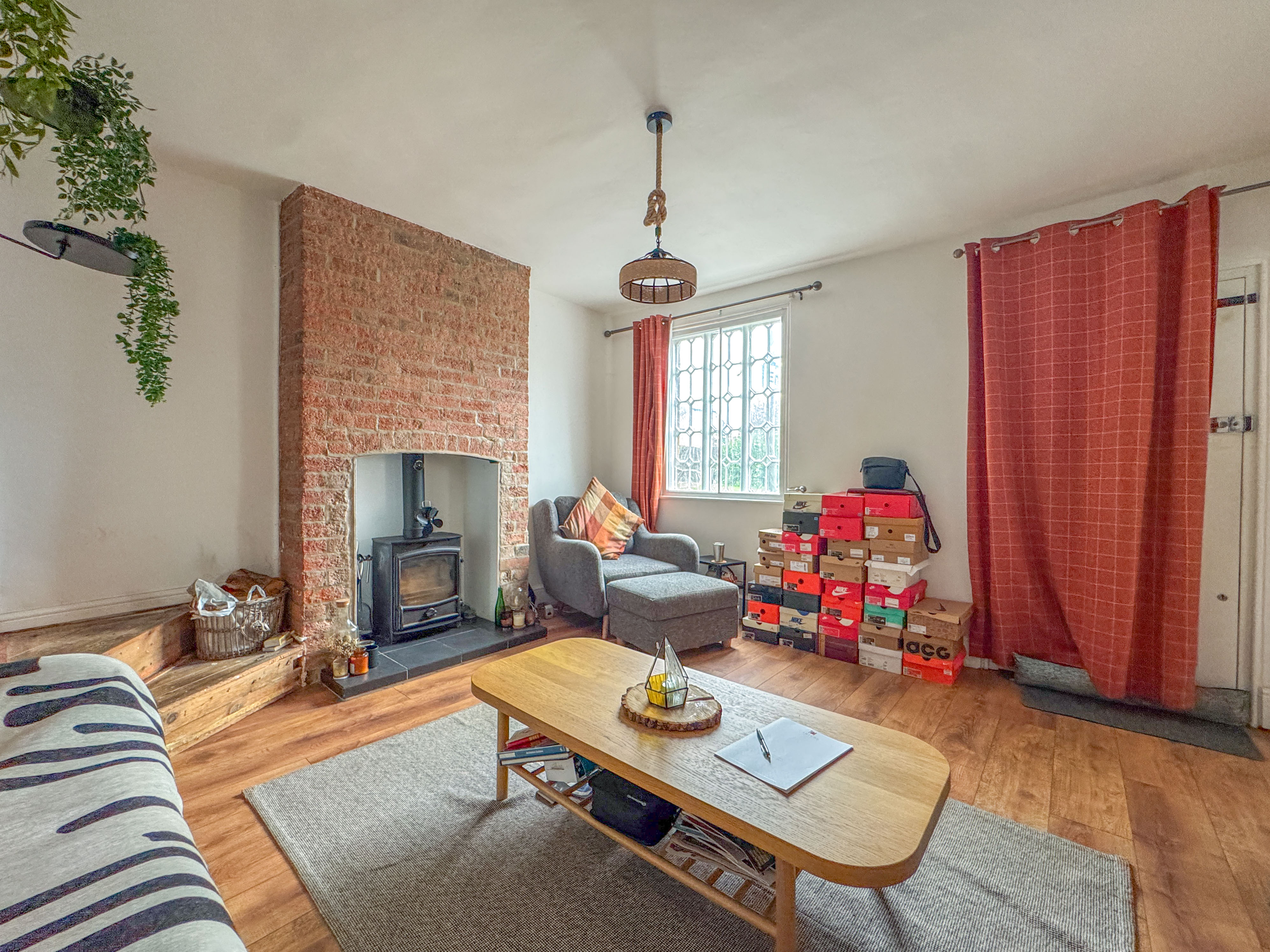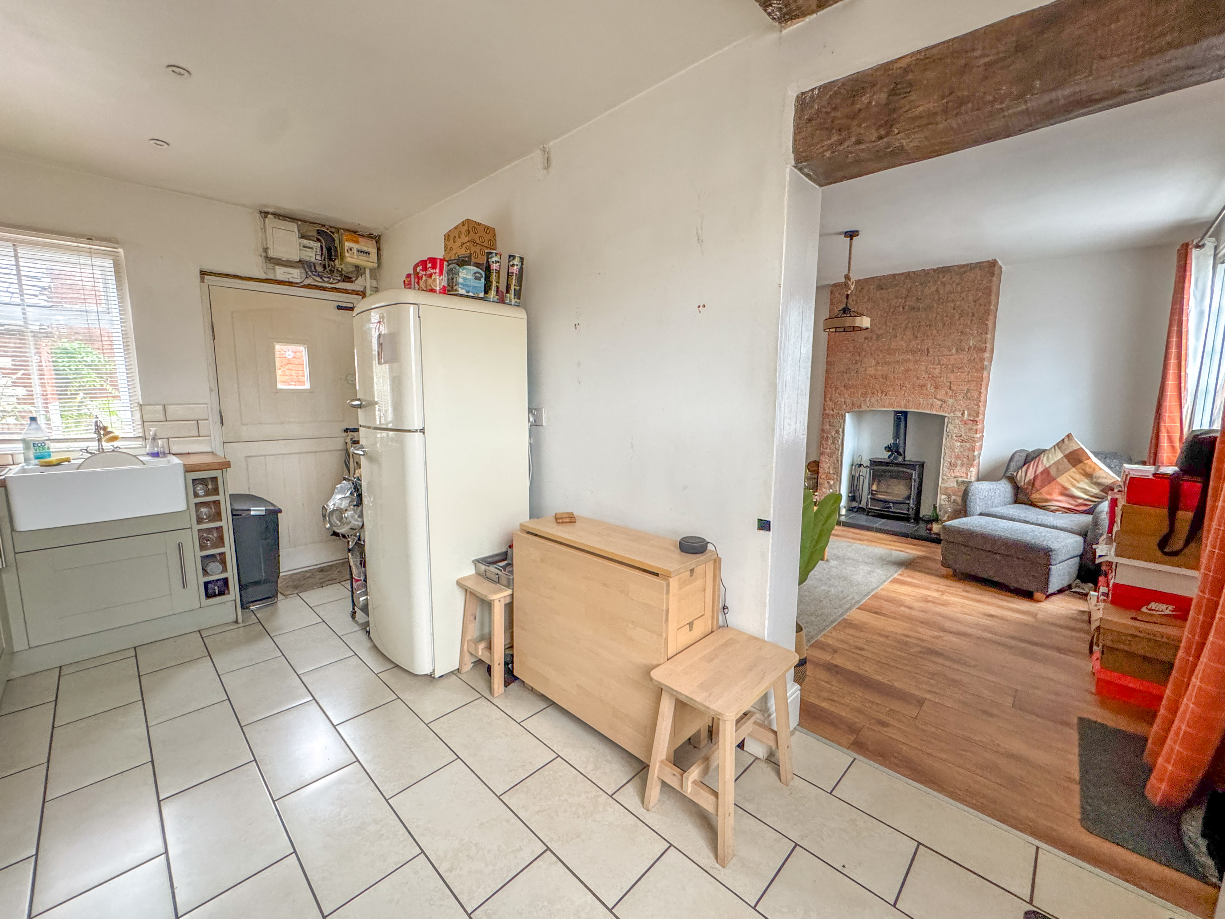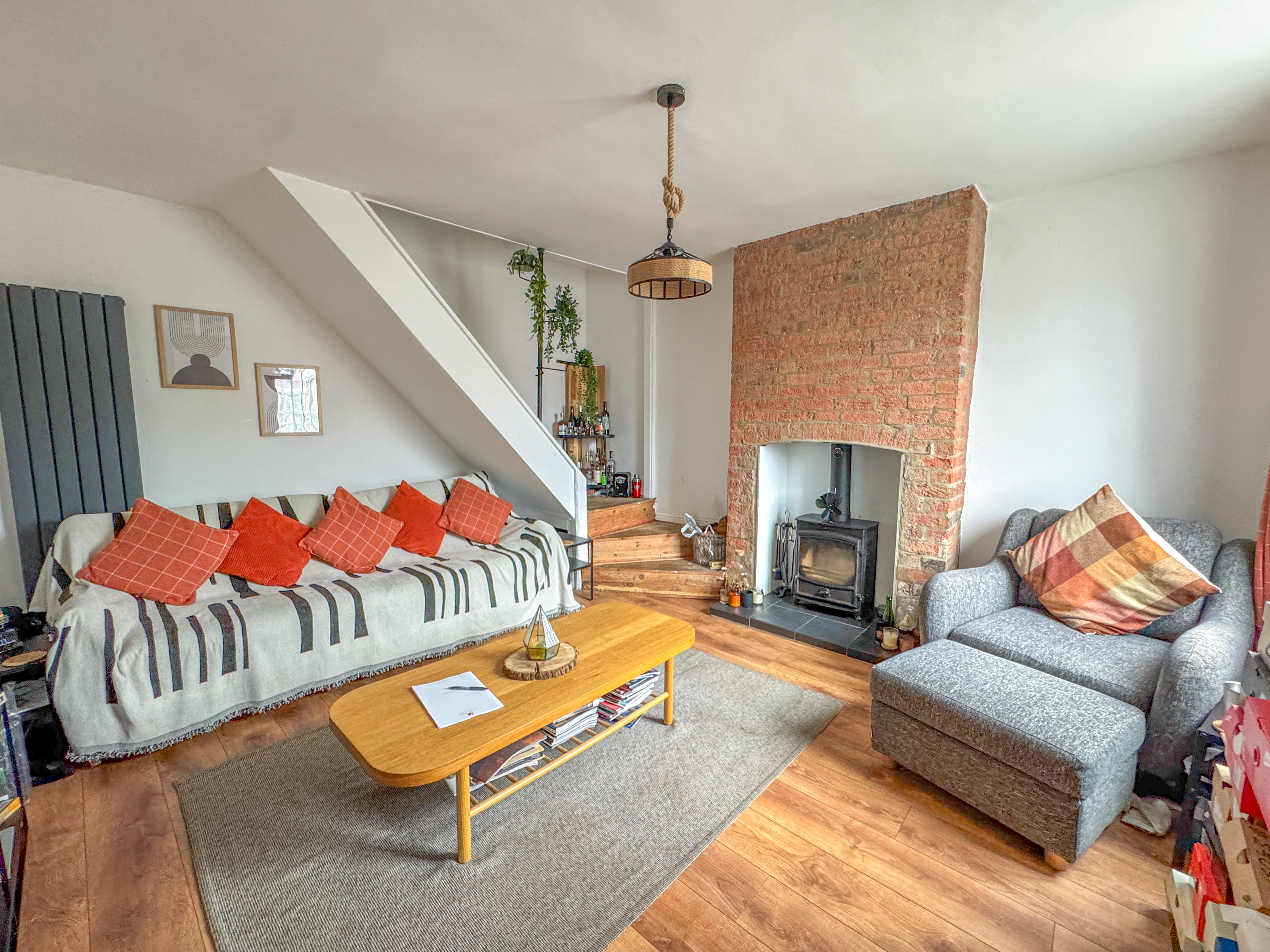 As you step inside, you’re greeted by a warm and inviting sitting room, where natural light pours in through the front window and a feature brick fireplace, complete with a cosy log-burning stove, sets the tone for the property’s characterful interiors. Stairs are situated to the rear providing access to the 1st floor.