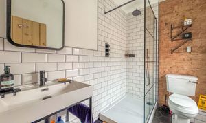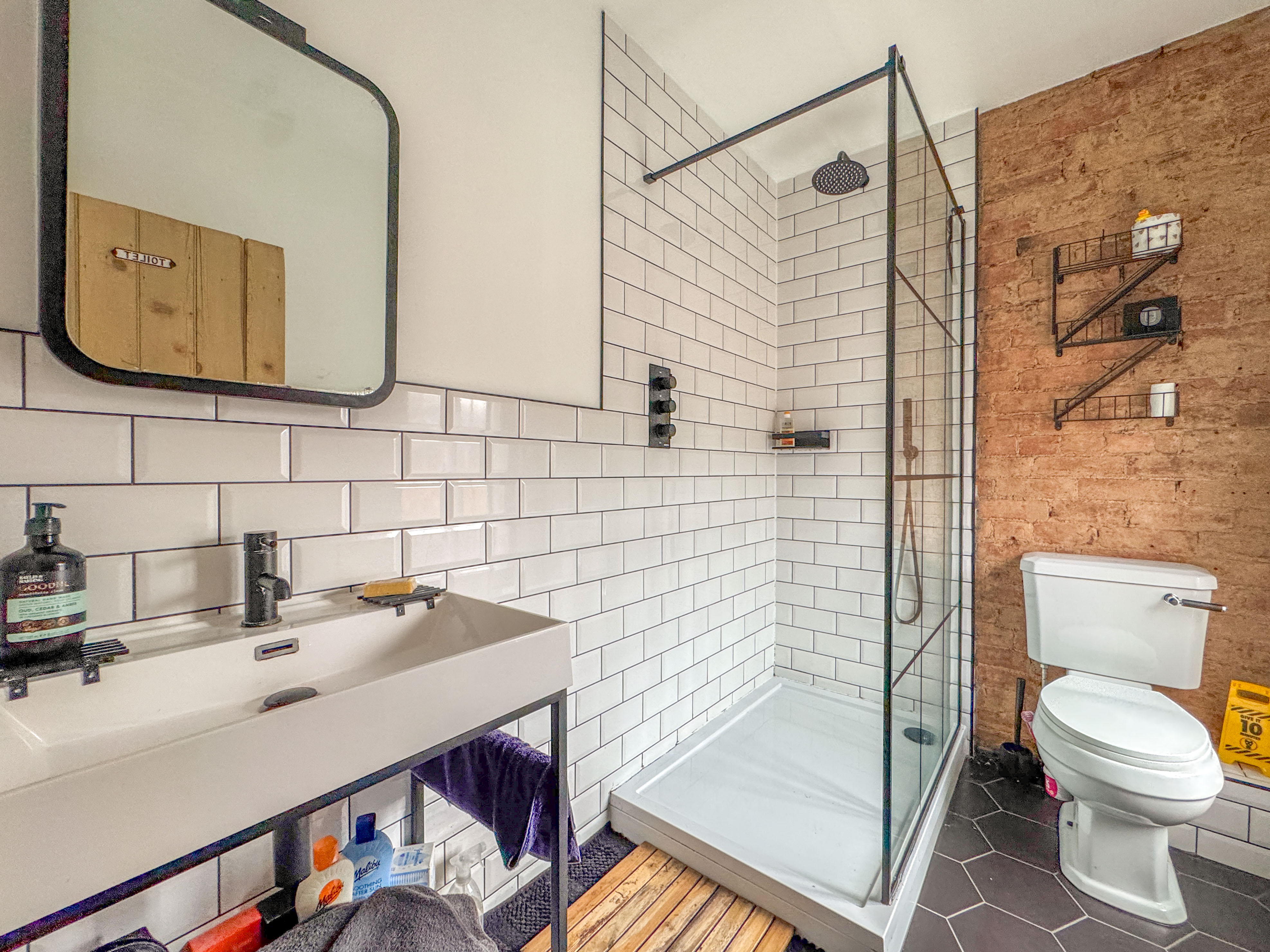 The upstairs shower room has been tastefully refurbished with a mains-powered shower, stylish vanity unit with inset sink, WC, and a rear-facing window. A subtle touch of exposed brickwork gives a nod to the building’s heritage while tying in perfectly with the modern finish.