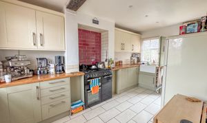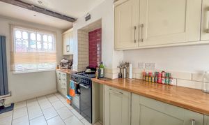 Leading directly from the lounge is a spacious, open-plan kitchen—a clever layout that enhances the sense of space and flow. The kitchen has been refitted with modern-style shaker units, wooden worktops and a traditional Belfast sink positioned beneath a rear-facing window. A stable door opens out onto the courtyard garden, while modern integrated appliances— including a dishwasher, washing machine and fan oven with gas hob and a free standing fridge—combine practicality with style. Space and plumbing are provided for a washing machine, and the tiled flooring adds a smart, durable finish.