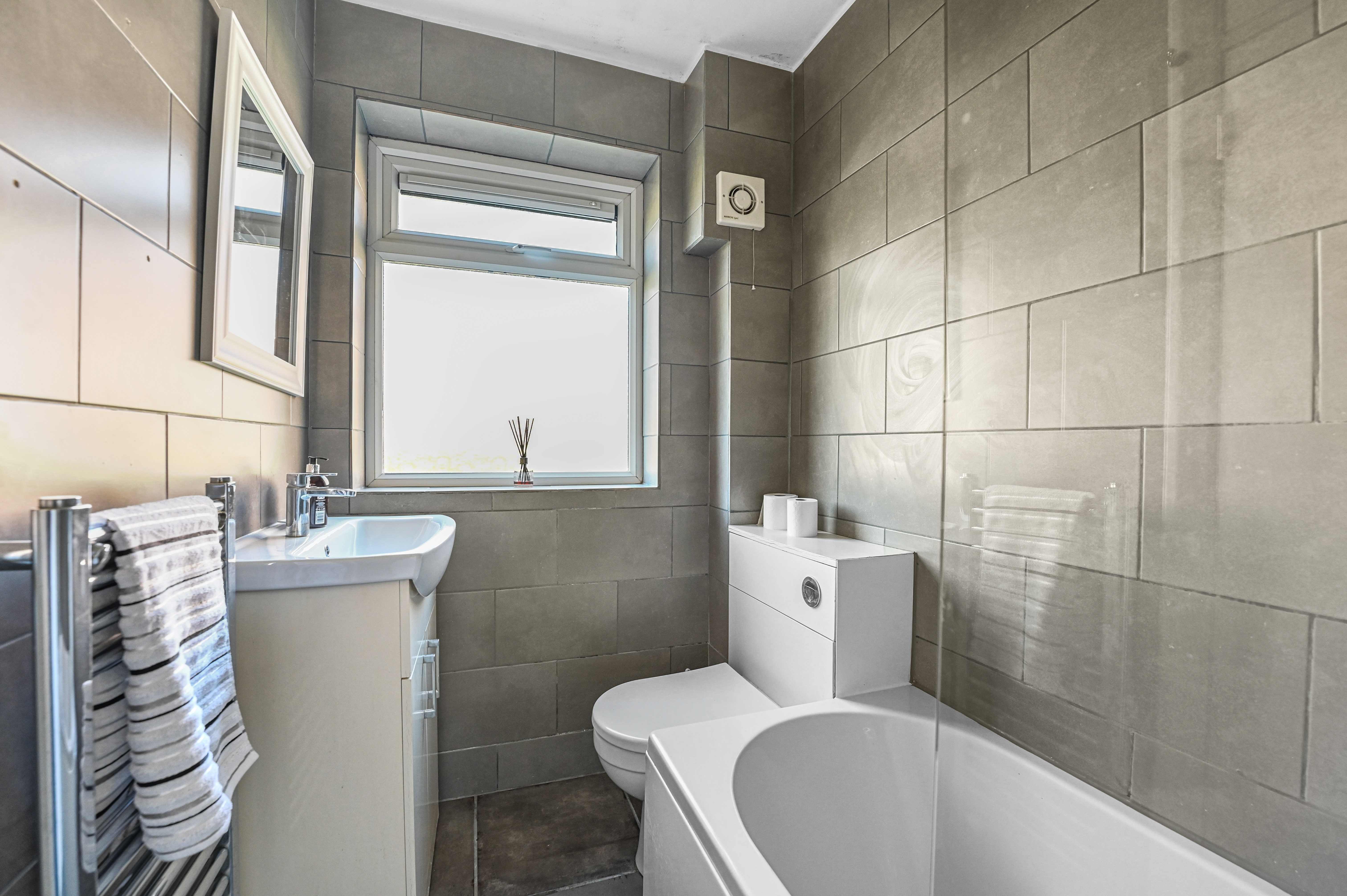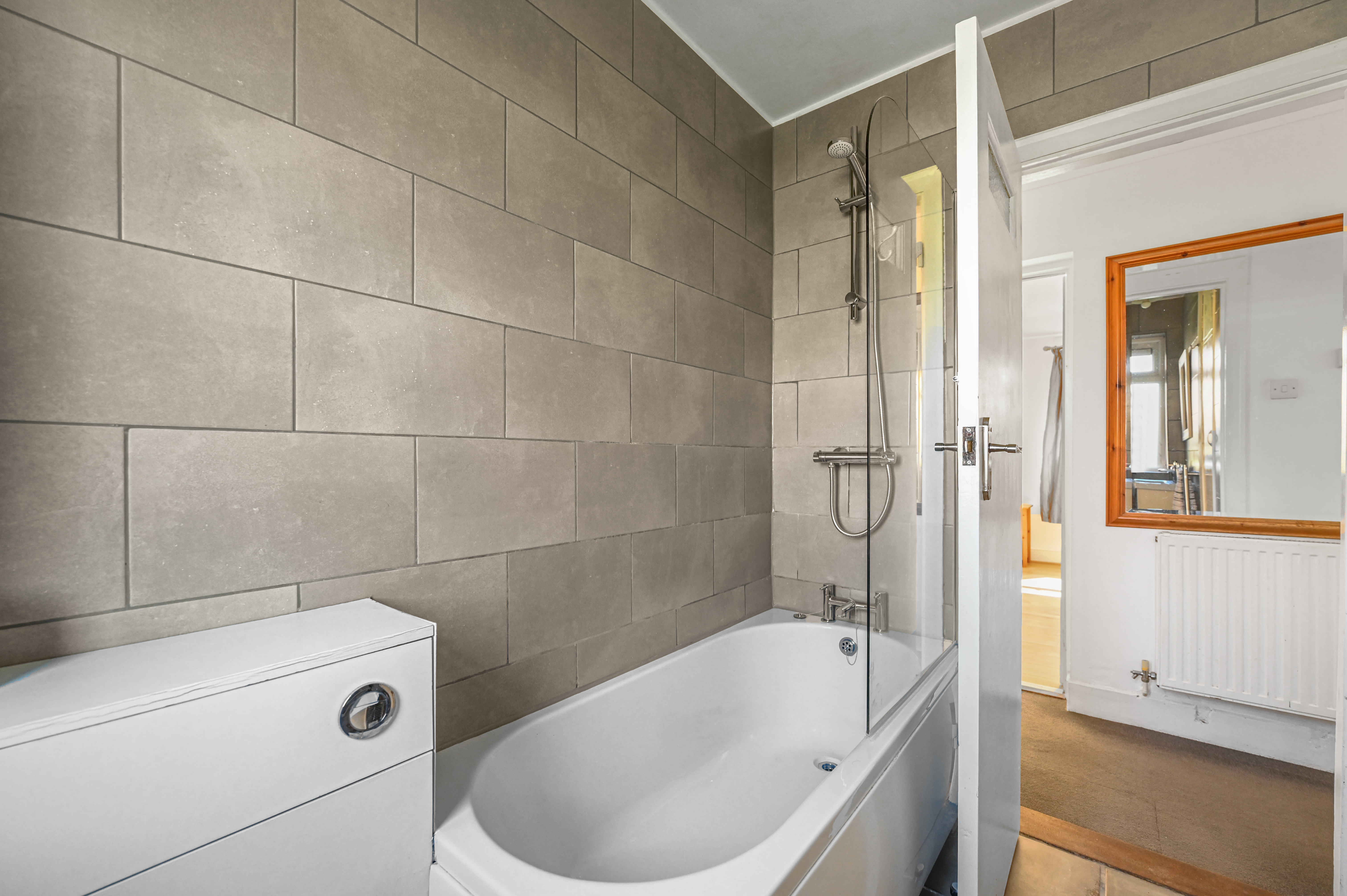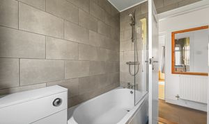 The family bathroom features a three-piece white suite including panel enclosed bath with glass screen and wall mounted shower attachment, low level WC and vanity wash hand basin. There is also a storage cupboard including boiler.